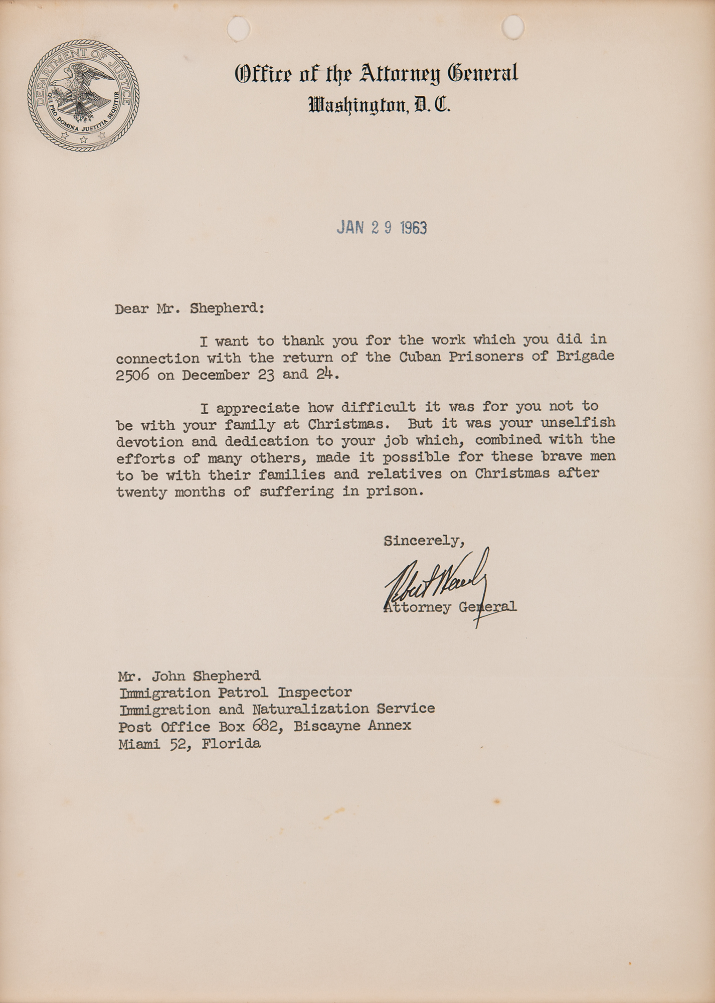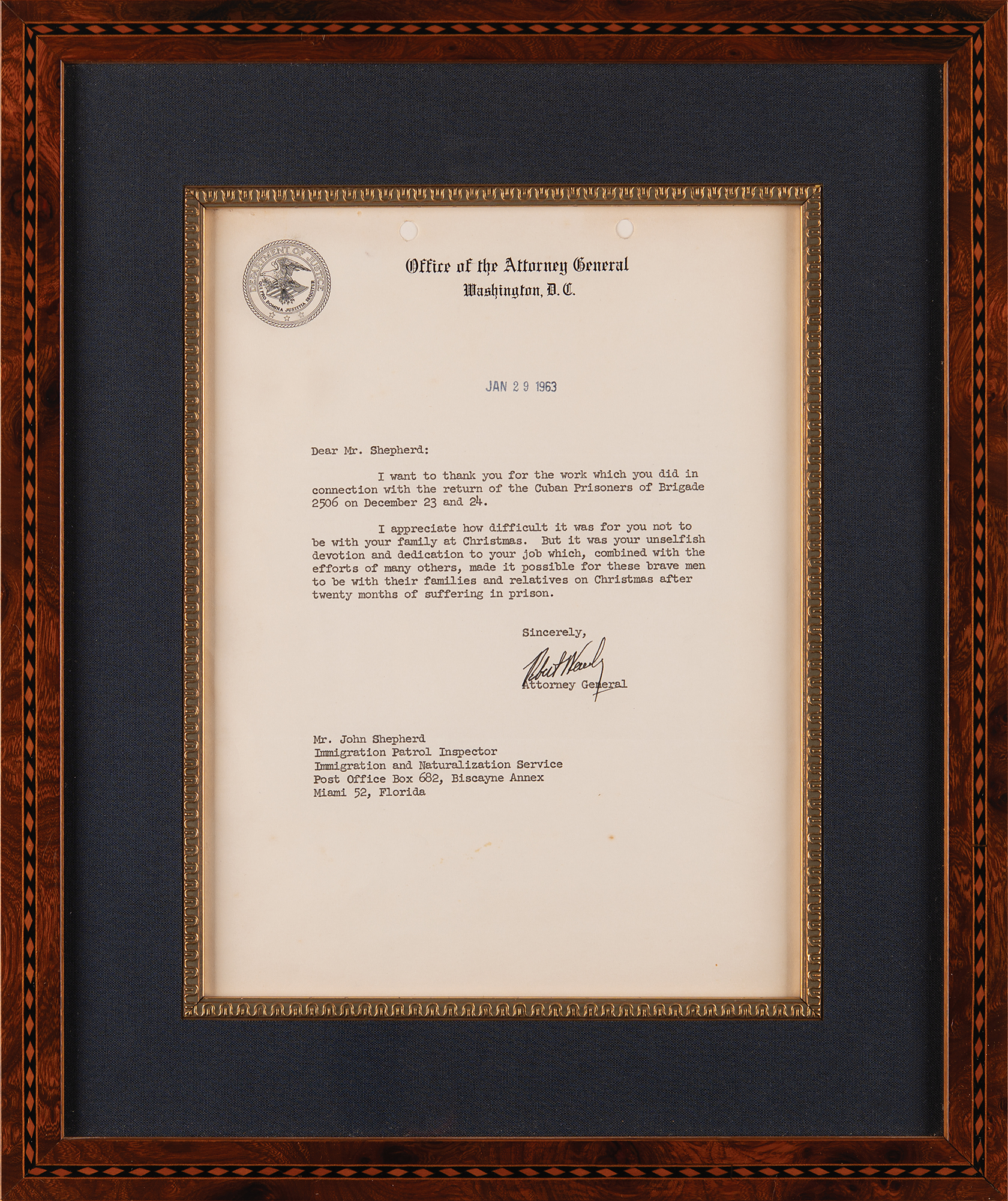 TLS signed “Robert Kennedy,” one page, 7.5 x 10, Office of the Attorney General letterhead, January 29, 1963. Letter to John Shepherd of the Immigration and Naturalization Service, in full: “I want to thank you for the work which you did in connection with the return of the Cuban Prisoners of Brigade 2506 on December 23 and 24. I appreciate how difficult it was for you not to be with your family at Christmas. But it was your unselfish devotion and dedication to your job which, combined with the efforts of many others, made it possible for these brave men to be with their families and relatives on Christmas after twenty months of suffering in prison.” Handsomely matted and framed to an overall size of 12.75 x 15.25. In fine condition. Accompanied by the original mailing envelope.