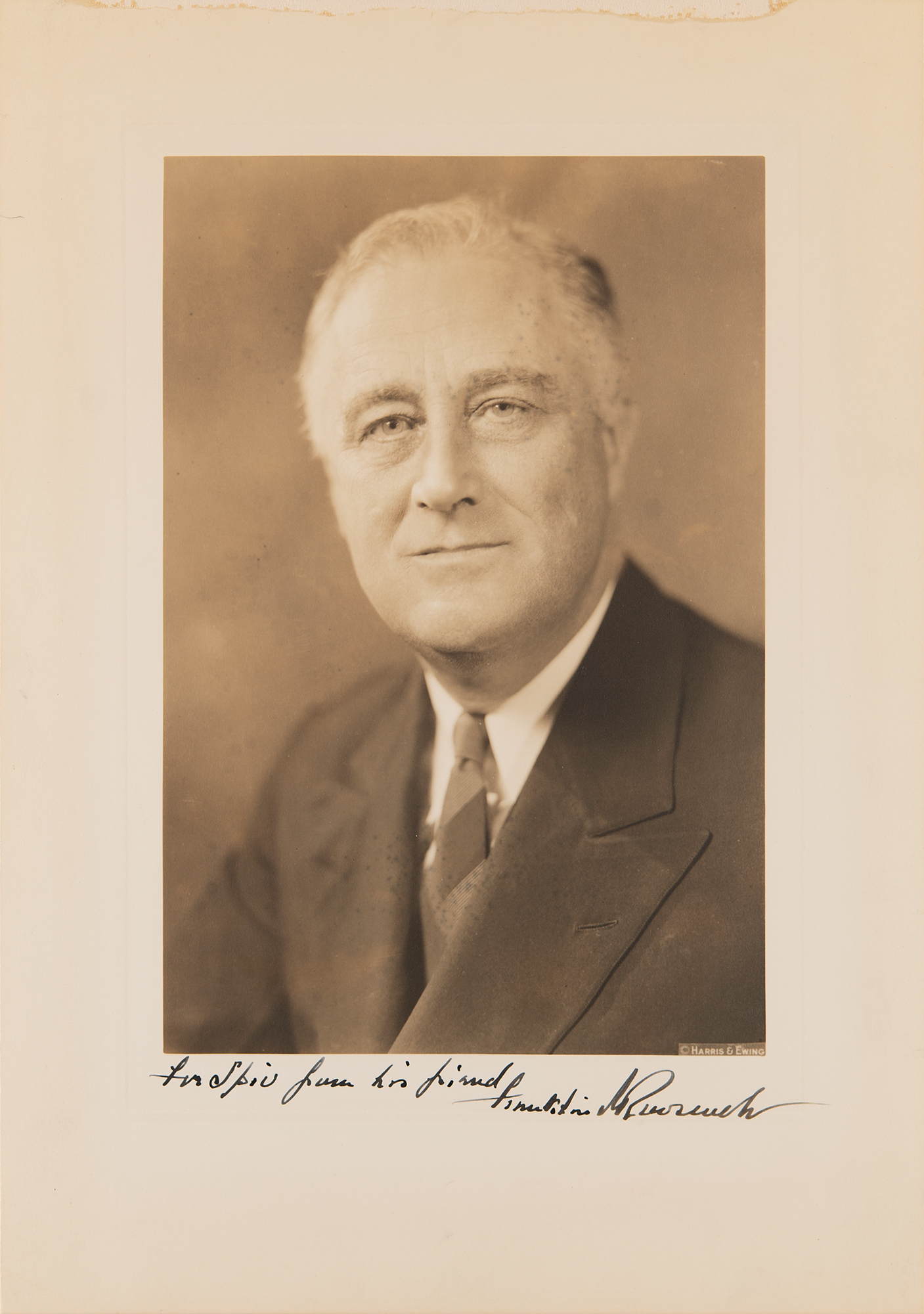 Vintage matte-finish 9.25 x 13.25 portrait photo of Roosevelt by Harris & Ewing, signed and inscribed in the lower border in fountain pen, "For Spiv, from his friend, Franklin D. Roosevelt.” In fine condition, with some old mounting residue along the top edge, easily matted out if desired.