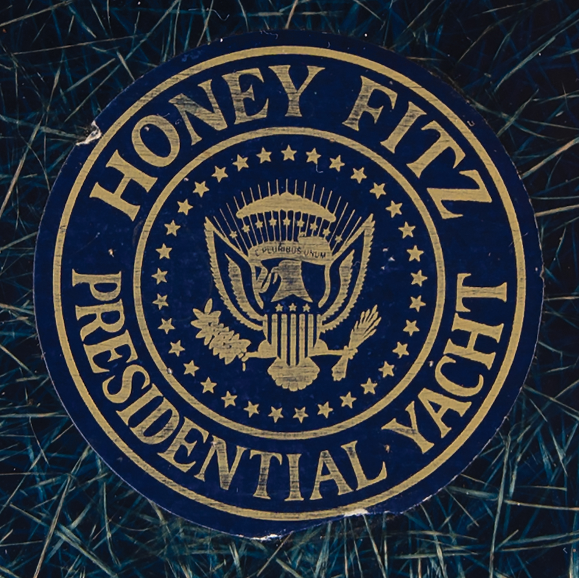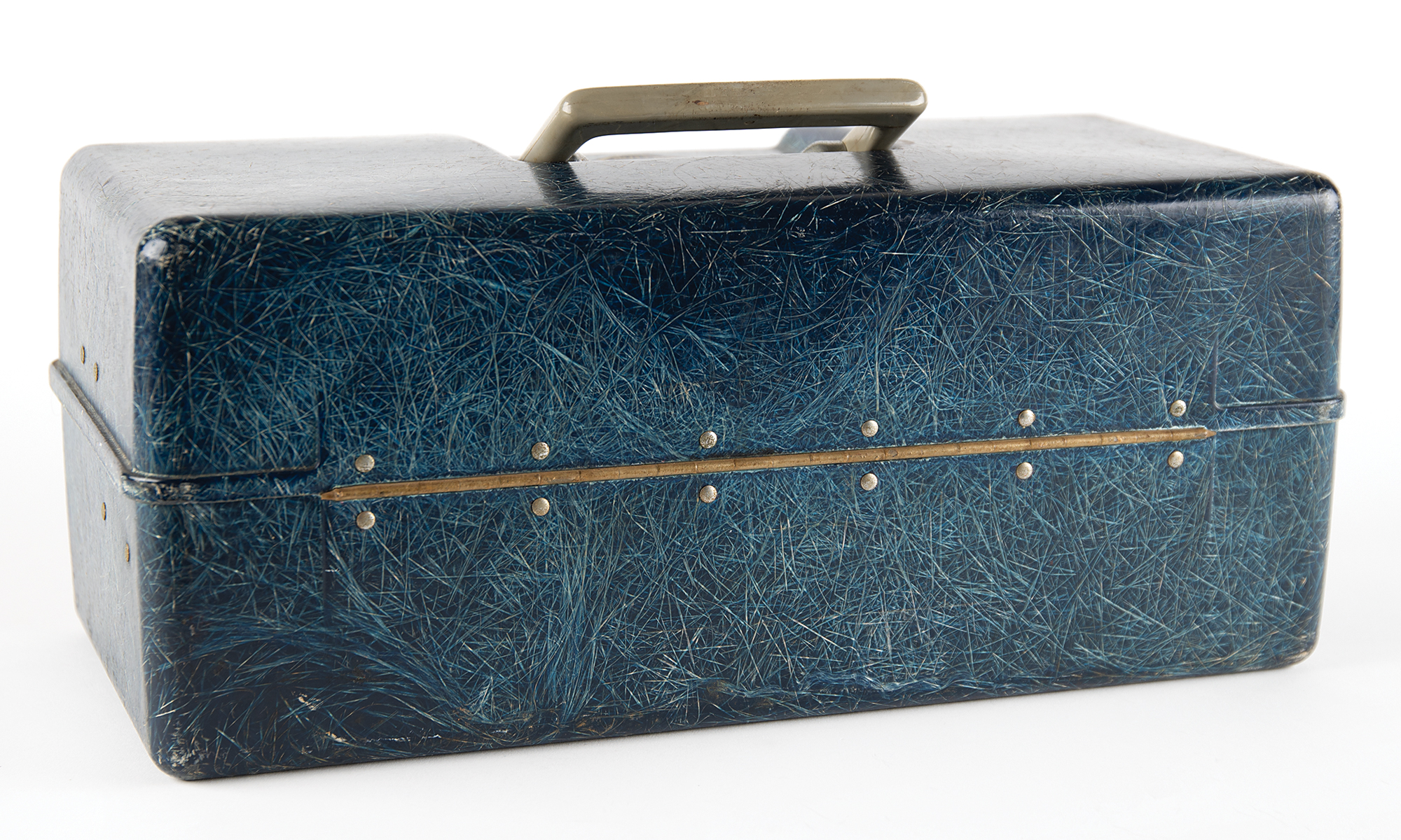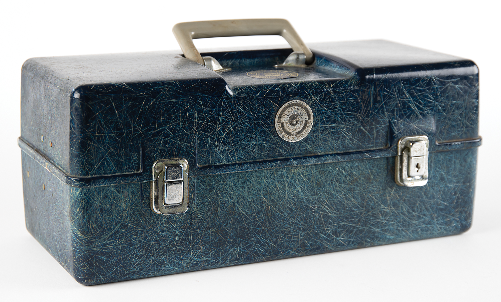Vintage Ocean City blue fiberglass tackle box attributed to the Honey Fitz presidential yacht, measuring 16˝ x 7˝ x 7.5˝, with a "Honey Fitz Presidential Yacht" decal affixed to the top of the lid. Inside, the three-level fishing box contains eleven lures (including two "South Bend Finn-Oreno" minnows), a Bicco fish scaler, a Blakemore brush gripper, a Shakespeare Spin-Wondereel No. 1730 casting reel, a Langley Fisherman's De-liar Model 228 scale, and a few other fishing trinkets. In very good to fine condition, with wear from use and an overall musty odor.