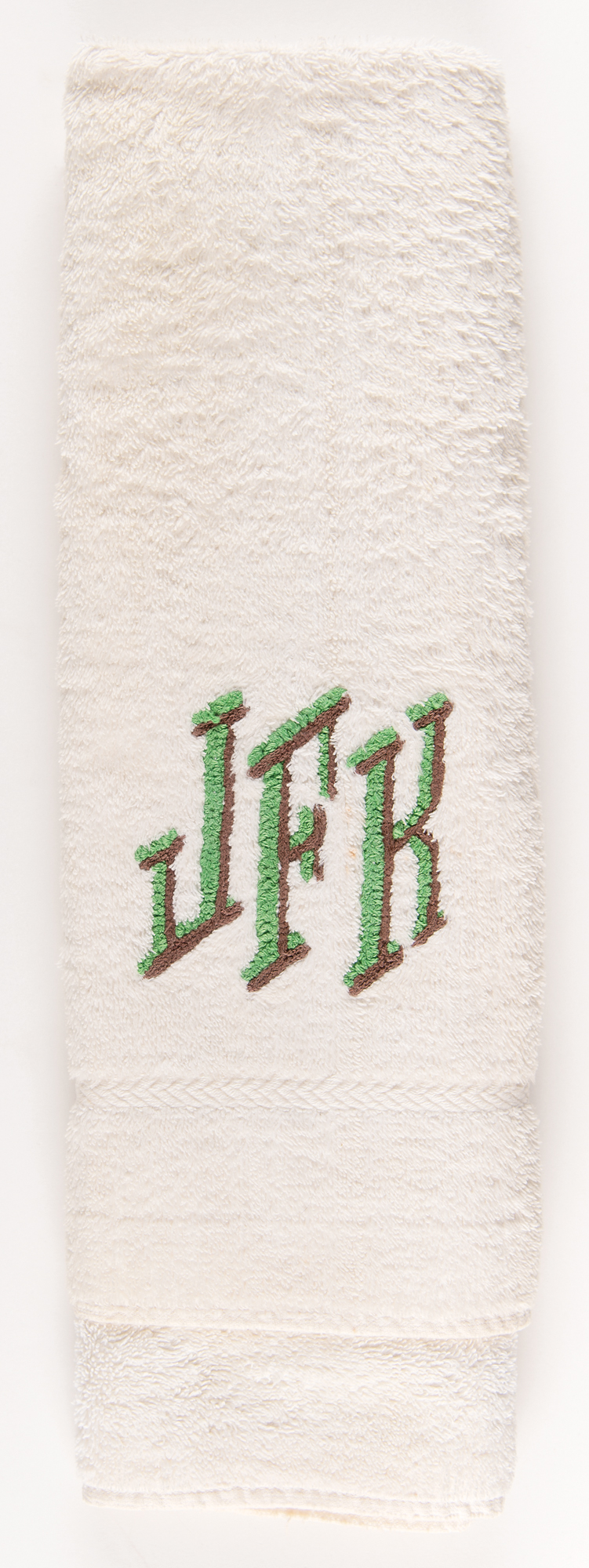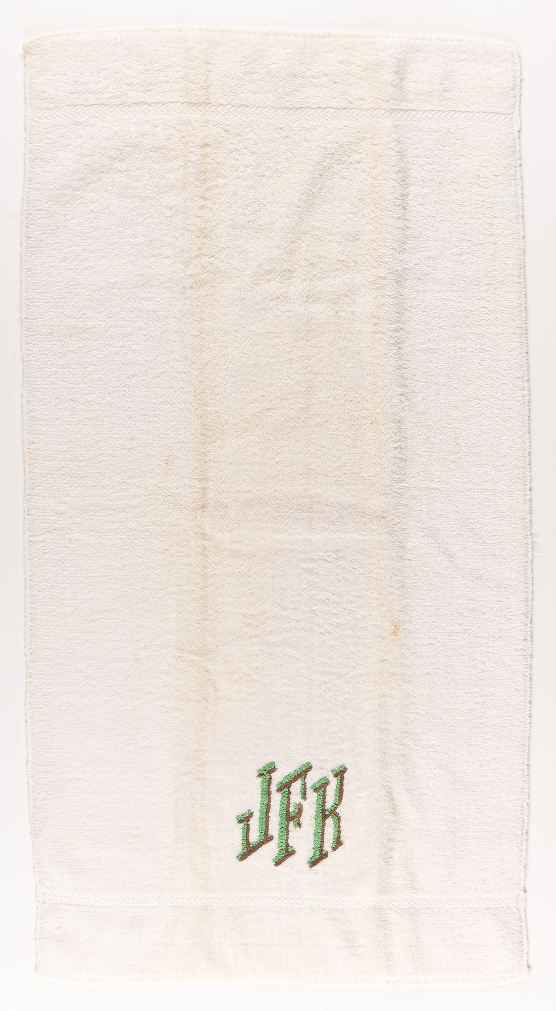 John F. Kennedy's personally-owned and -used white terrycloth hand towel, measuring 15˝ x 30˝, finely embroidered with the president's large monogram in green and brown thread: "JFK." In very good to fine condition, with some scattered staining.