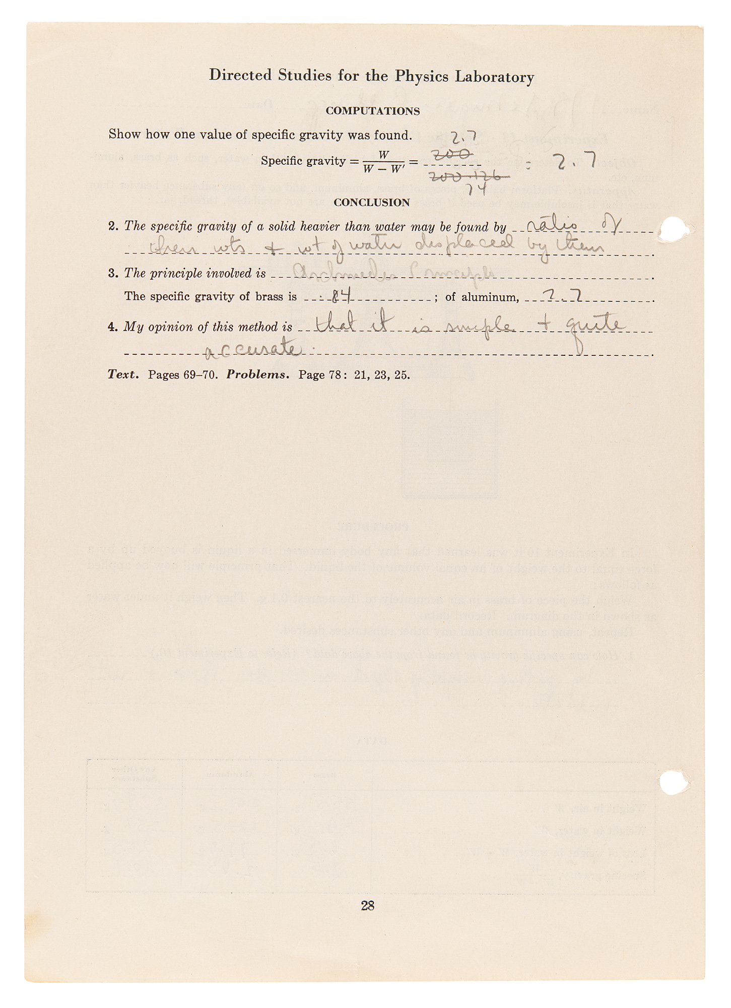 Choate physics laboratory worksheet filled out by Kennedy and signed in pencil at the top, "John F. Kennedy," one page both sides, 7.25 x 10.25, no date but circa 1935. Kennedy answers twelve questions for a laboratory experiment involving a lead-acid battery, recording his observations: at the conclusion of the experiment an electric "bell rings," showing that the battery had "electrical energy stored up." Additionally includes a similar physics lab worksheet filled out and signed by Kennedy's Choate roommate and lifelong best friend Lem Billings, "K. LeMoyne Billings," answering four questions about an experiment to determine the specific gravity of bodies heavier than water. In overall fine condition.