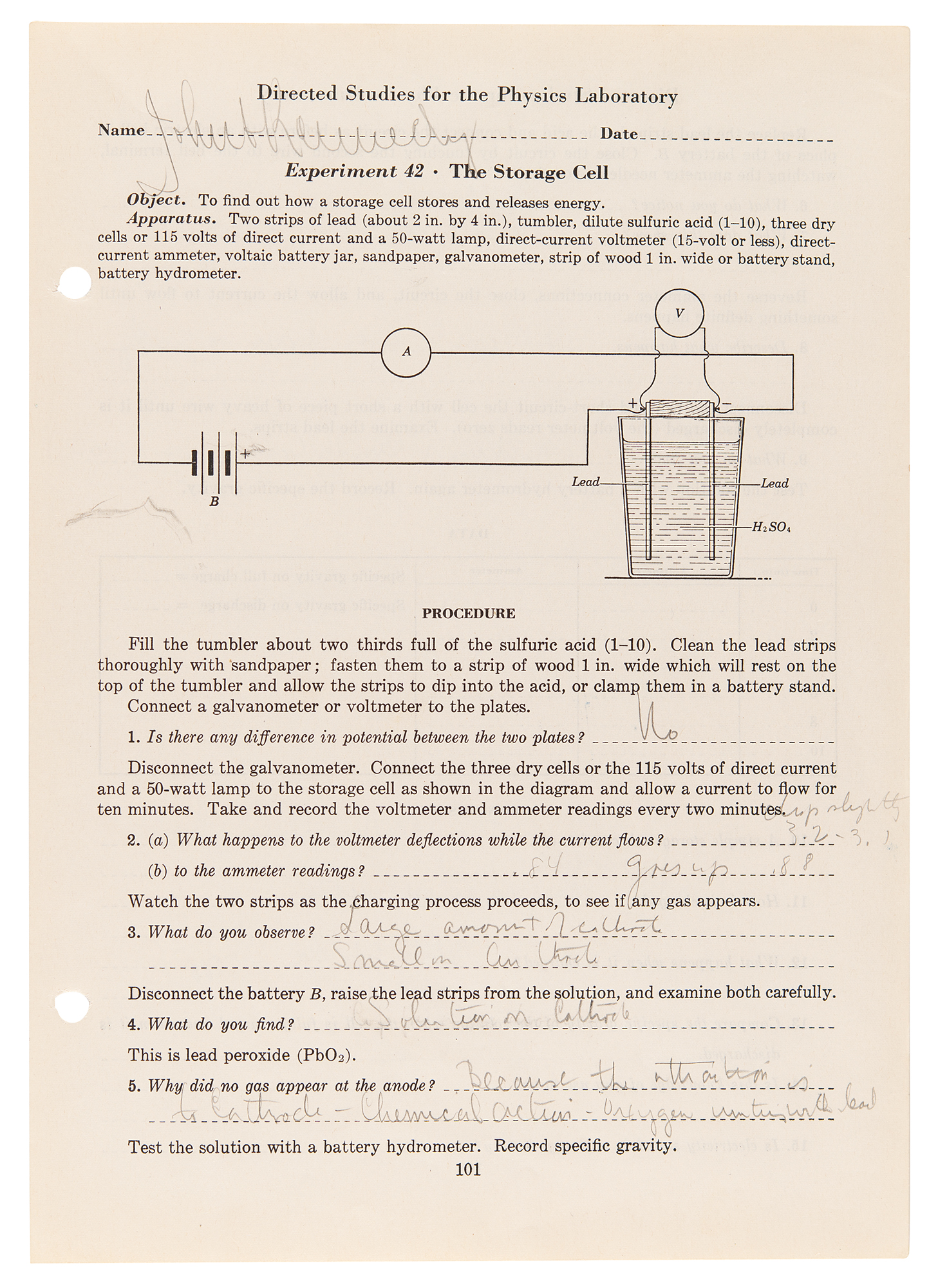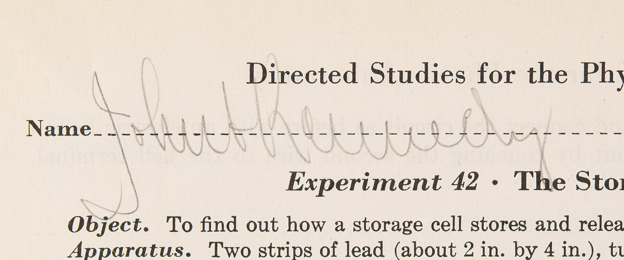Choate physics laboratory worksheet filled out by Kennedy and signed in pencil at the top, "John F. Kennedy," one page both sides, 7.25 x 10.25, no date but circa 1935. Kennedy answers twelve questions for a laboratory experiment involving a lead-acid battery, recording his observations: at the conclusion of the experiment an electric "bell rings," showing that the battery had "electrical energy stored up." Additionally includes a similar physics lab worksheet filled out and signed by Kennedy's Choate roommate and lifelong best friend Lem Billings, "K. LeMoyne Billings," answering four questions about an experiment to determine the specific gravity of bodies heavier than water. In overall fine condition.