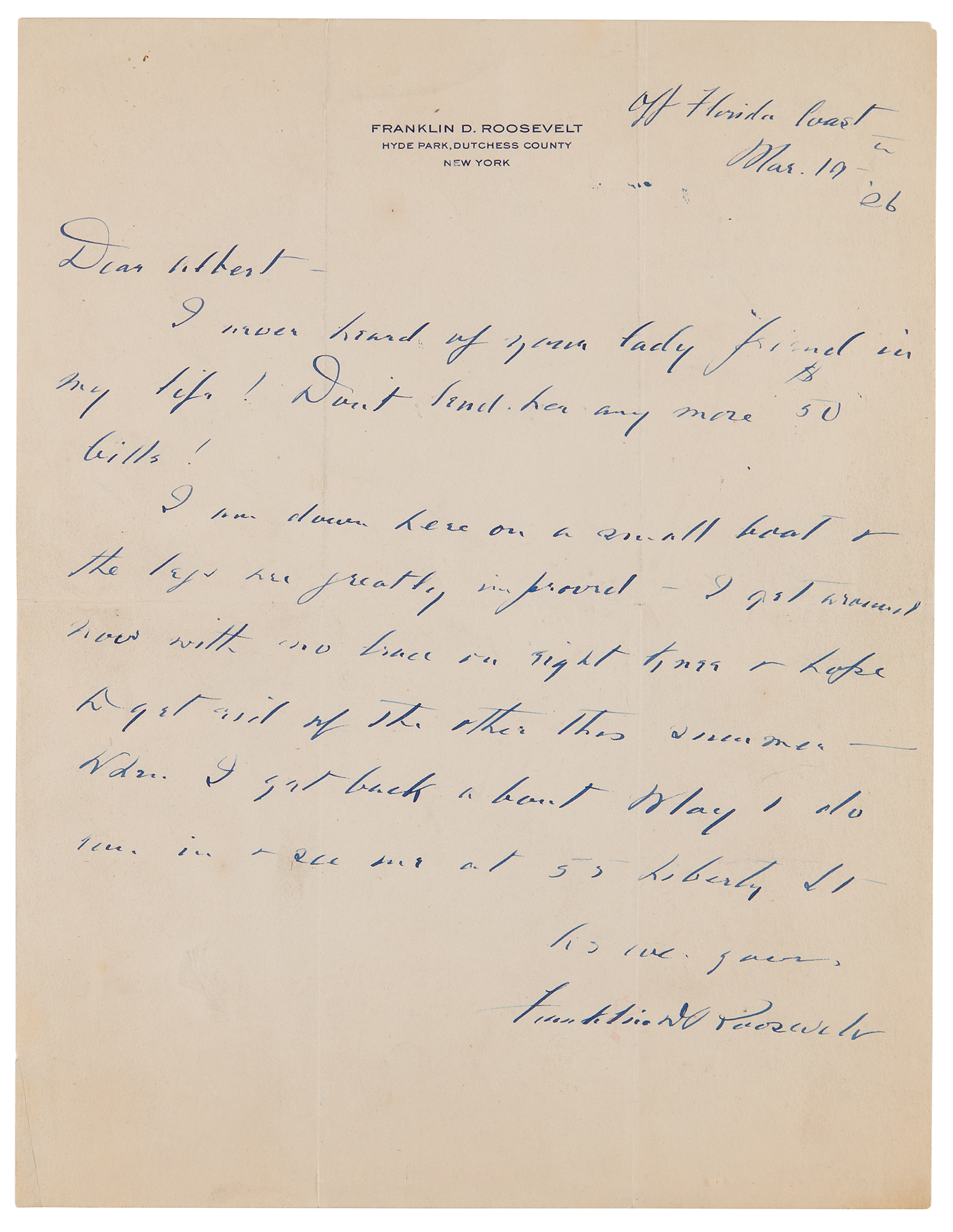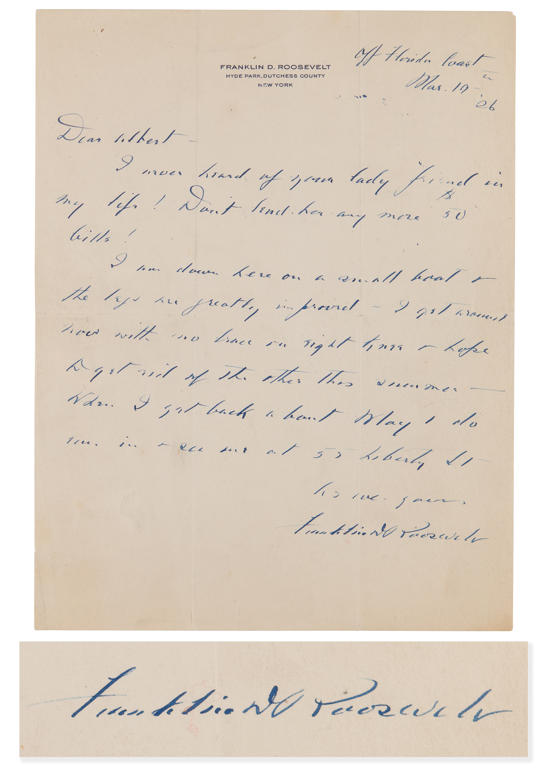 ALS, signed "Franklin D. Roosevelt," one page, 8.5 x 11, personal letterhead, March 19, 1926. Handwritten letter from his houseboat, the Larooco, "Off Florida Coast," sent to his old friend and colleague Albert V. DeRoode, commenting on his condition following his bout with polio. In full: "I never heard of your lady friend in my life! Don't send her any more $50 bills! I am down here on a small boat & the legs are greatly improved. I get around now with no brace on right knee & hope to get rid of the other this summer?When I get back about May 1 do come in & see me at 55 Liberty St." In fine condition.
