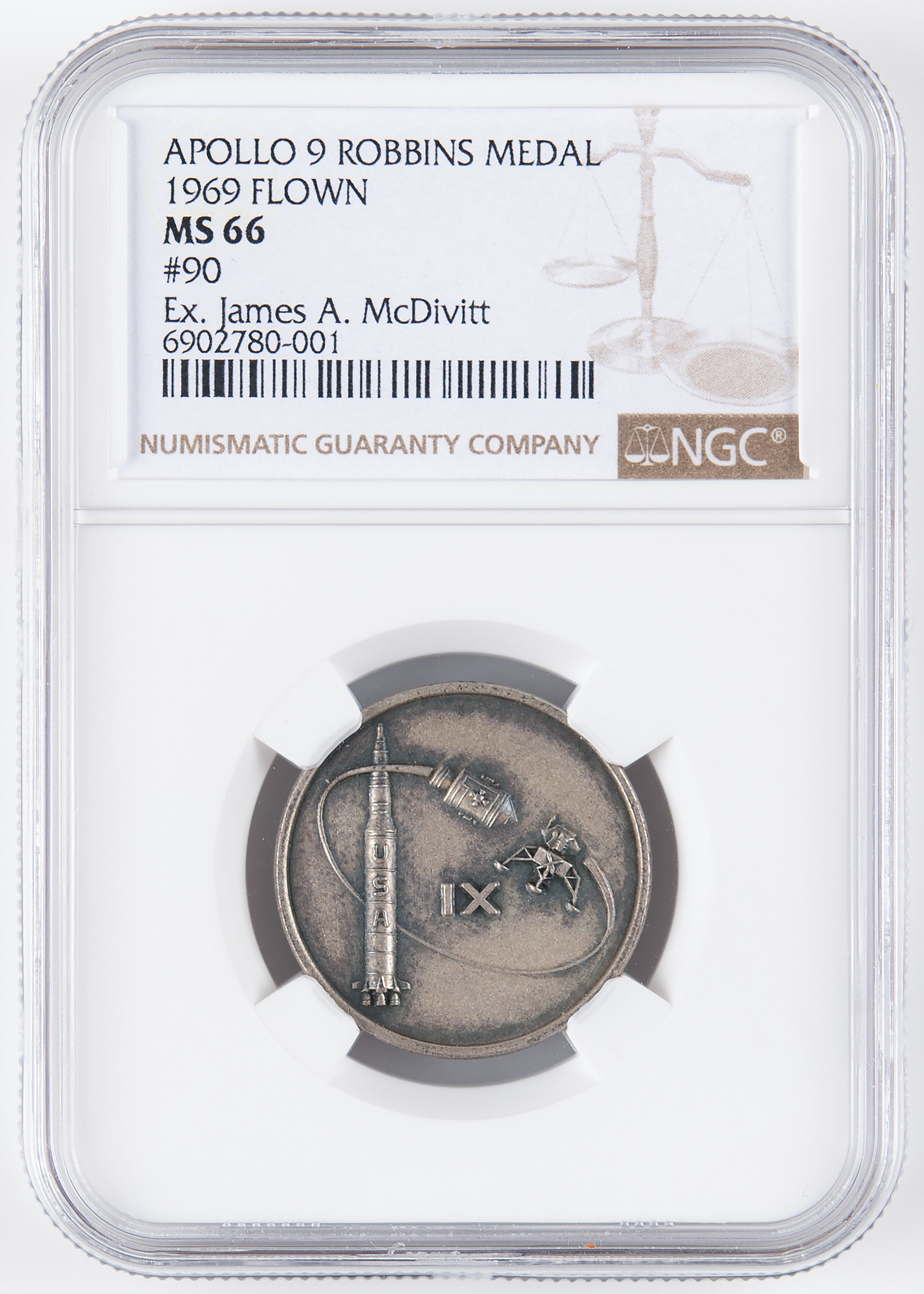 Flown sterling silver Apollo 9 Robbins medallion, approximately 1˝ in diameter, with a raised design of the mission insignia on the face—the orbiting CM and LM with Saturn V launch vehicle, and mission number "IX" at center. The reverse is engraved with the mission dates, "March 3–13, 1969," and encircled by the surnames of the astronauts in raised text: "McDivitt, Scott, Schweickart." The medal is serial numbered "90" and stamped below with the Robbins "Sterling" hallmark. Encapsulated and graded by NGC as "MS 66," with the label noting the provenance, "Ex. James A. McDivitt." Accompanied by its original case and a letter of provenance signed by McDivitt, in part: "This 1˝ diameter, sterling silver Apollo 9 Robbins Medallion was flown in Earth orbit aboard Apollo 9, 3-13 March 1969, and is from my personal collection." McDivitt's letter bears a PSA/DNA authentication label to the lower right corner.