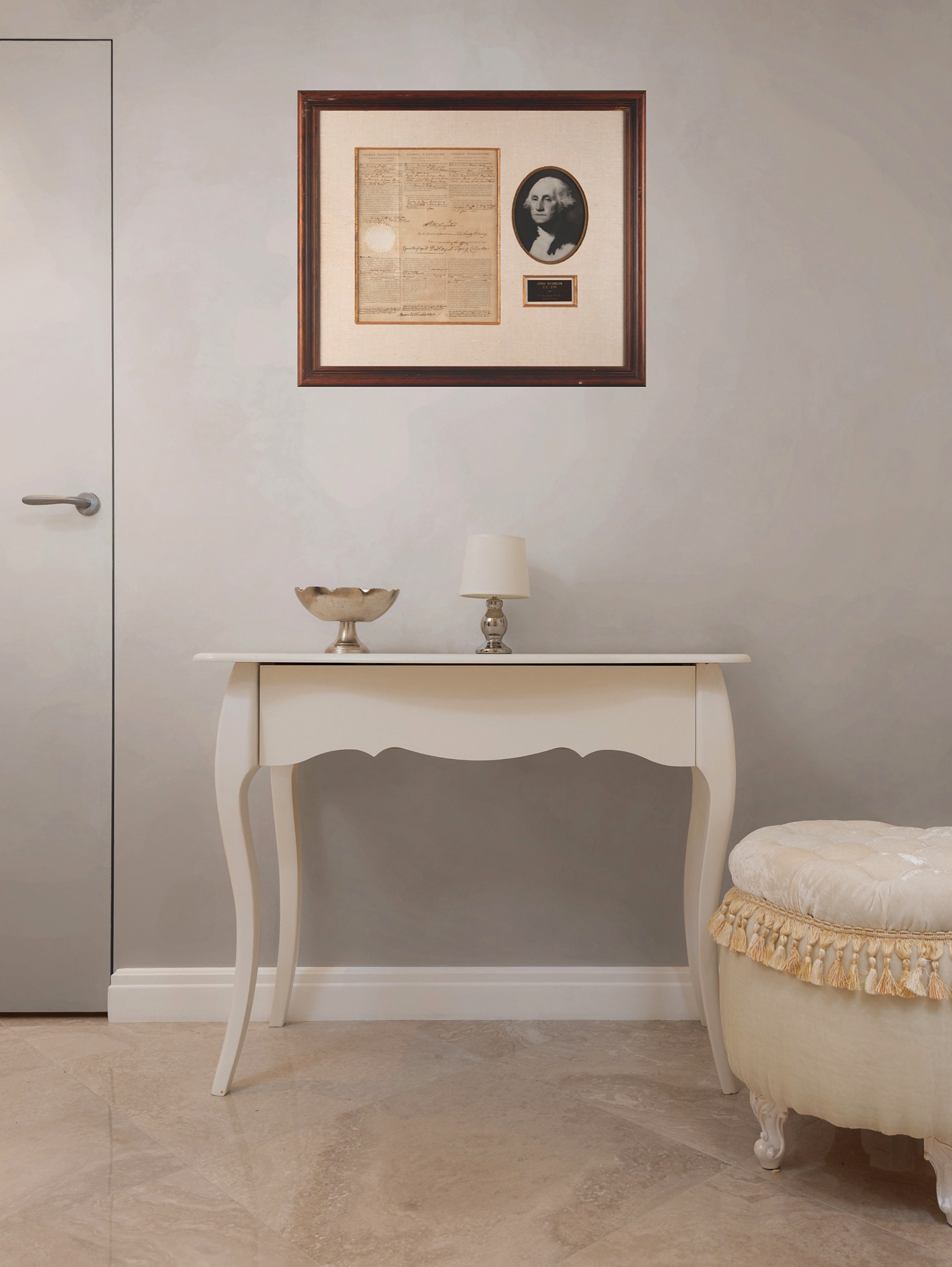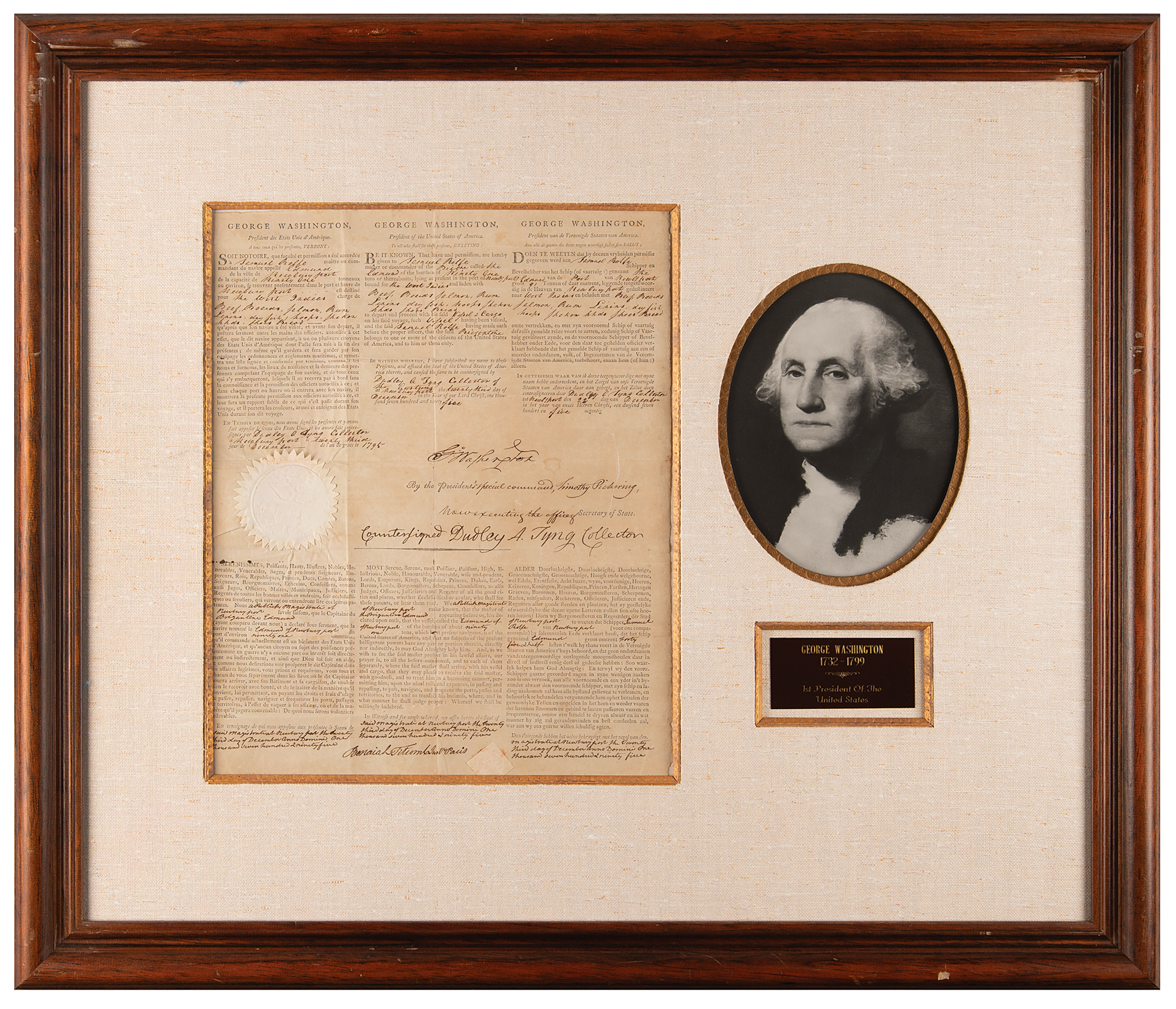 Partly-printed DS as president, signed “Go: Washington,” one page, 12.75 x 15.5, December 23, 1795. Three-language ship's papers issued to "Samuel Rolfe, master or commander of Brig'ne called the Edmund…lying at present in the port of Newb'yport, bound for the West Indies, and laden with Beef, Boards, Salmon, Rum, Linins, Dry fish, hoops…shoes, bread." Boldly signed in the center by President George Washington and countersigned by Secretary of State ad interim Timothy Pickering. The white paper seal affixed to the left side remains intact. Handsomely cloth-matted and framed with a portrait and plaque to an overall size of 32 x 27.5. In fine condition, with Washington's signature exceptionally crisp.