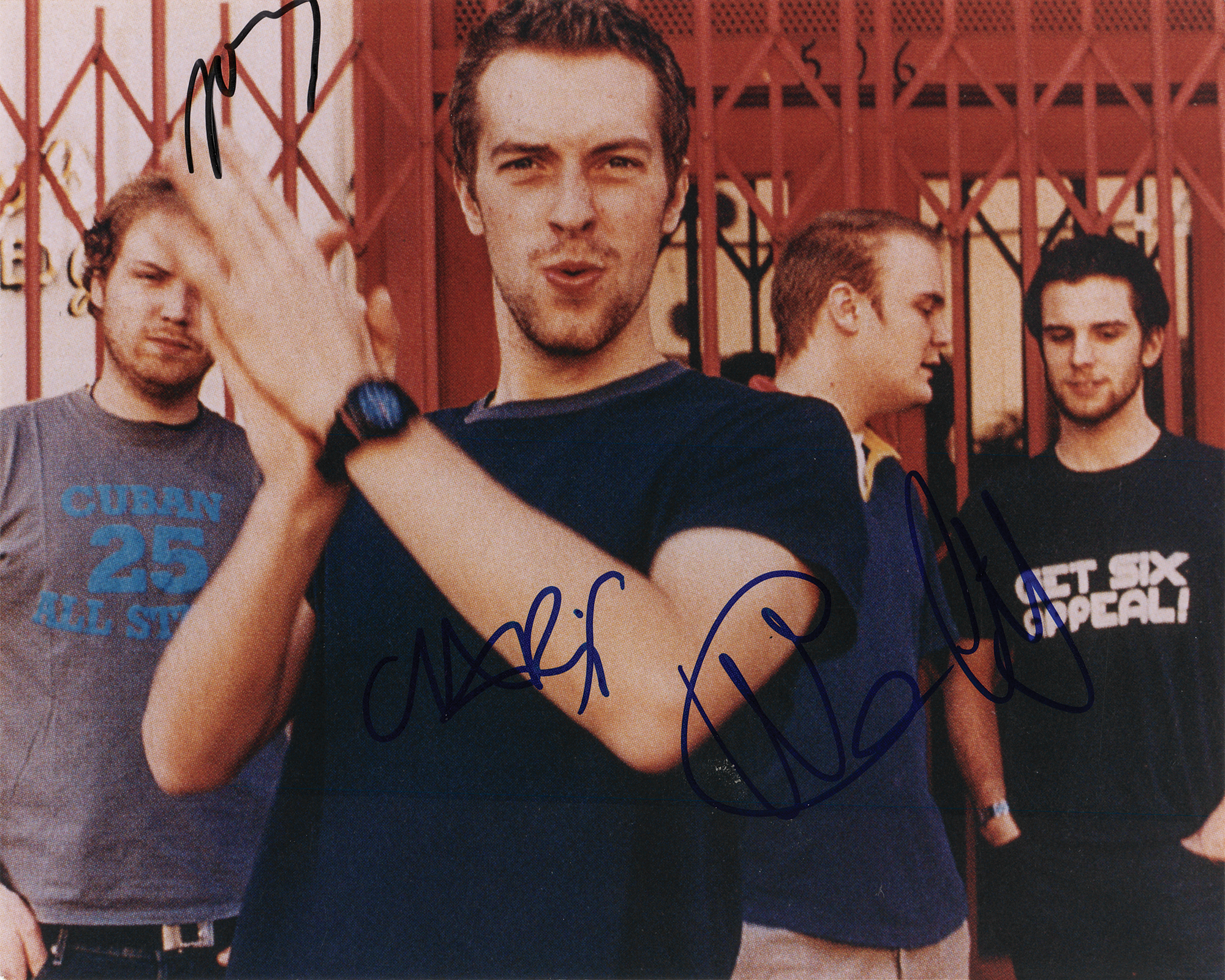 Color glossy 10 x 8 photo of Coldplay in front of a red fence, signed in blue and black felt tip by Chris Martin, Jonny Buckland, Guy Berryman, and Will Champion. In very fine condition, with a slightly grainy quality to the image.