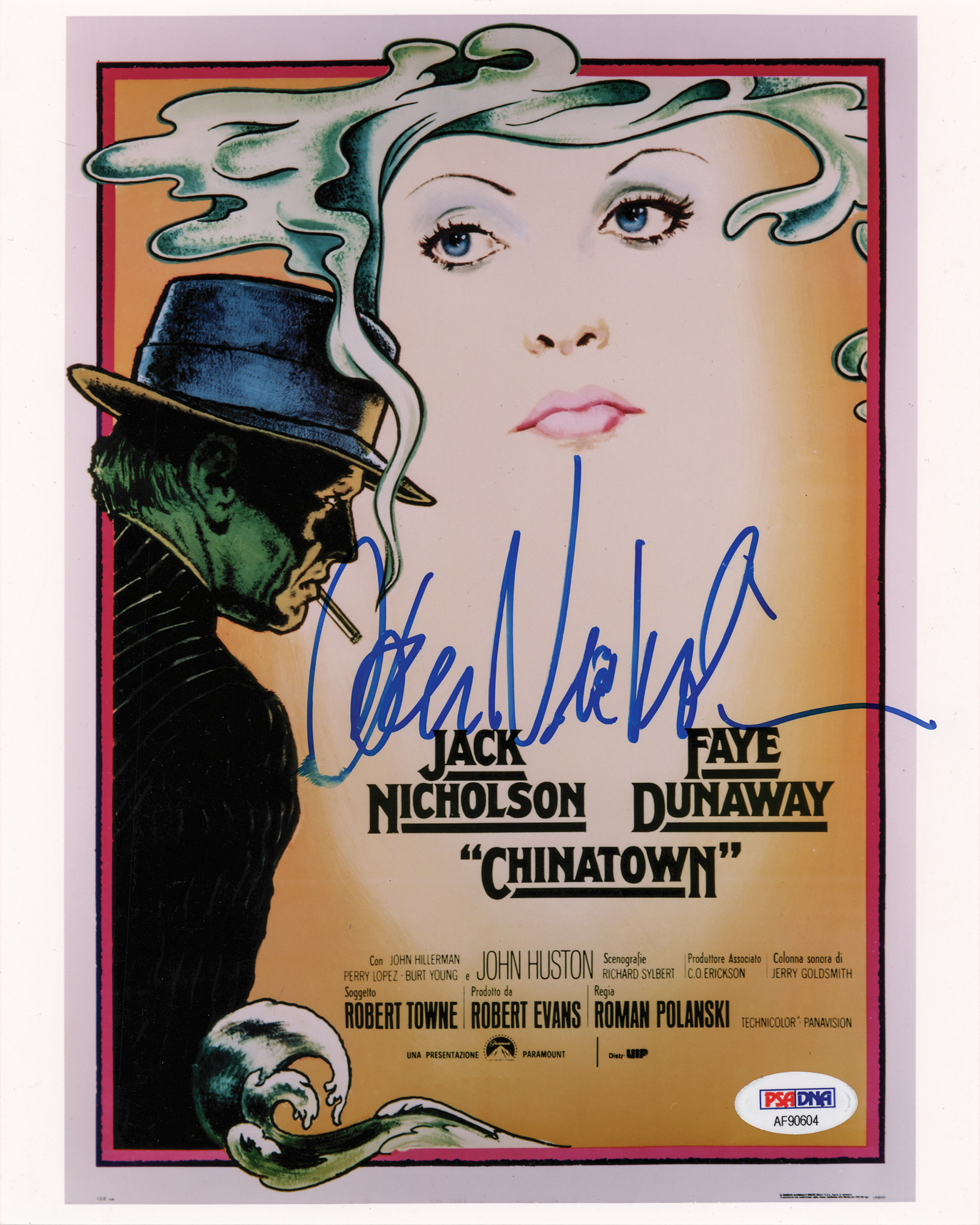 Color glossy 8 x 10 photo of the poster for the 1974 film Chinatown, signed in blue felt tip by Jack Nicholson. In fine condition, with a trivial brush to the first letter of the signature and PSA/DNA authentication label affixed to the lower right corner. Accompanied by a certificate of authenticity from PSA/DNA.