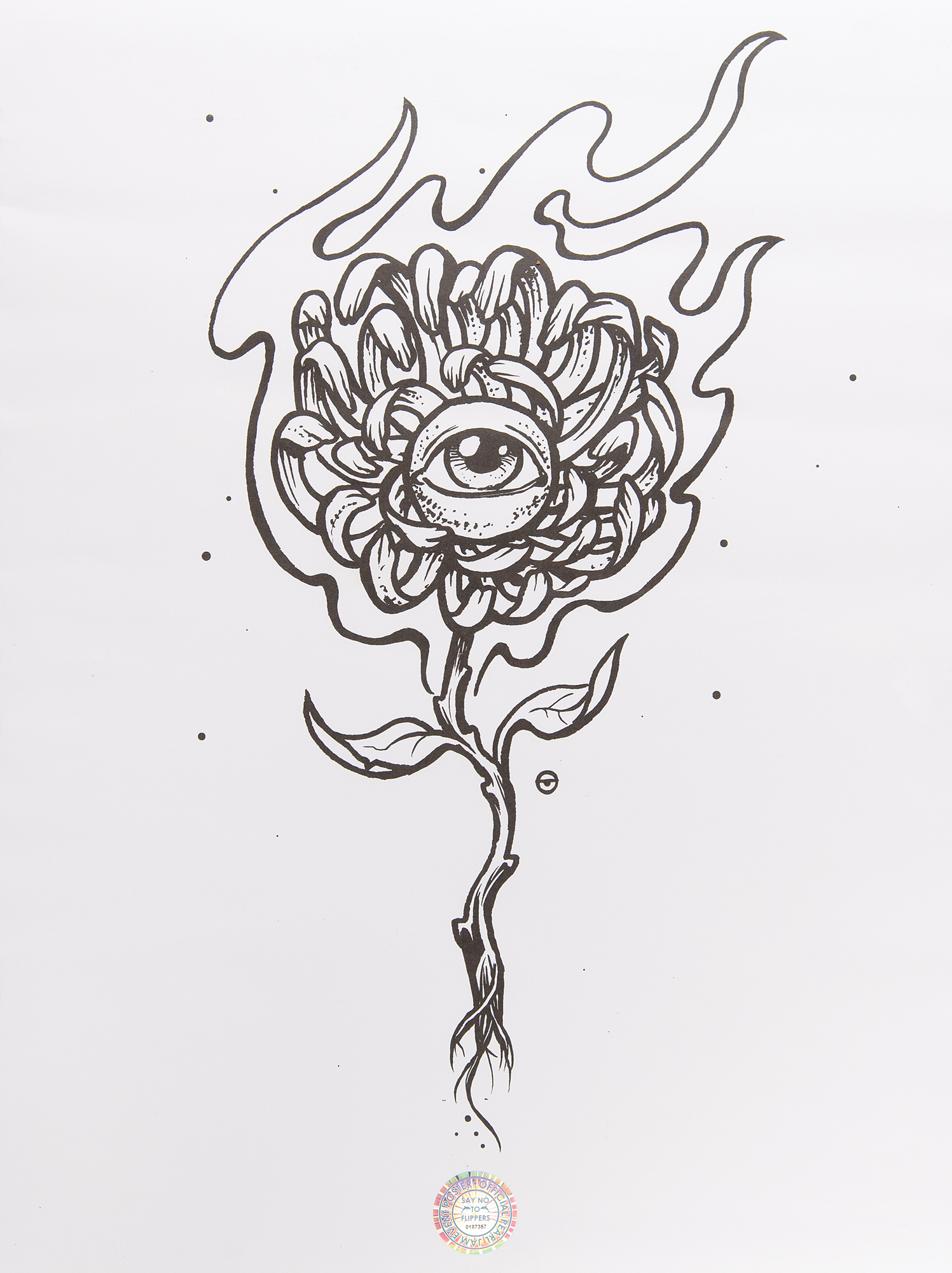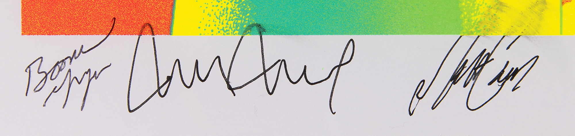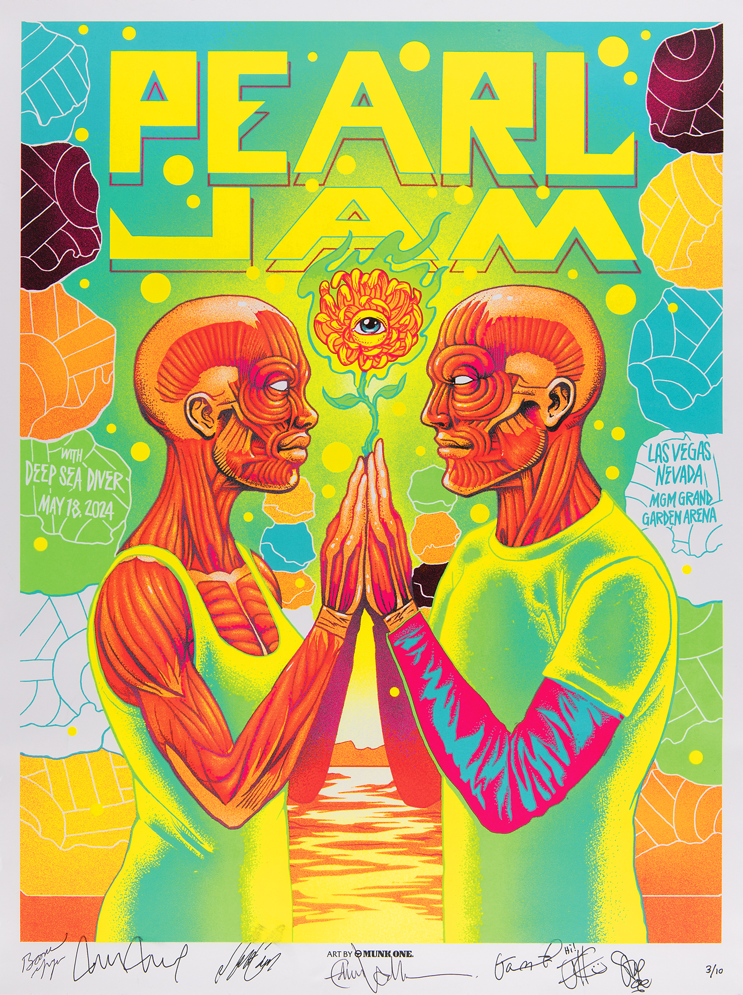 Limited edition color 18 x 24 event poster for a Pearl Jam concert at the MGM Grand Garden Arena in Las Vegas, Nevada, on May 18, 2024, numbered 3/10, depicting two skinned people holding a flower with an eye in the center, signed in the lower border in black ink by Jeff Ament, Stone Gossard, Eddie Vedder, Mike McCready, Matt Cameron, Josh Klinghoffer, and Boom Gaspar. The reverse bears a black-and-white image of the flower and an official Pearl Jam Event Poster hologram. Rolled and in fine condition.