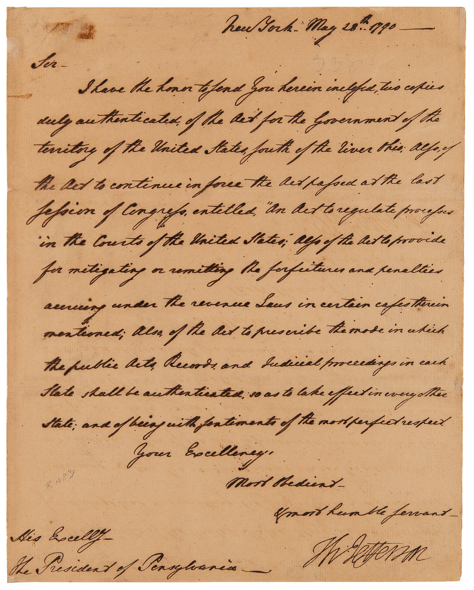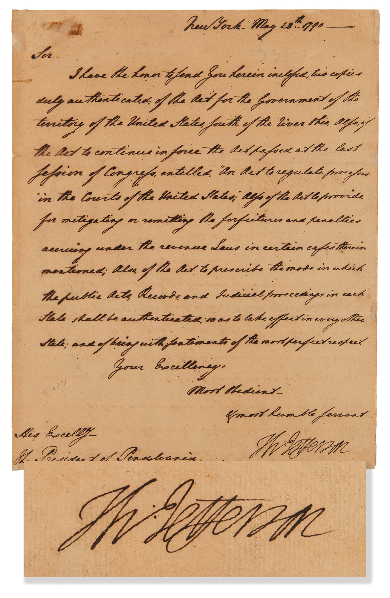 LS as secretary of state, signed “Th: Jefferson,” one page, 8 x 10, May 28, 1790. Addressed from New York, a letter to Thomas Mifflin, “The President of Pennsylvania,” in full: “I have the honor to send you herein inclosed, two copies duly authenticated of the Act for the Government of the territory of the United States south of the River Ohio; also of the Act to continue in force the Act passed at the last session of Congress entitled ‘An Act to Regulate Processes in the Courts of the United States;’ Also of the act to provide for mitigating or remitting the forfeitures and penalties accruing under the revenue Laws in certain cases therein mentioned; also of the Act to prescribe the mode in which the public Acts, Records, and Judicial proceedings in each state shall be authenticated, so as to take effect in every other state; and of being with sentiments of the most perfect respect.” In fine condition, with a few small expert professional repairs.