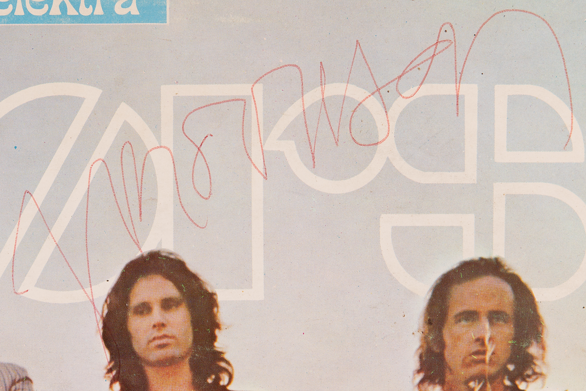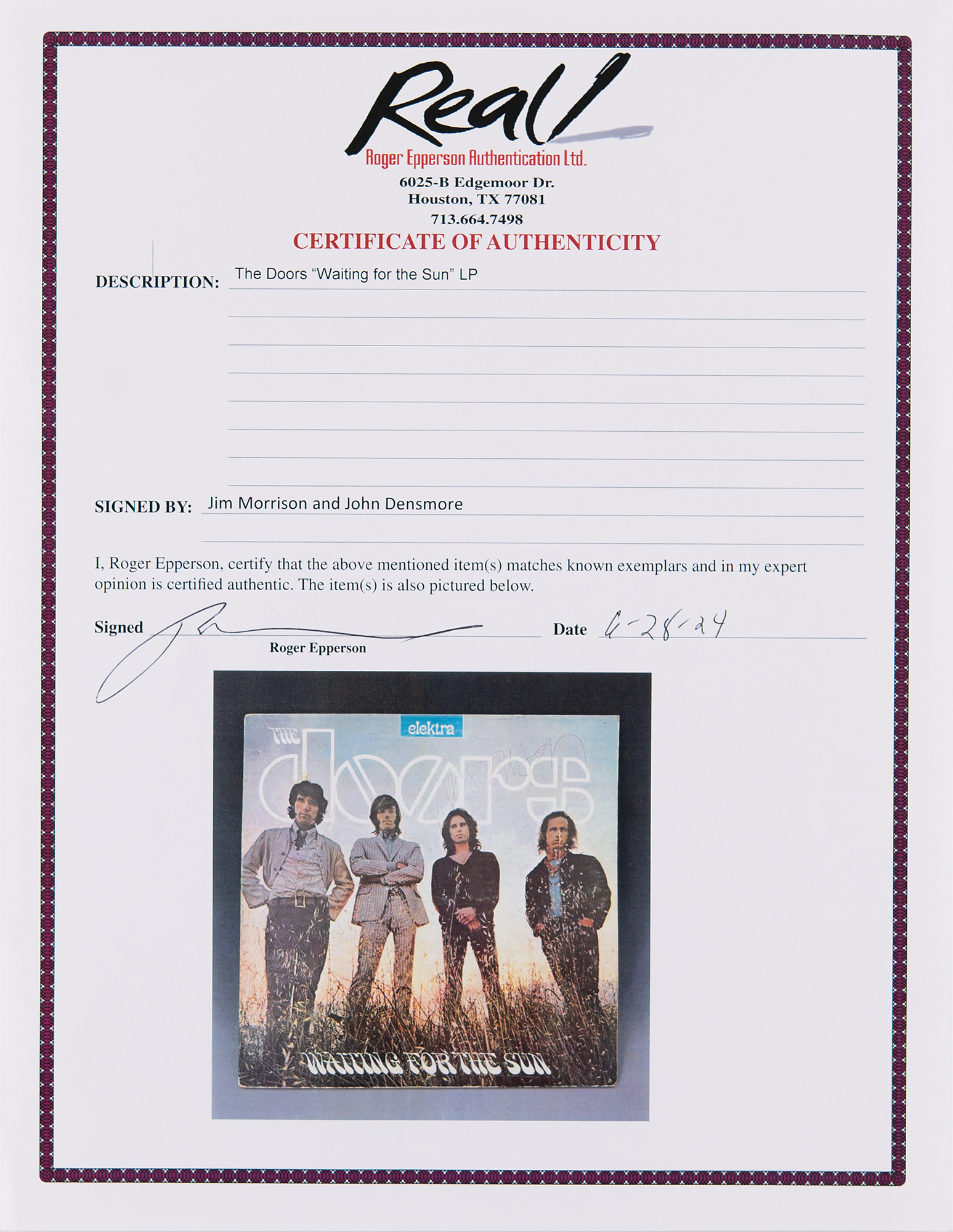 Accompanied by a letter of provenance from a relative of the original recipient: “My brother-in-law Chris Jones attended the Isle of Wight Festival in 1970, specifically to see The Doors and Jimi Hendrix. He took with him a copy of The Doors 1968 album ‘Waiting For The Sun’ (Elektra, mono, orange label) and was fortunate enough to meet Jim Morrison and drummer John Densmore, both of whom signed the front sleeve of the album…Chris had told me over the years that he had Jim Morrison's autograph on the album sleeve but I had never actually seen it until recently when he passed away and I was helping his widow clear his belongings from the house. I was given his vinyl record collection and the album was in said collection.” Also accompanied by a full letter of authenticity from REAL; music autograph expert Roger Epperson attests that this is only the fourth authentic Morrison-signed Doors album that he has ever seen.