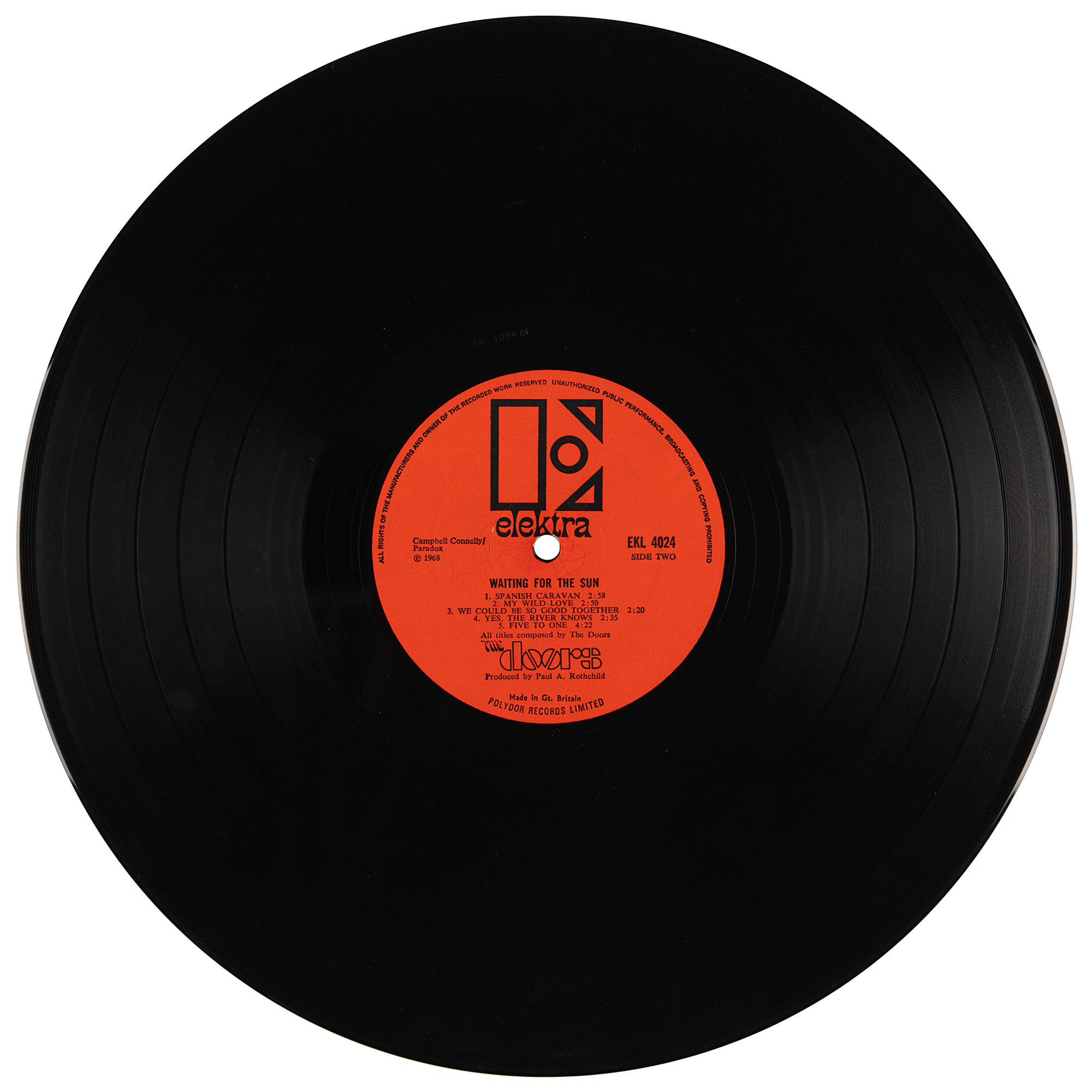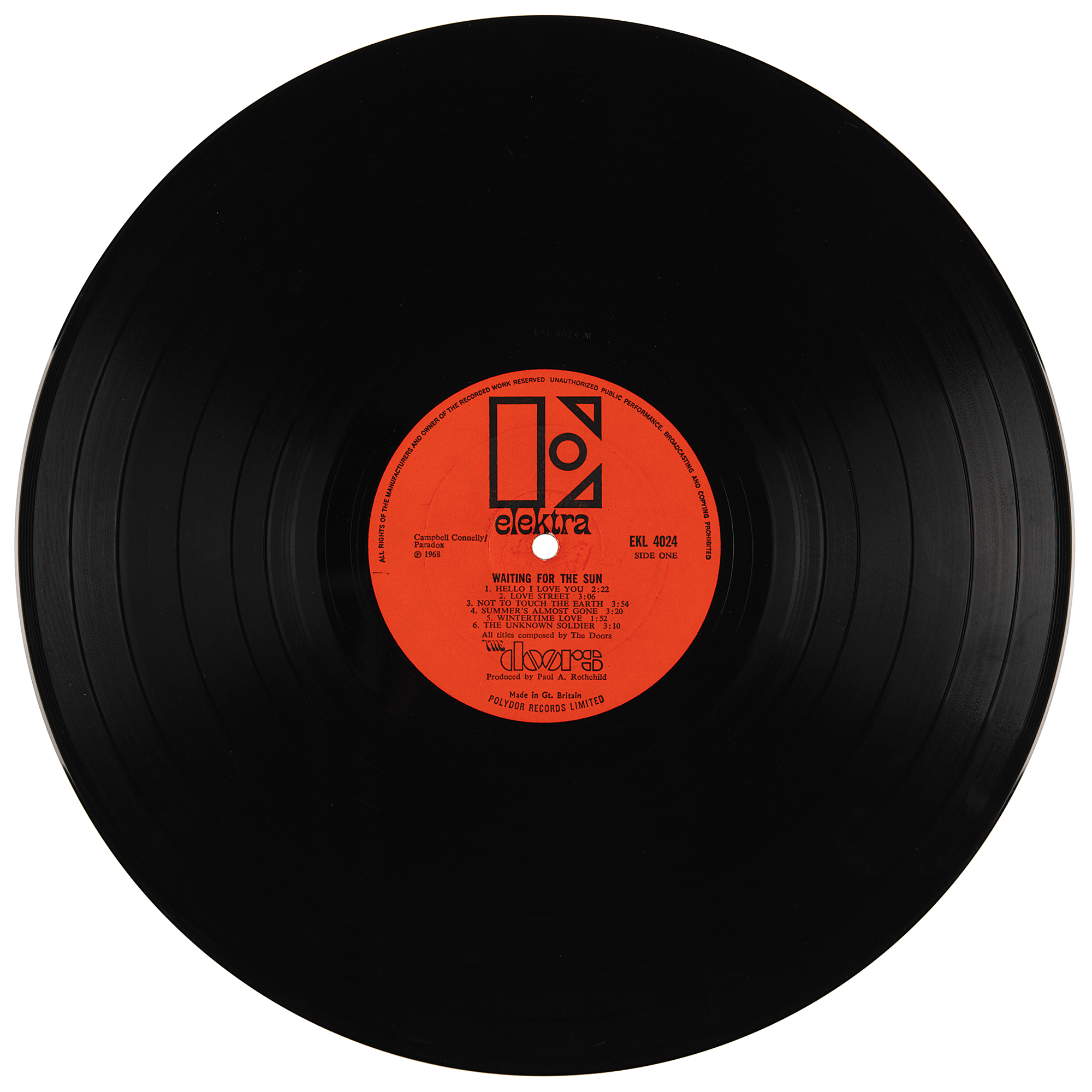 Waiting for the Sun album by the Doors (Elektra, EKL 4024 Mono), signed on the front cover in red ballpoint by Jim Morrison, “J. Morrison,” and John Densmore, “John.” In fine condition. The record is included.