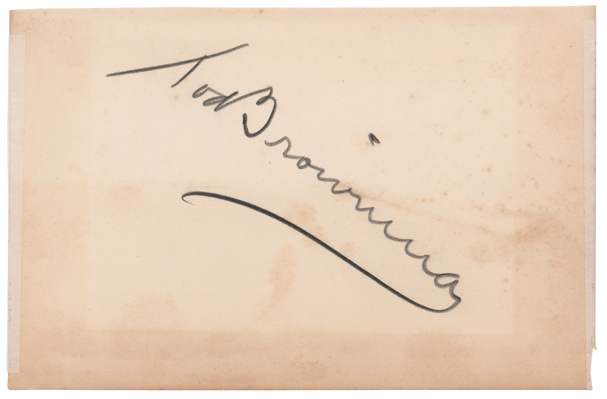 Director, actor, and screenwriter (1880-1962) best known as the director of Dracula in 1931 and the cult classic Freaks in 1932. Large vintage pencil signature, "Tod Browning,” on an off-white 7.5 x 5 album page. In very good to fine condition, with thin tape to the top and bottom edges, and irregular light toning and staining. Bold and unusually large, this is an ideal example of the tremendously difficult to find early director.