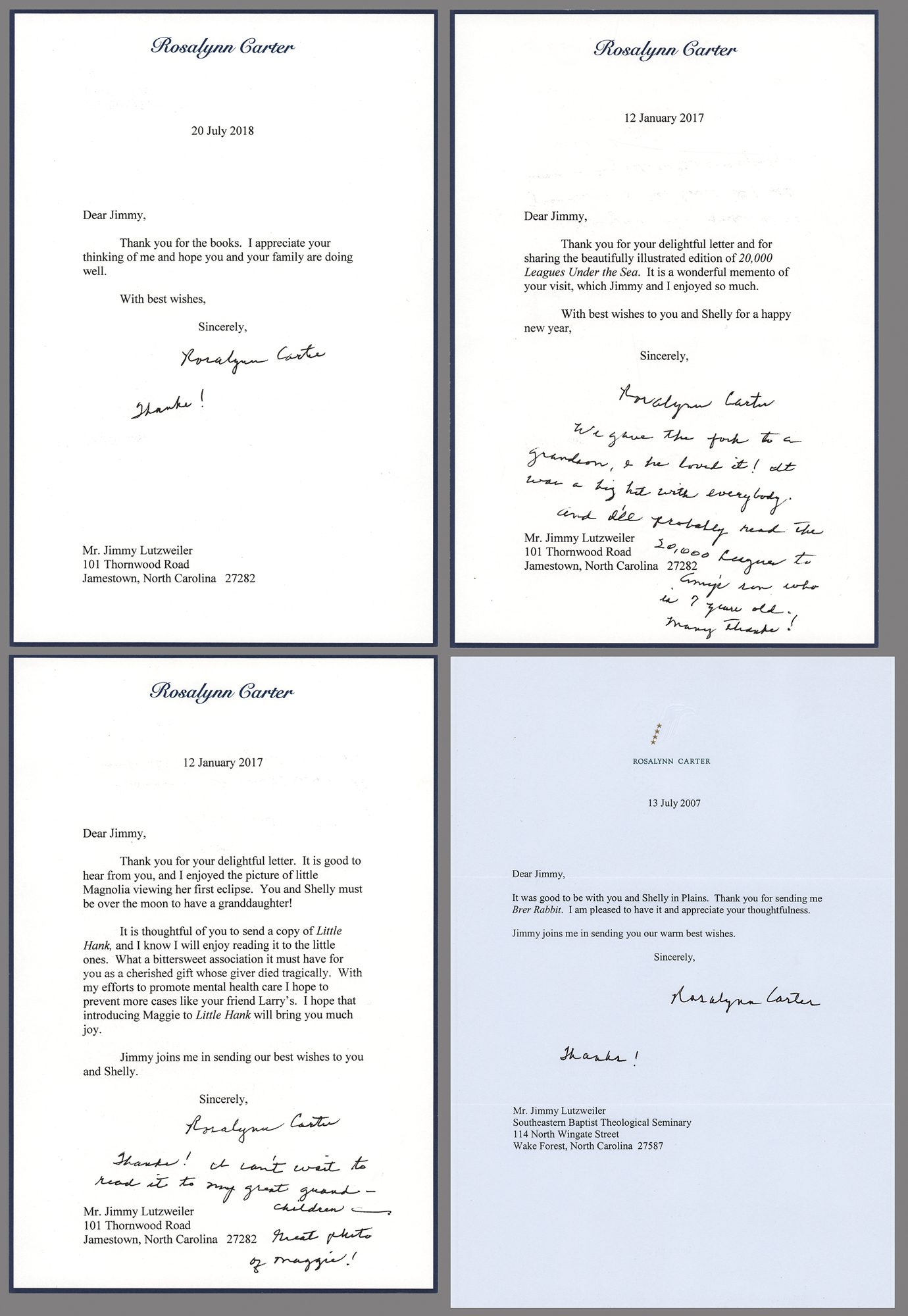 Extensive correspondence archive between Jimmy Carter and Jimmy Lutzweiler, the archivist at Southeastern Baptist Theological Seminary, containing 70 signed letters from the former American president which touch upon a diverse array of contents and themes, including religion, literature, history, politics, and much more. Dated from October 2000 to July 2019, the archive features 60 letters from Lutzweiler to Carter, who, in one of the upper corners, adds a handwritten response signed as either “Jimmy C.” or “Jimmy Carter.” Complementing these letters are 10 sent by Carter to Lutzweiler, including nine TLSs and one ALS (greeting card), each one page, personal letterhead, ranging in size from 6.5 x 8.5 to 8.5 x 11. Also included are four TLSs from Rosalynn Carter, also addressed to Lutzweiler, dating from 2007 to 2018.