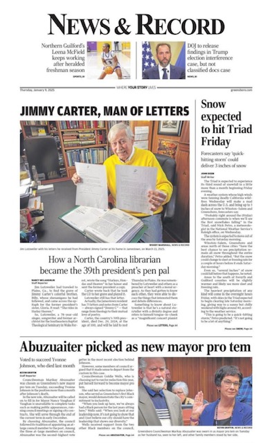 A small number of the Lutzweiler letters are incomplete (i.e. missing their last page), and the majority of the letters are accompanied by their original mailing envelopes. Also included with the archive are printed and PDF copies of Lutzweiler’s 189-page unpublished memoir, Jimmy C. and Me: Jimmy L. The President and One of His Pen Pals, and a copy of The High Point Enterprise newspaper from December 18, 2016, which shows pictures of Carter and Lutzweiler together, images for the lead article, “The Two Jimmys” with subhead, “Jamestown man sings at former president’s church.” An impressive and sweeping correspondence from Jimmy Carter that spans two decades and covers no shortage of subject matter, both personal and professional; of further interest for presidential historians is the long list of literary titles mentioned by and presented to Carter, a prolific reader and writer who has authored more than 30 books, a feat unmatched by any other American president.