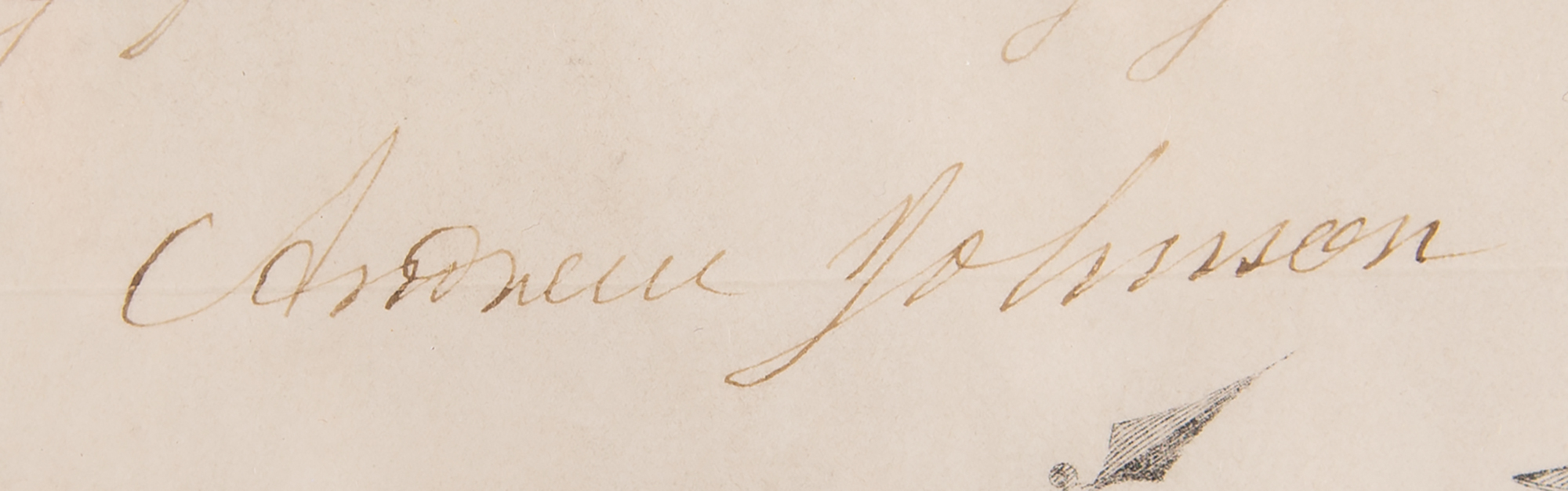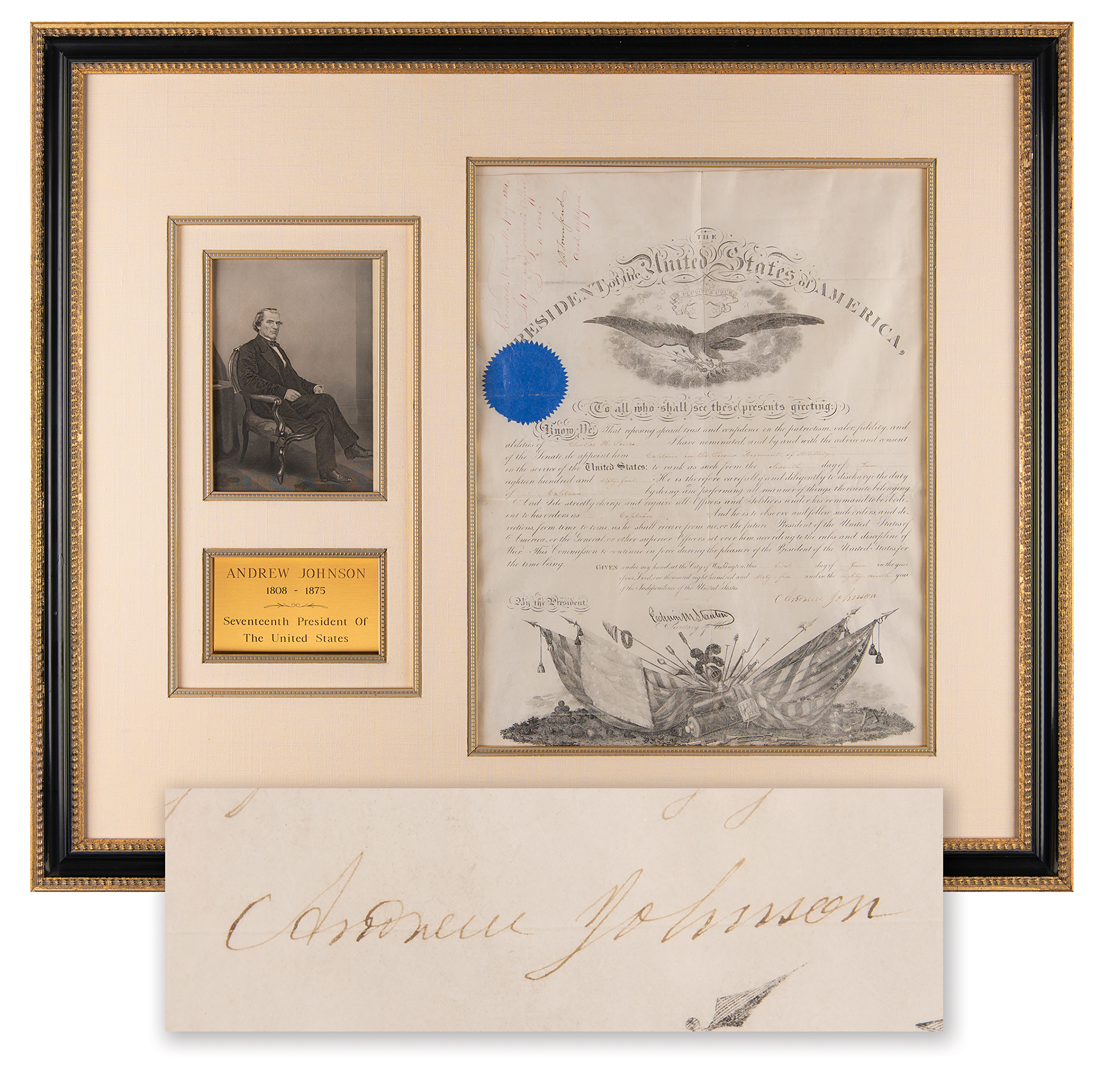 Partly-printed vellum DS as president, one page, 13.5 x 17.5, June 1, 1865. President Johnson appoints Charles H. Peirce as a “Captain in the Second Regiment of Artillery in the service of the United States.” Signed neatly at the conclusion by Andrew Johnson, with the lower portion bearing stamped signature of Secretary of War Edwin M. Stanton. The original blue seal remains affixed to the upper left. Handsomely matted and framed with a portrait and engraved plate to an overall size of 31.25 x 26.25. In fine condition.