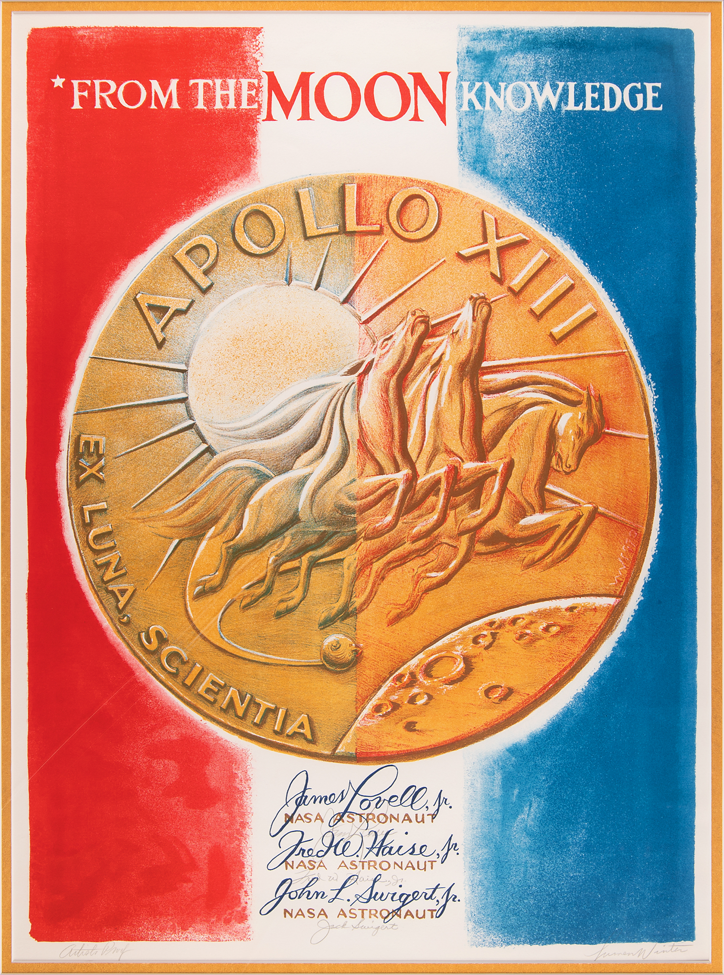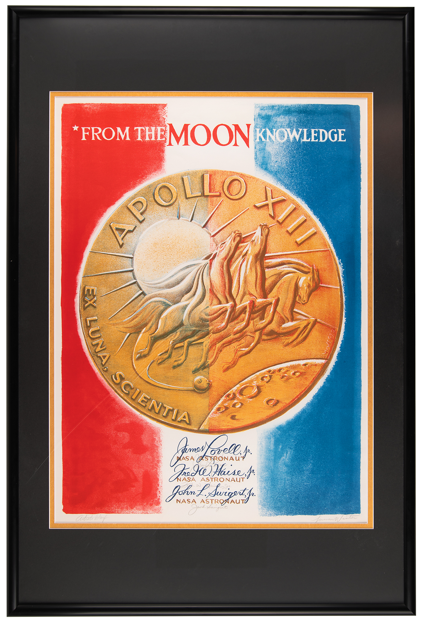 Beautiful color limited edition 21.5 x 29.5 artist's proof lithograph honoring Apollo 13 by Lumen Winter entitled 'From the Moon, Knowledge,' signed in pencil by James Lovell, Fred Haise, and Jack Swigert, each signing below his calligraphically designed name. Also signed in the lower border in pencil by the artist, "Artist's Proof, Lumen Winter," the designer of the 'Steeds of Apollo' insignia for Apollo 13. Handsomely double-matted and framed to an overall size of 28.5 x 42.5. In fine condition. Accompanied by a signed letter of authenticity from the niece of Jack Swigert, certifying the print as originating from Swigert's personal collection.