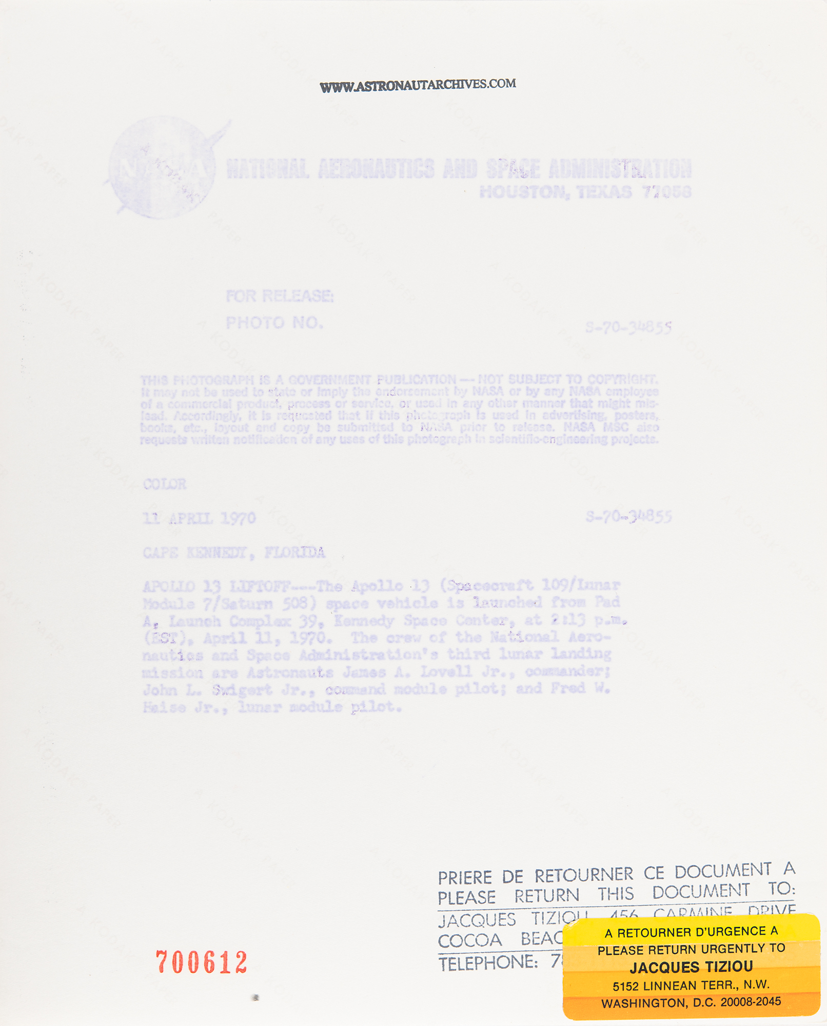 Official color glossy 8 x 10 red-numbered NASA photo (S-70-34855) of the dramatic Saturn liftoff of Apollo 13, signed in black felt tip, "Glynn S. Lunney, 'Black' Flight," “Gerry Griffin, 'Gold' Flight," “Milton Windler, Maroon Flight,” and “Gene Kranz, Apollo 13 Launch, NASA, Mission Control." Reverse bears purple NASA caption text, “A Kodak Paper” watermarks, and an affixed ownership label. In fine condition, with a couple minor surface creases.