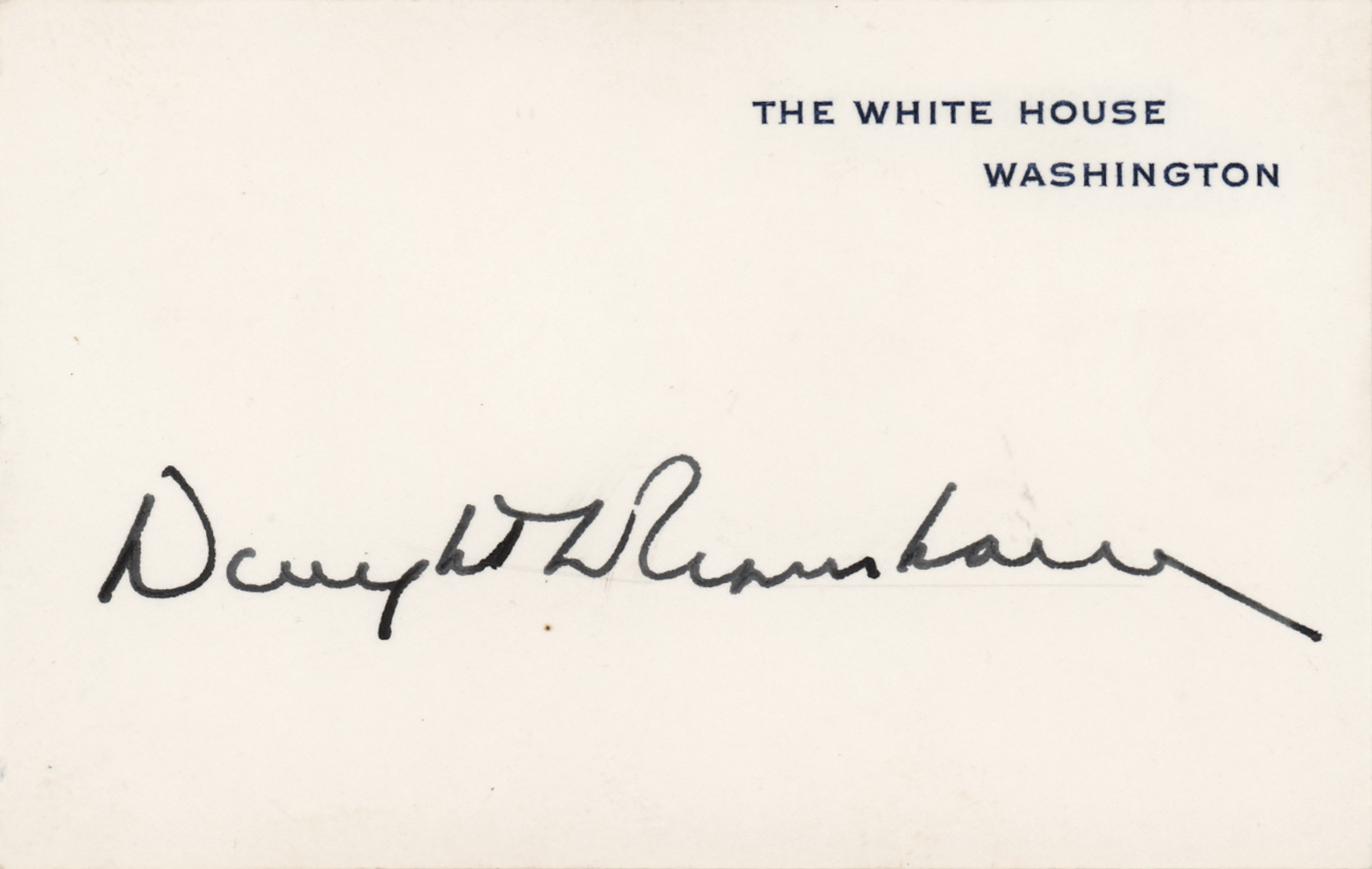 Choice White House card, 4 x 2.5, signed in fountain pen by Dwight D. Eisenhower. In fine condition, with some old adhesive residue on the back. Accompanied by its original White House envelope.