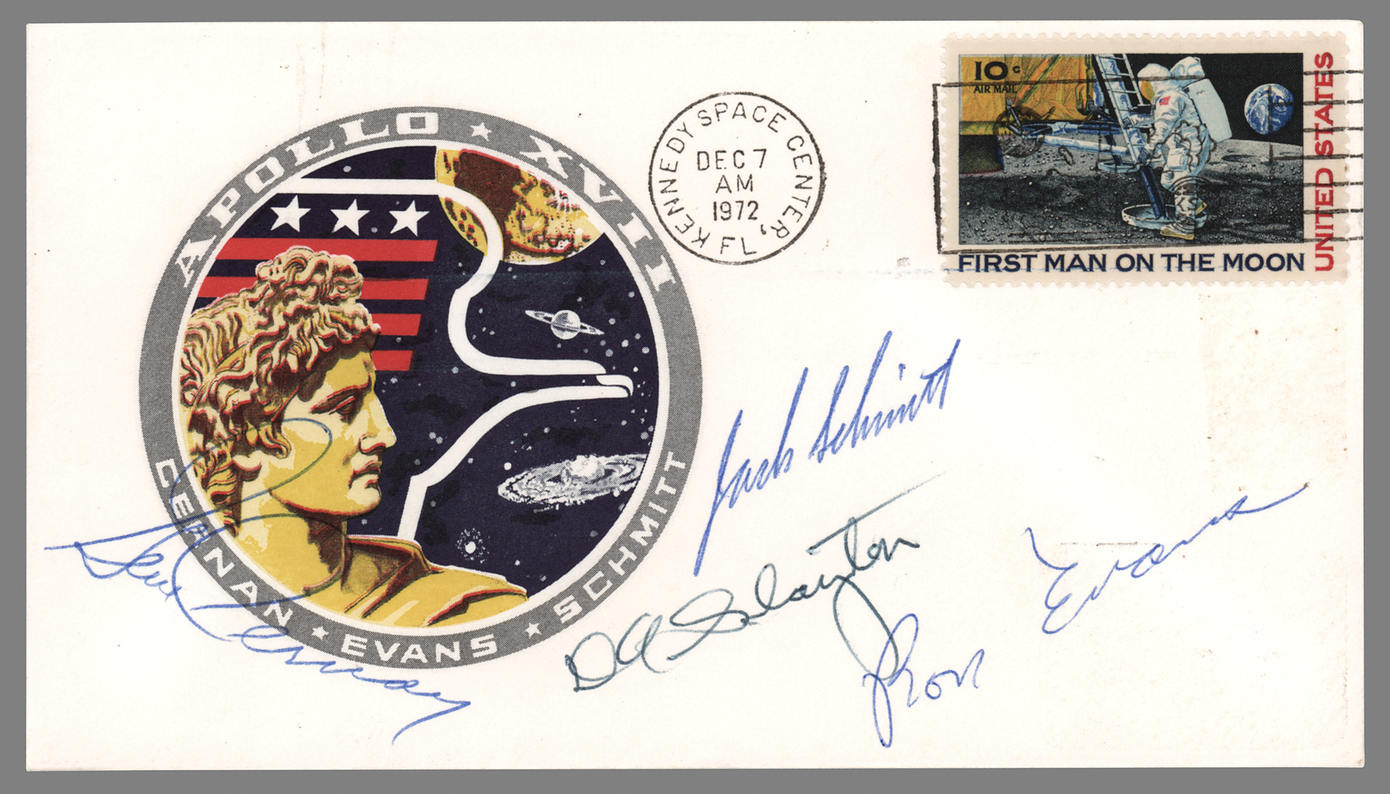 Appealing Apollo 17 launch day cover with a color cachet of the mission insignia, postmarked at Kennedy Space Center on December 7, 1972, signed in blue ballpoint by the crew—"Gene Cernan," "Jack Schmitt," and "Ron Evans,"—as well as Director of Flight Crew Operations, member of the Mercury 7, and future Apollo-Soyuz astronaut, "D. K. Slayton." In fine condition. Consignor notes that this originates from the collection of Kevin Steen, a cancer-stricken boy who was a special guest at two Apollo liftoffs and was invited onboard the USS Ticonderoga recovery ship for Apollo 17 as a guest of Rear Admiral John L. Butts. Accompanied by an unsigned Apollo 17 launch day cover addressed to Steen, photocopies of 1972 newspaper articles about Steen documenting his unique involvement in the Apollo program, and a print of an image of him chatting with Schmitt during dinner on the Ticonderoga.