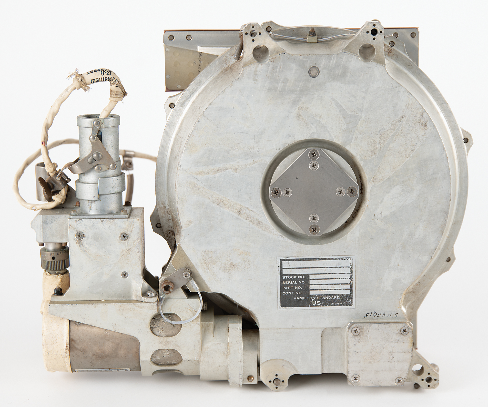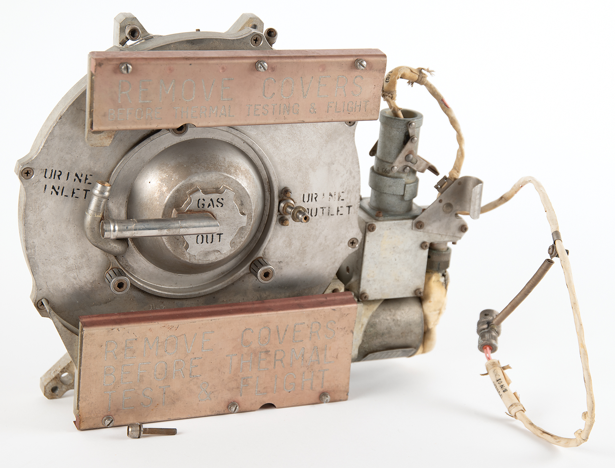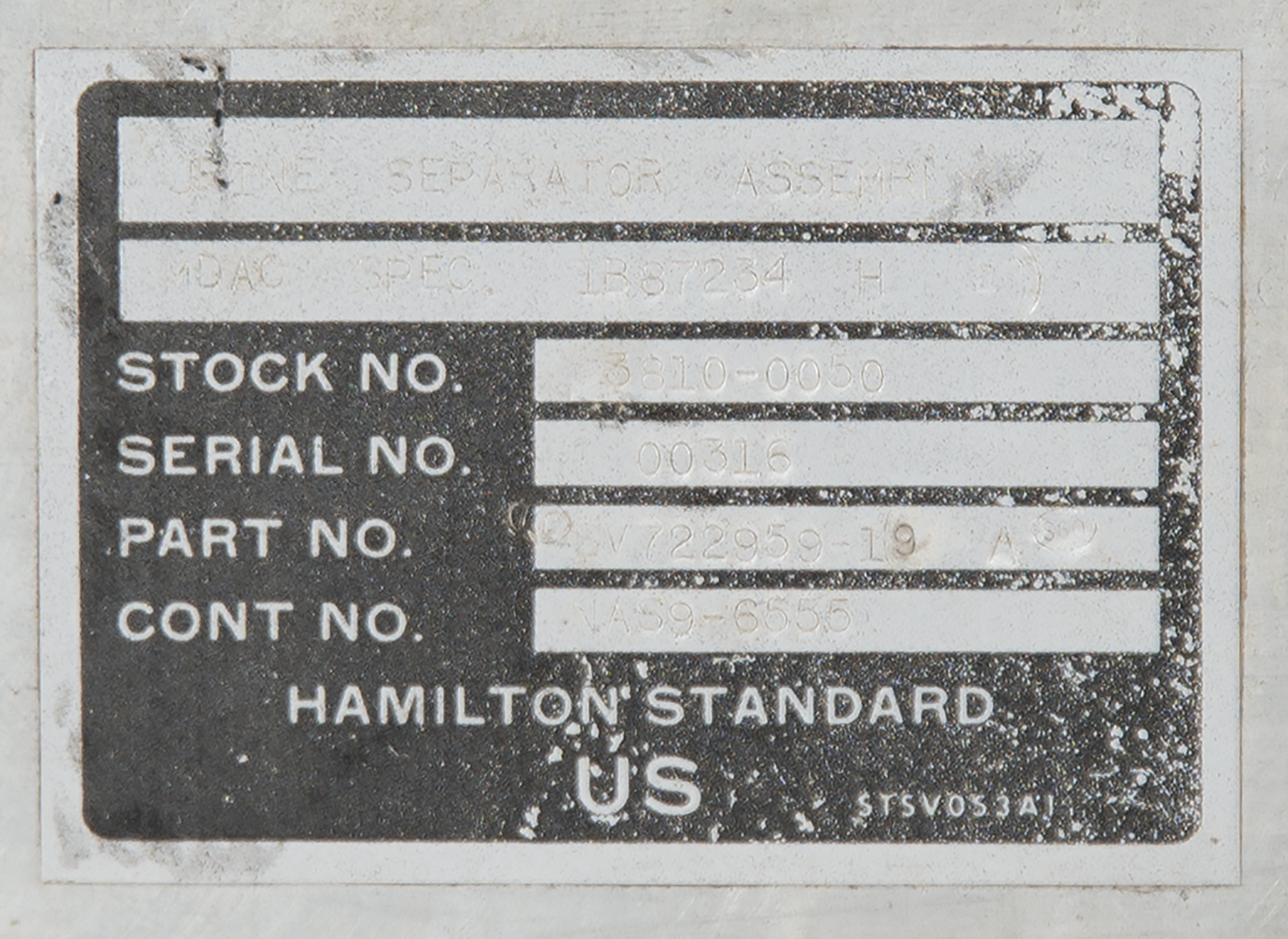 Skylab Waste Management System Urine Separator, measuring 14˝ x 11˝ x 4˝, with a Hamilton Standard label on the side: "Urine Separator Assembly, MDAC Spec. 1B87234H, Stock No. 3810-0050, Serial No. 00316, Part No. SV722959-19, Cont No. NAS9-6555." The opposite side has tubes marked "Urine Inlet," "Gas Outlet," and "Urine Outlet," and protective covers over the brackets marked: "Remove Covers Before Thermal Test & Flight."