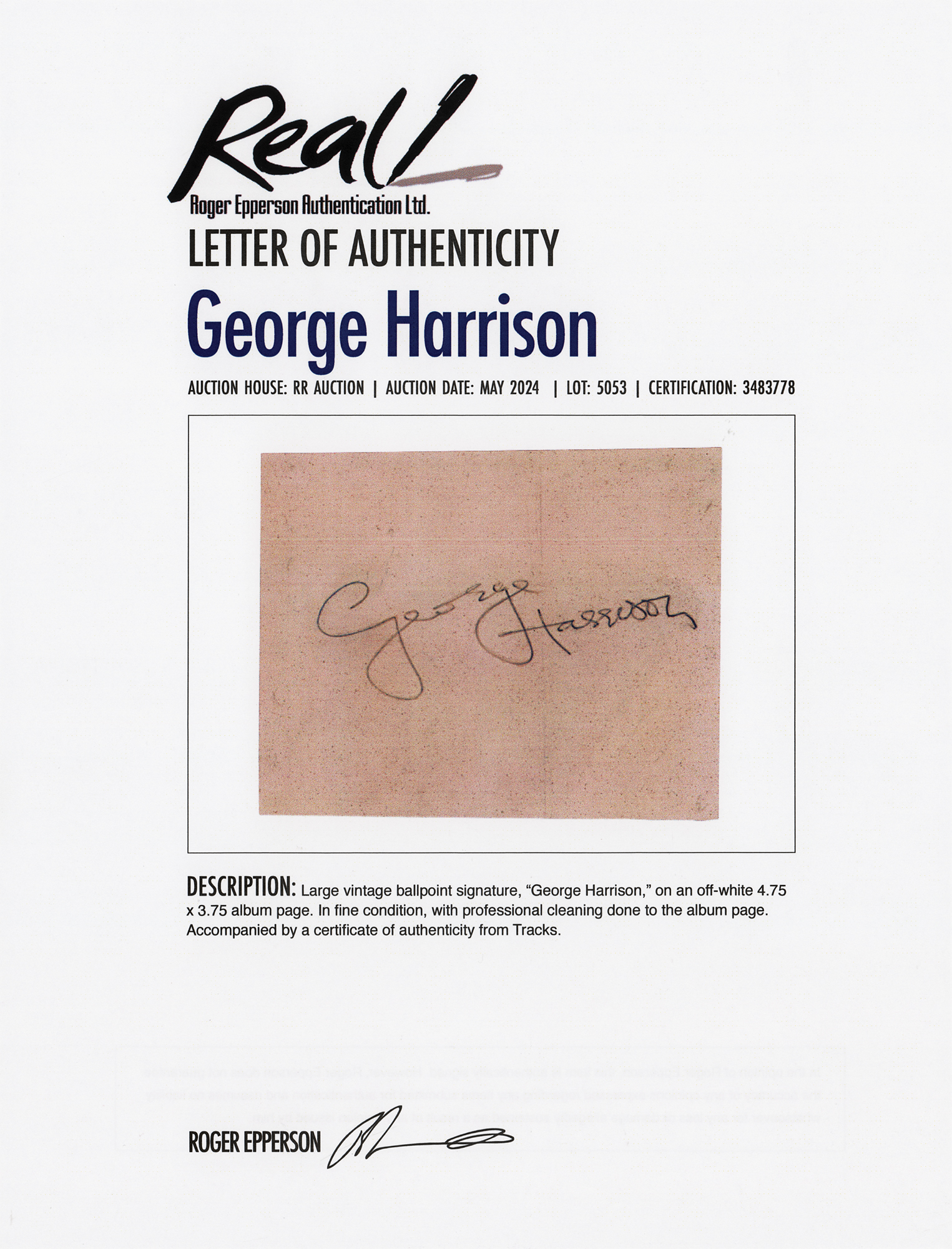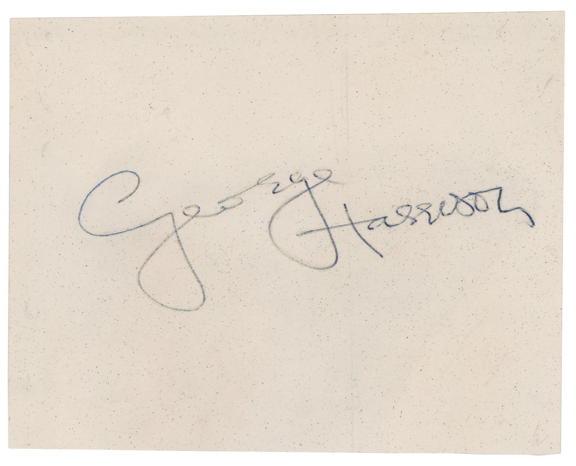 Large vintage ballpoint signature, "George Harrison,” on an off-white 4.75 x 3.75 album page. In fine condition, with professional cleaning done to the album page. Accompanied by a certificate of authenticity from Tracks and a full letter of authenticity from REAL.