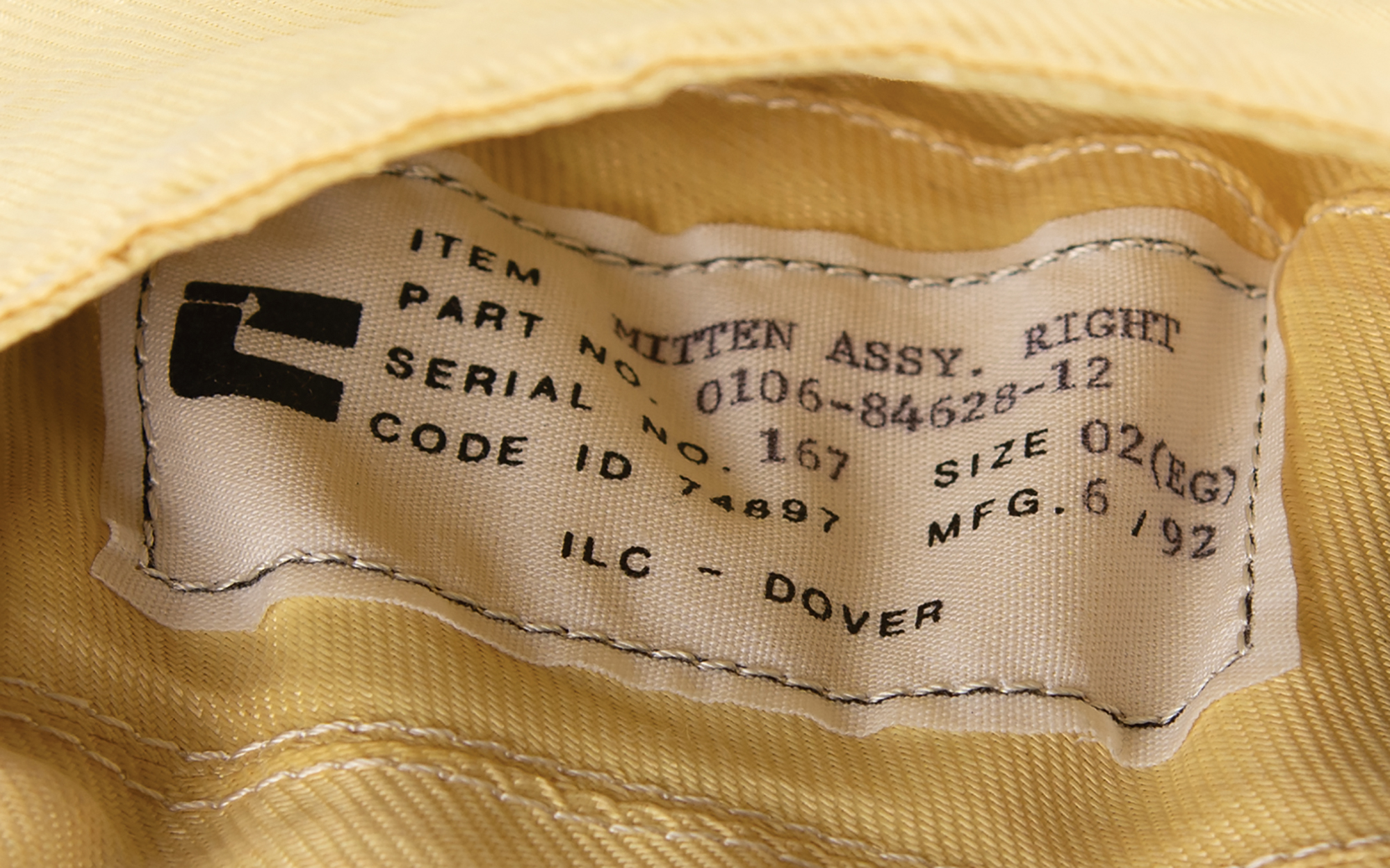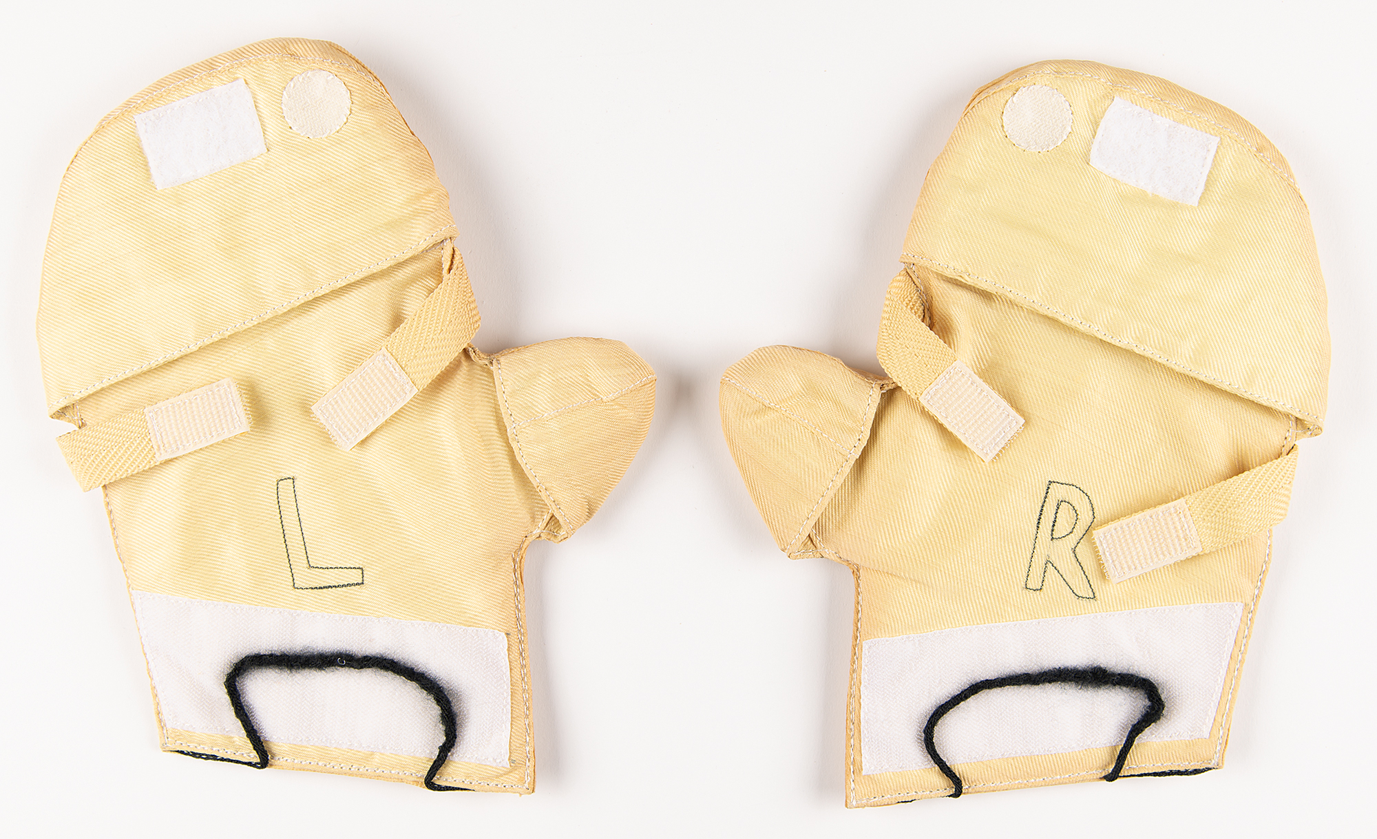 Pair of left- and right-handed Space Shuttle EVA Thermal Mittens designed to fit over the outer glove to provide warmth during spacewalks, with ILC-Dover tags inside the rear fingertip area, reading: "Item: Mitten Assy. Left, Part No. 0106-84628-11, Serial No. 167, Size 02(EG), Code ID 74897, Mfg. 6/92" and "Item: Mitten Assy. Right, Part No. 0106-84628-12, Serial No. 167, Size 02(EG), Code ID 74897, Mfg. 6/92." The mittens are lettered "L" and "R" to indicate the hand, and have Velcro straps and tabs for restraint and easy stowage. Accompanied by their plastic bag with affixed JSC Project Parts Tags and NASA-JSC cleaning and inspection labels.