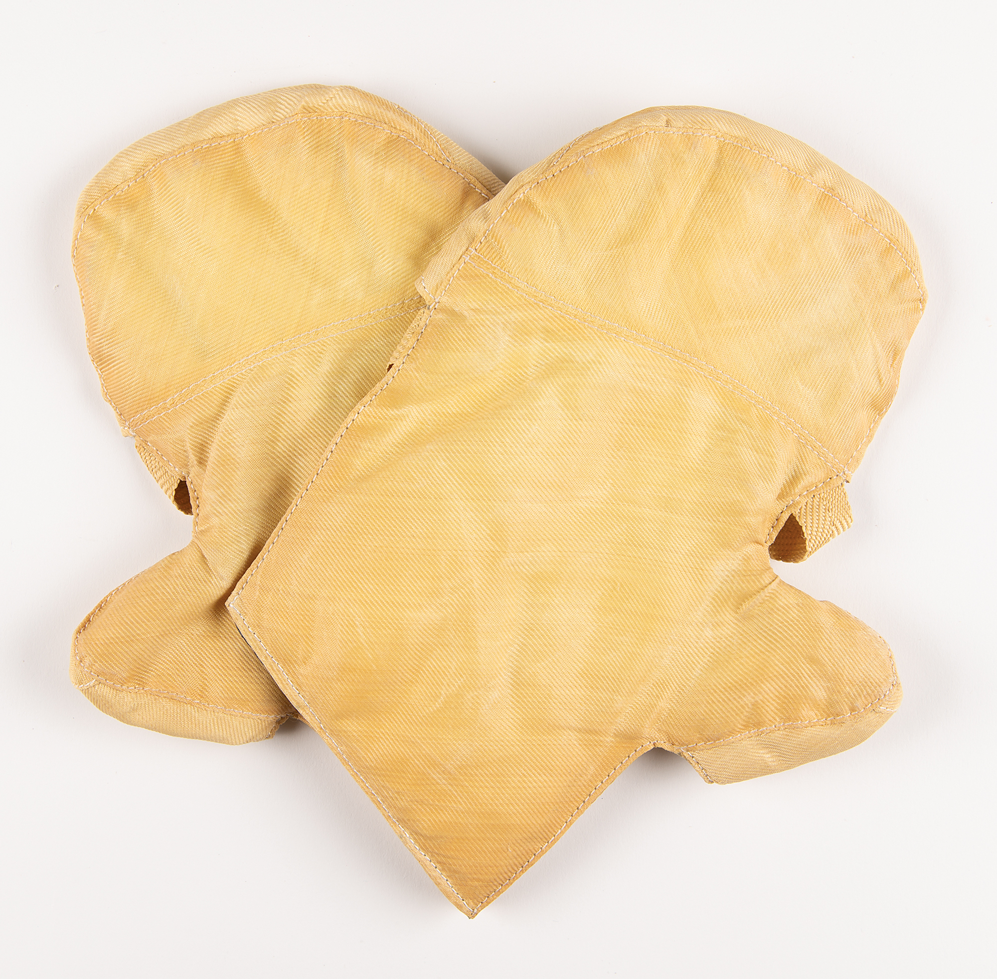Developed by space suit maker ILC-Dover in response to astronauts' reports that their hands got cold during EVAs, these insulated thermal mittens could be fitted over their outer gloves to temporarily retain warmth. The slip-over design and Velcro restraints made them easily removed for tasks requiring finger dexterity. Although astronauts tested mittens like these on the STS-63 mission in 1995, they were never adopted as a standard piece of equipment for Shuttle flights.