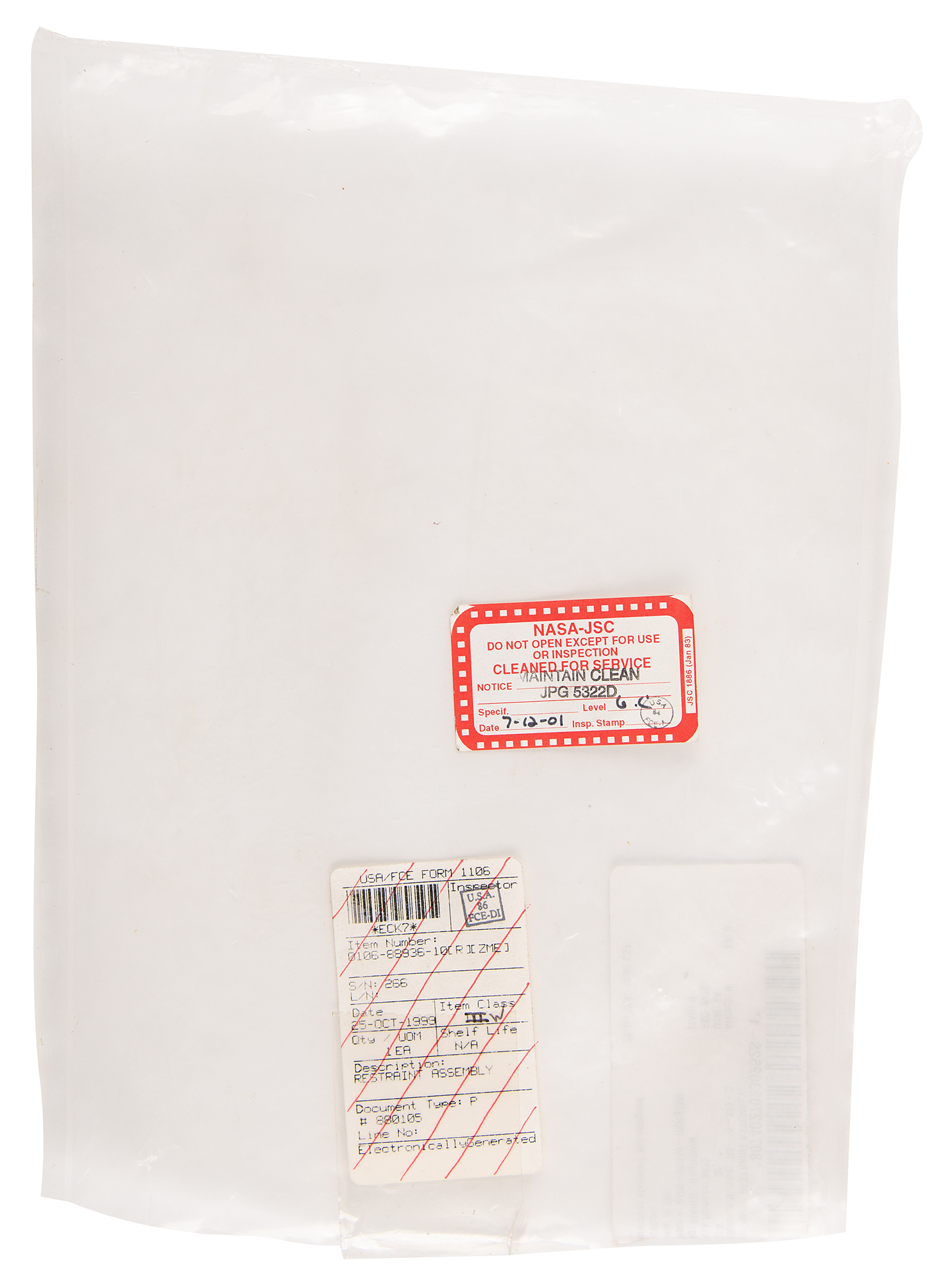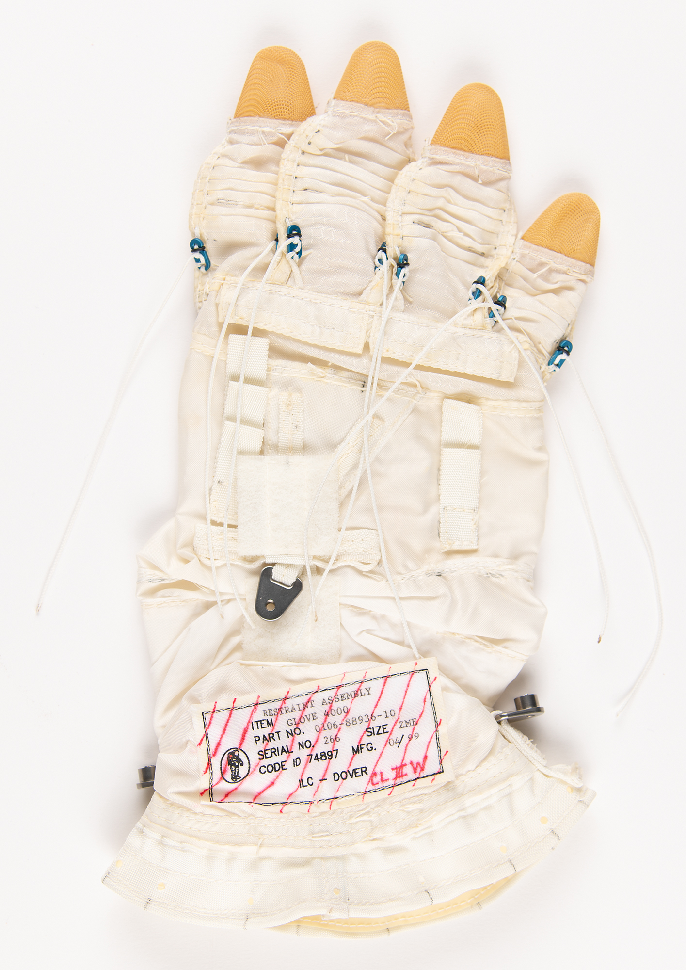 Rare right-handed 4000 series Space Shuttle glove restraint layer, with an ILC-Dover parts tag sewn on the back of the wrist: "Item: Restraint Assembly, Glove 4000, Part No. 0106-88936-10, Serial No. 266, Size ZME, Code ID 74897, MFG 04/99." Development of the Series 4000 started in 1985 as a follow-up to the 3000 series glove to reduce bladder bunching and to improve fit and mobility. They were first flown in 1986 and continued through 1991 when it was replaced by the Phase VI glove. The 4000 Series was based on nine standard hand sizes and provides a 'closest fit' glove sizing capability. Further development of the 4000 series gloves resulted in customization for astronauts that did not fit into one of the nine standard sizes. Ten strings on the restraint assembly (two per finger) are used to adjust the sizing of each finger. A small blue metal ring (one per string) is used to lock each of the strings into place. There are 16 holes at the wrist where the Restraint Glove is attached to the bearing ring. Accompanied by its plastic bag with affixed NASA-JSC cleaning and inspection labels.