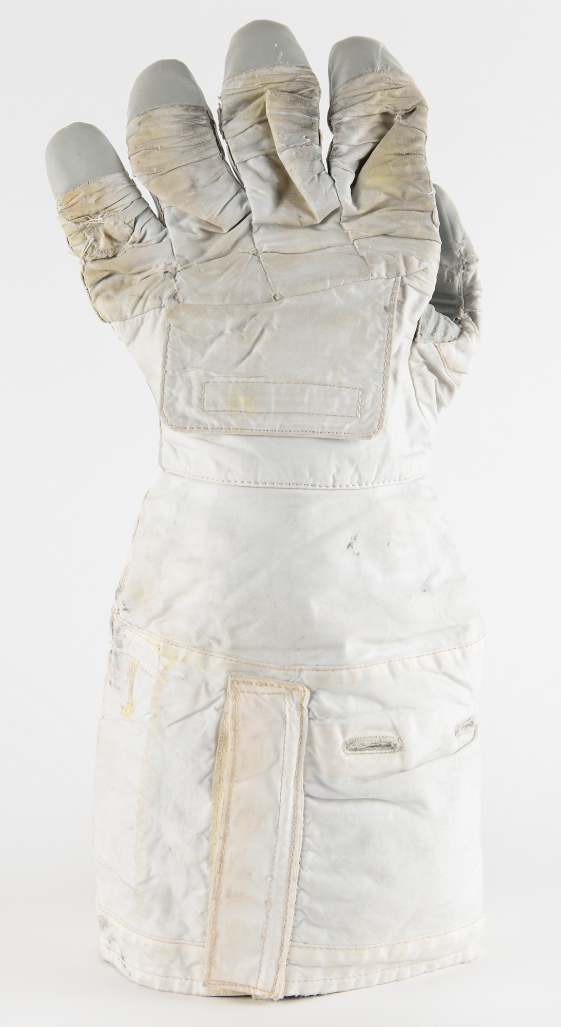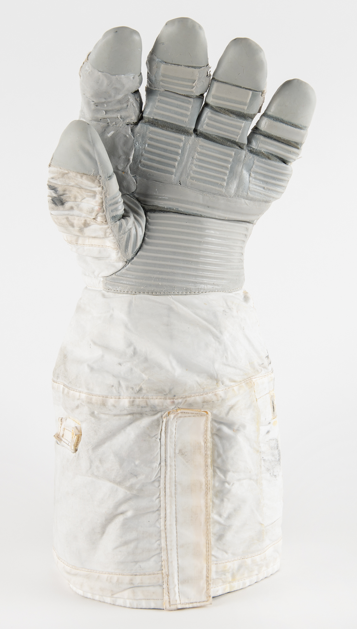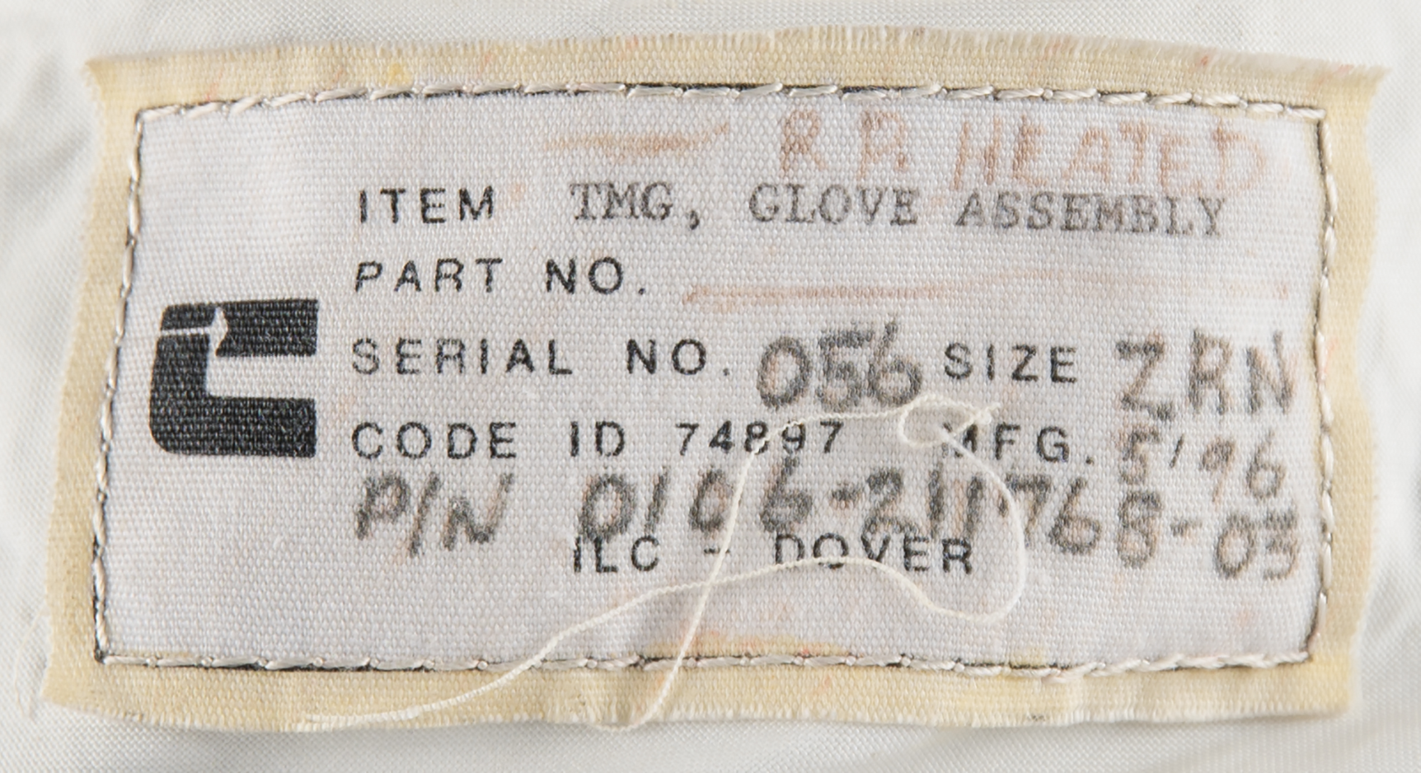 Uncommon left-handed Phase VI Space Shuttle glove TMG (Thermal Micrometeoroid Garment), with an ILC-Dover tag on the interior, reading: "Item: R.P. Heated TMG, Glove Assembly, Part No. ———, Serial No. 056, Size ZRN, Code ID 74897, Mfg. 5/96, P/N 0106-211768-03." The glove TMG features a gray silicon palm and fingertips, a handback flap, and provisions for supporting a remote power supply for an active fingertip heating system (on/off pull strap and cables missing). The TMG is the outermost layer of the spacesuit and provides insulation, radiation shielding, and protection from micrometeorites that could otherwise puncture the suit. Accompanied by its plastic bag with inspection label.