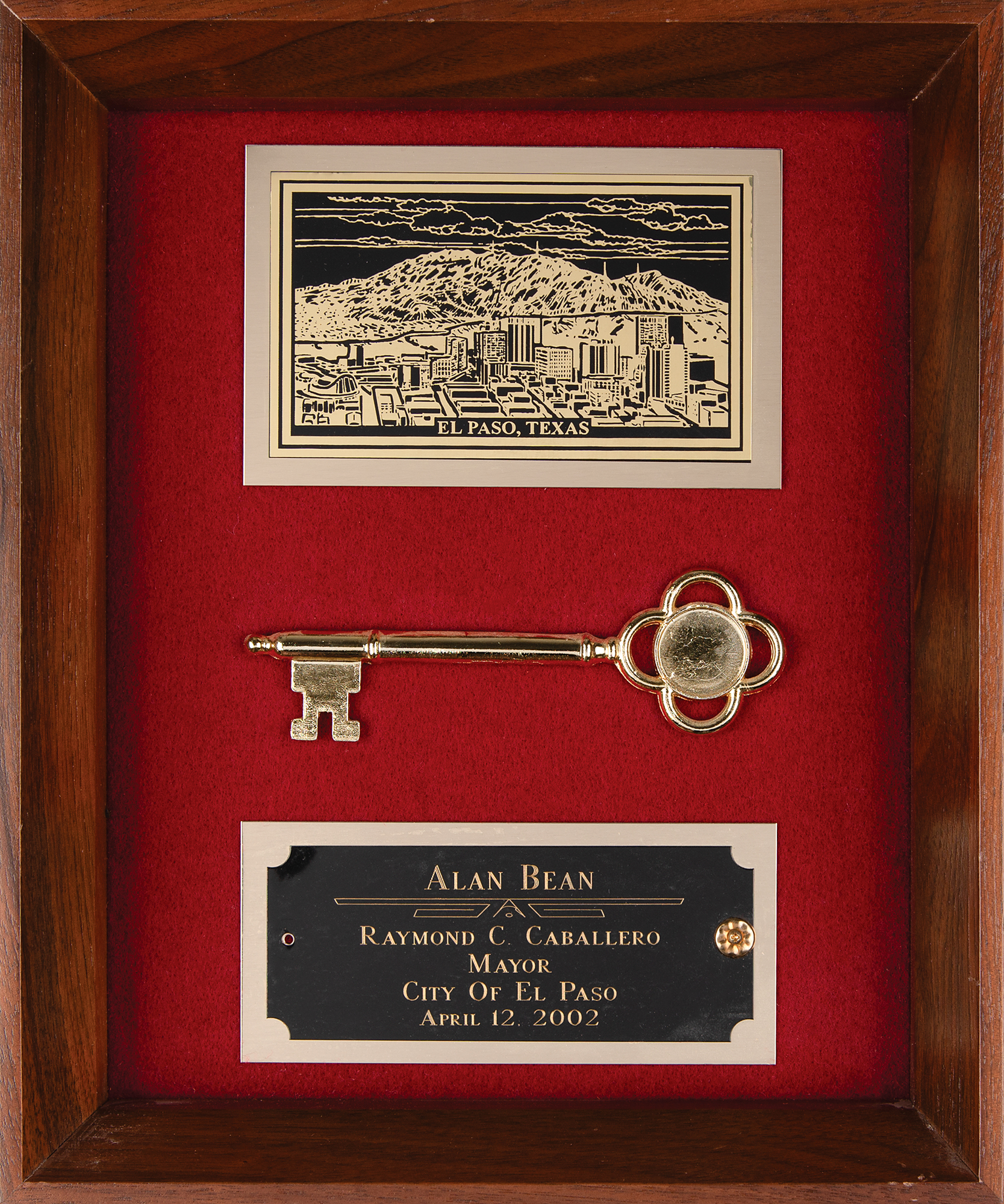 Gold-tone honorary key to the city of El Paso, Texas, presented to Apollo 12 moonwalker Alan Bean, measuring 5.5˝ long, mounted on its original wooden display frame, 10˝ x 12˝ x 2˝, which also contains a pictorial plaque of El Paso and an engraved presentation plate that reads: “Alan Bean, Raymond C. Caballero, Mayor, City of El Paso, April 12, 2002.” In fine condition. Accompanied by a letter of authenticity from Amy Bean, the daughter of Alan Bean.