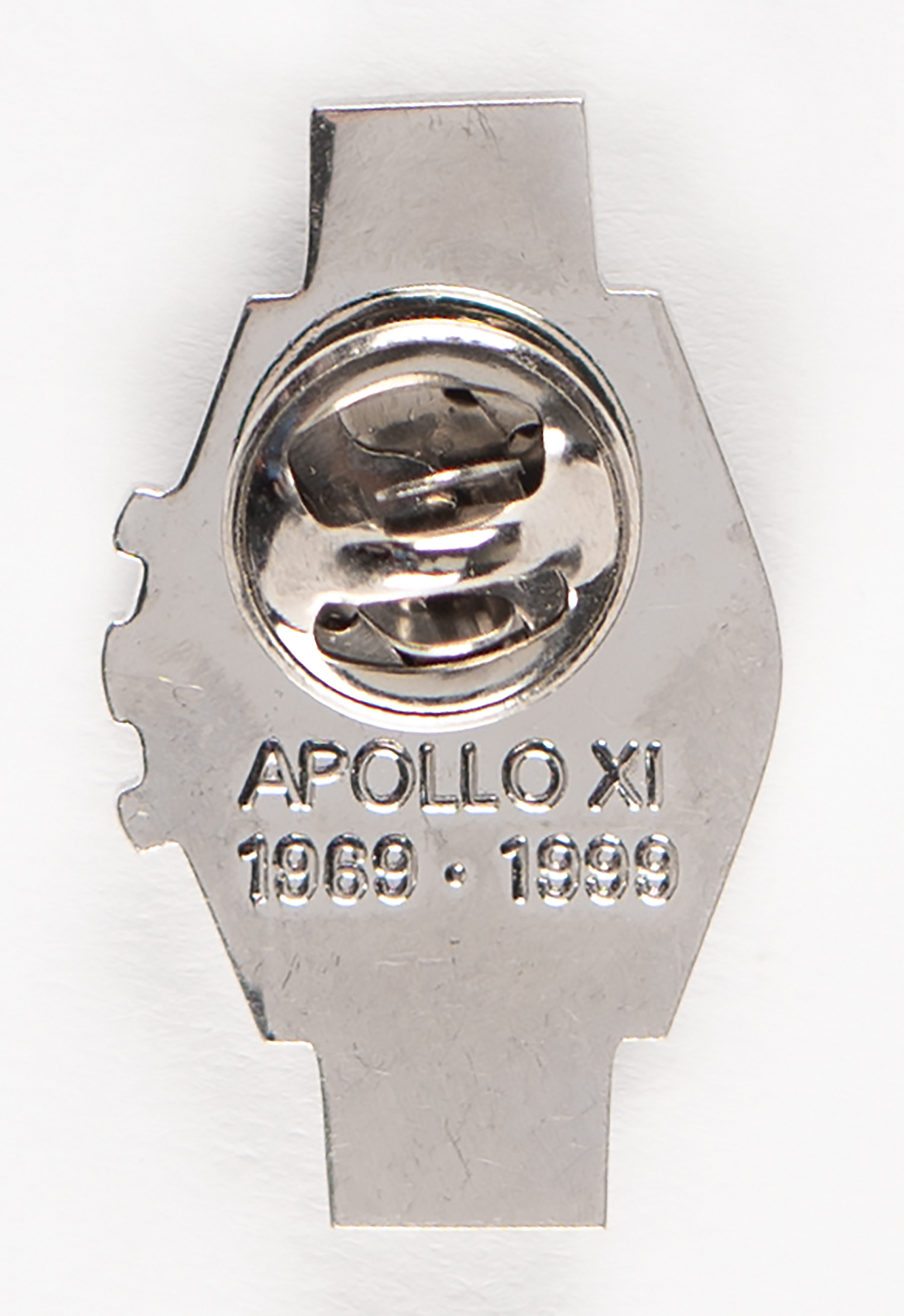 Alan Bean’s Apollo 11 30th anniversary lapel pin in the shape of an Omega Speedmaster wristwatch, .75˝ x 1.25˝, the reverse of which is engraved: “Apollo XI, 1969-1999.” In fine condition. Accompanied by a letter of authenticity from Amy Bean, the daughter of Alan Bean.