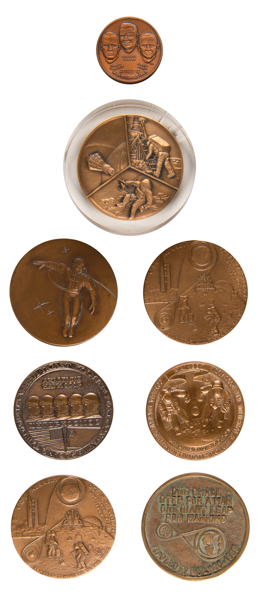 Alan Bean’s collection of eight commemorative medallions, bronze and copper, ranging in size from 1.5˝ to 2.5˝ in diameter, and in weight from 37 to 243 gm, each featuring attractive embossed designs honoring American and Soviet achievements in space, including: an Apollo 12 medallion (with original Wellings case); two Apollo 12 medals by the Medallic Art Company; a Voskhod 2 medal; an Apollo–Soyuz Test Project medal; a medal from the Romanian Commission for Space Activities (Intercosmos Council) honoring the Soyuz 40 mission; a McDonnell Douglas Astronautics Company medal honoring ‘Man’s Conquest of Space, One Giant Step (encased in Lucite); and an Apollo 11 medal with an equation to the reverse. In overall fine condition. Accompanied by a letter of authenticity from Amy Bean, the daughter of Alan Bean.