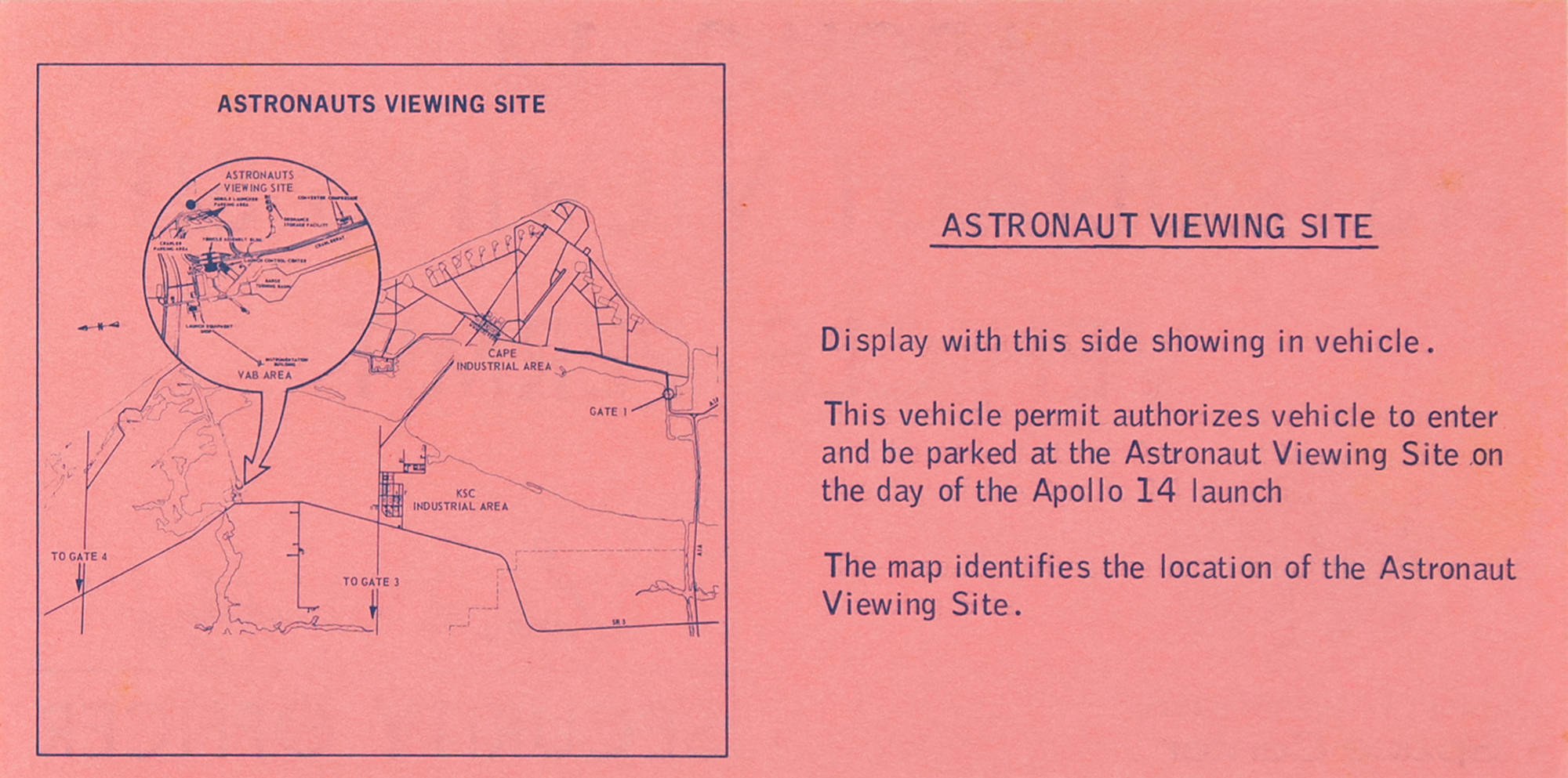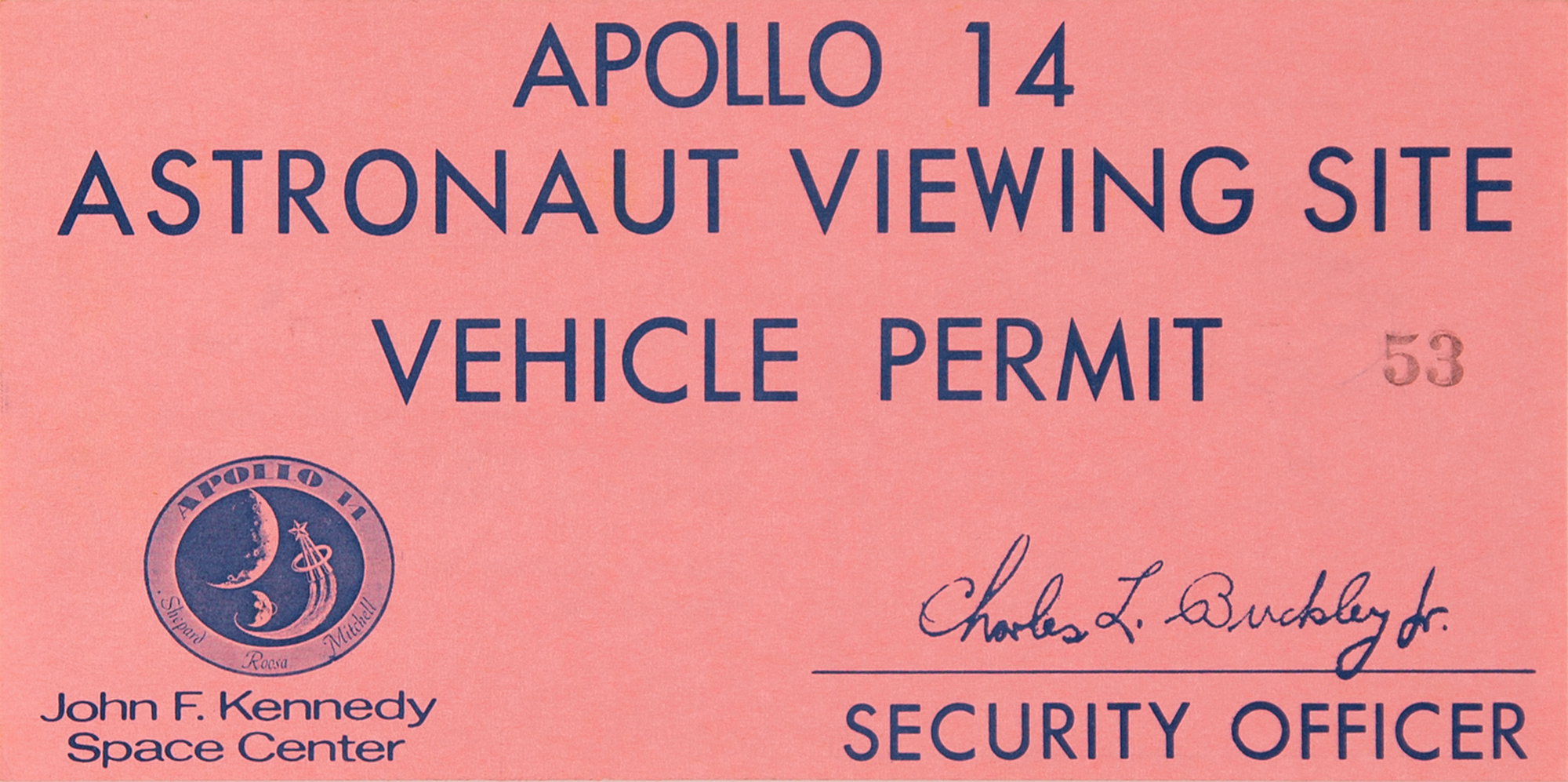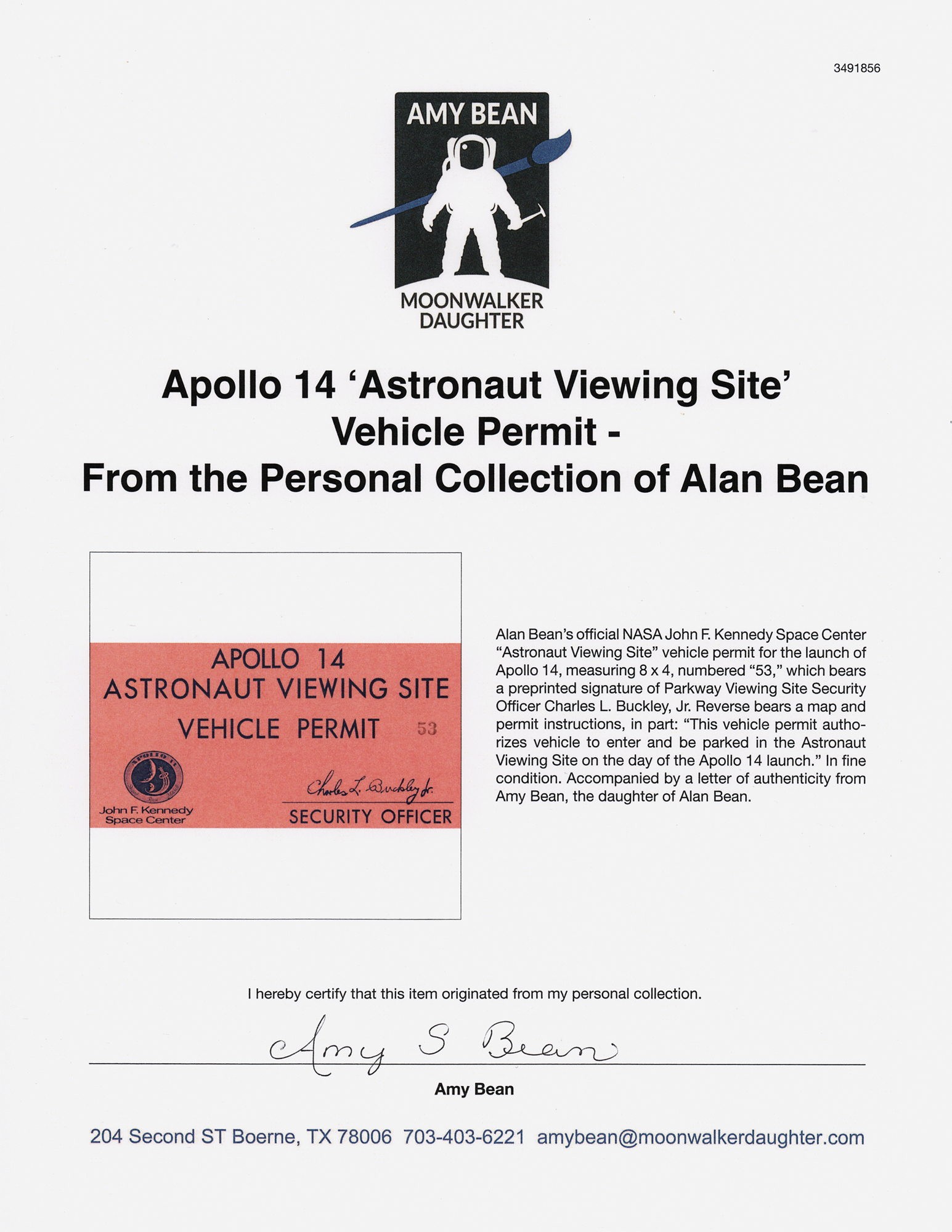 Alan Bean’s official NASA John F. Kennedy Space Center “Astronaut Viewing Site” vehicle permit for the launch of Apollo 14, measuring 8 x 4, numbered “53,” which bears a preprinted signature of Parkway Viewing Site Security Officer Charles L. Buckley, Jr. Reverse bears a map and permit instructions, in part: “This vehicle permit authorizes vehicle to enter and be parked in the Astronaut Viewing Site on the day of the Apollo 14 launch.” In fine condition. Accompanied by a letter of authenticity from Amy Bean, the daughter of Alan Bean.