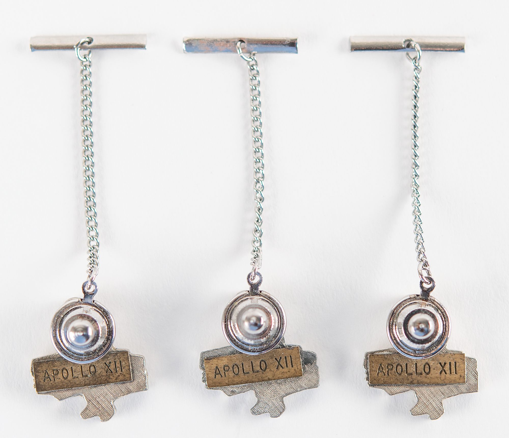 Alan Bean’s set of three sterling silver tie tacks honoring the Apollo 12 mission, each .75˝ x .75˝, showing an astronaut with an orange visor carrying the Apollo Lunar Surface Experiments Package (ALSEP). The reverse of each bears a small engraved plaque that reads: “APOLLO XII.” In overall fine condition. Accompanied by a letter of authenticity from Amy Bean, the daughter of Alan Bean.
