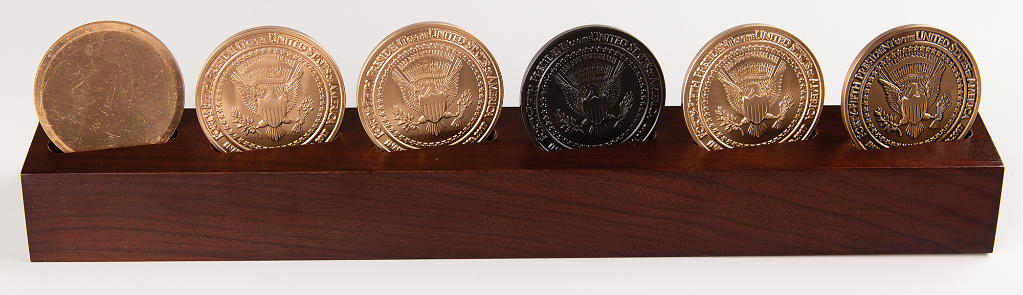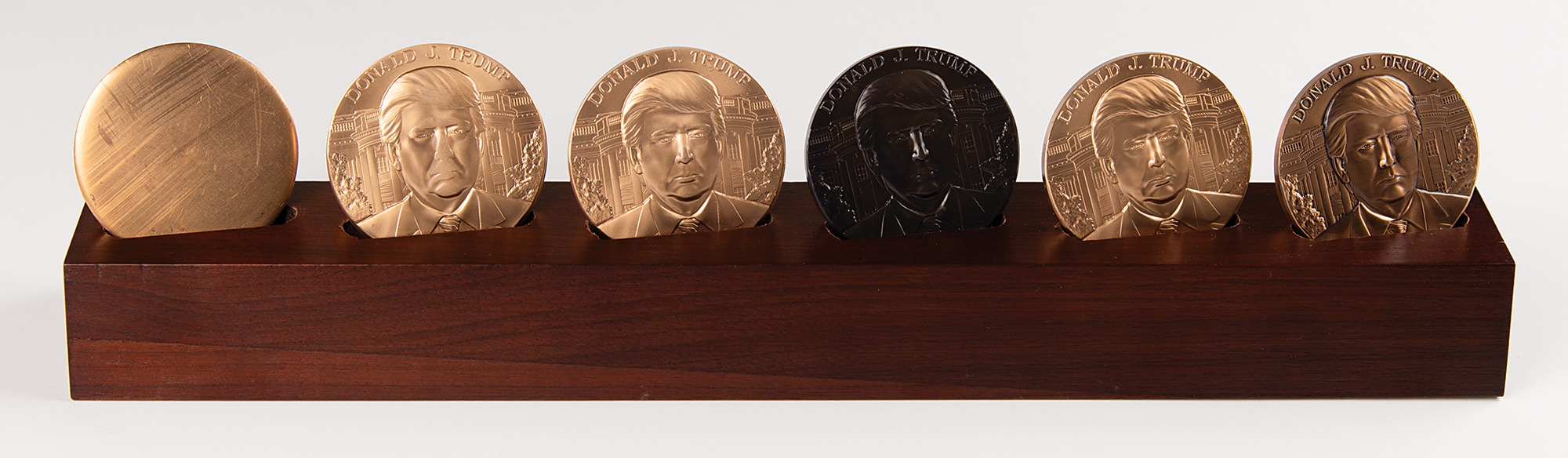 Exceedingly rare 'process' set of 2017 inaugural medals commemorating Donald Trump's swearing-in as president, showing the progression of the medal's design from raw bronze planchet to finished medal. The six-piece set demonstrates the several-step process of striking and finishing the historic medal: the first strike lacks detail in the high-relief surfaces (especially in Trump's nose on the obverse and in details in the seal on the reverse) while the later examples show finer details and the steps in the coating and finishing process, adding shadows and highlights to the medal's surfaces. The last medal is the finished version, with a "Medalcraft Mint" hallmark stamped on the bottom edge. Each medal measures 2.75˝ in diameter and weighs about 170 grams. Complete with their wooden display stand.