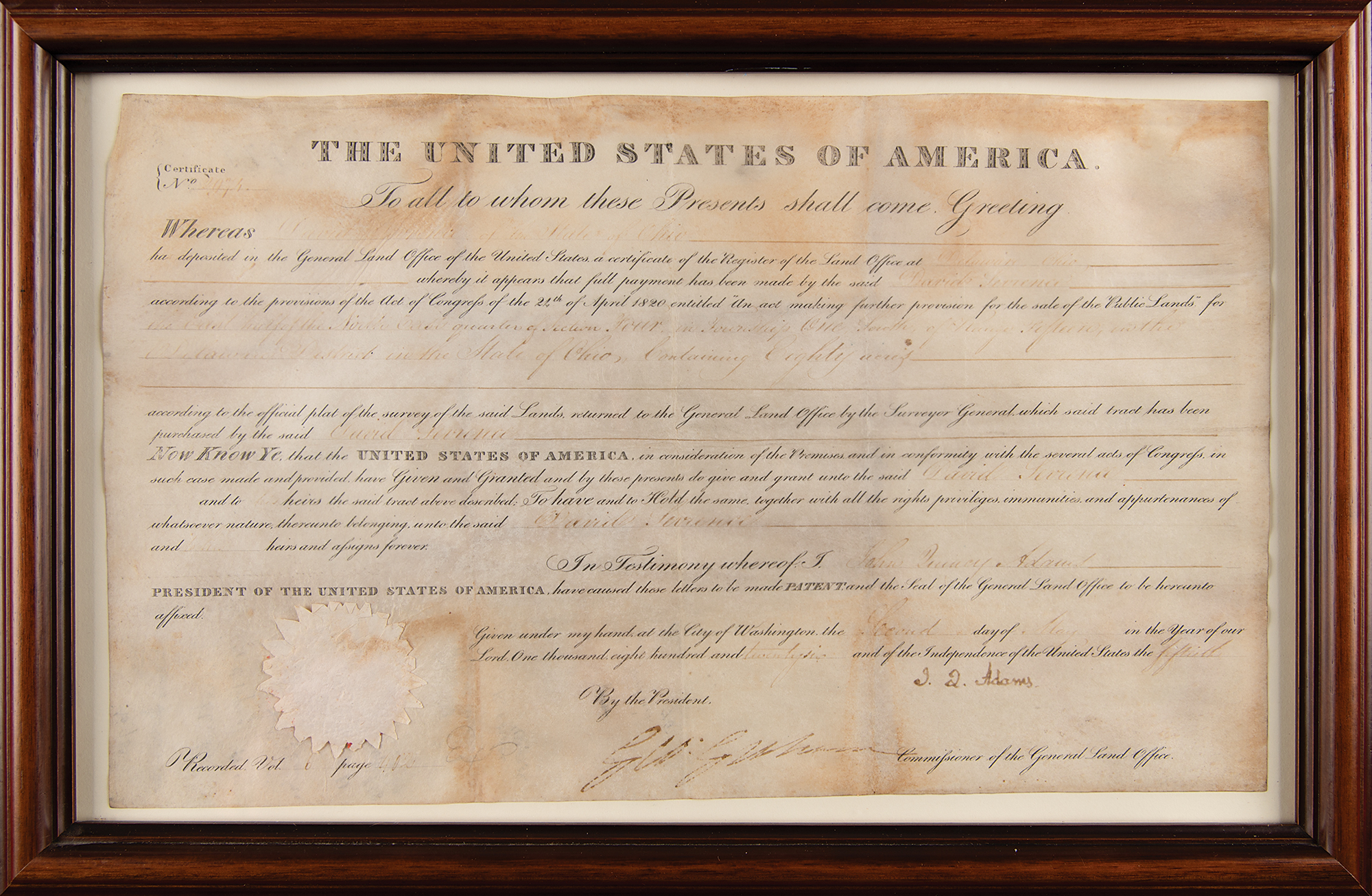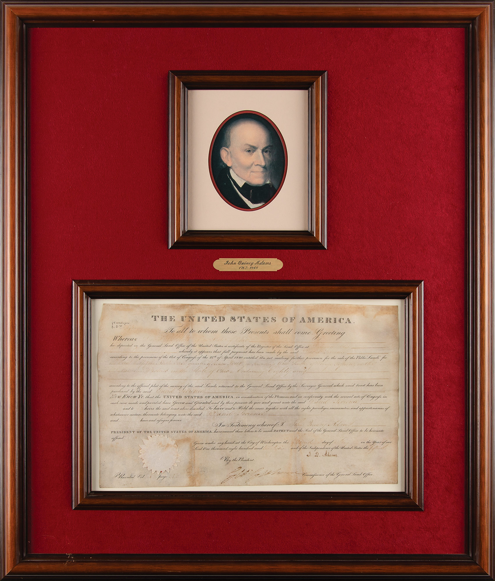 Partly-printed vellum DS as president, signed “J. Q. Adams,” one page, 15.5 x 9.25, May 2, 1826. President Adams grants a plot of land "in the State of Ohio, Containing Eighty acres." Nicely signed at the conclusion in ink by President John Quincy Adams, and countersigned by Commissioner of the General Land Office George Graham. Attractively mounted, suede-matted, and framed with a portrait and plaque to an overall size of 26 x 30.5. In very good to fine condition, with scattered soiling, staining, and toning.