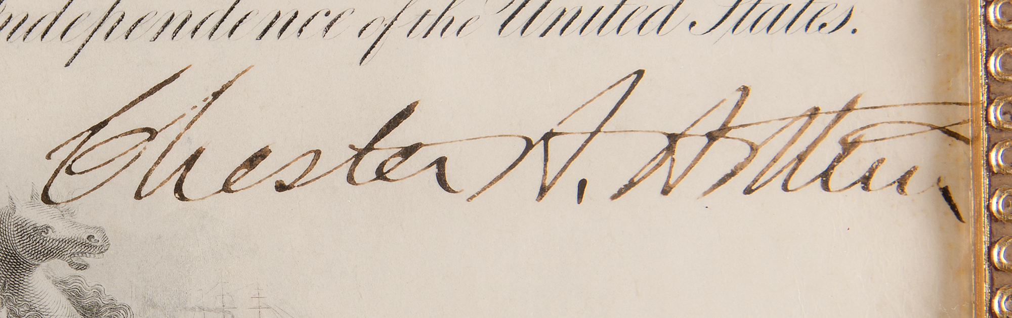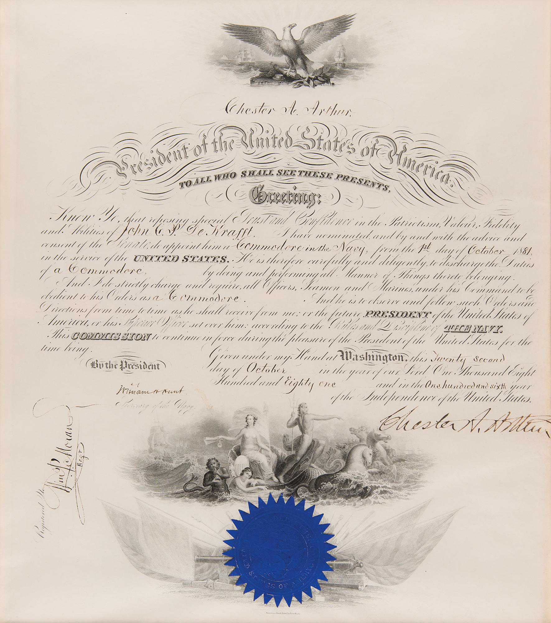 Partly-printed vellum DS as president, one page, 15 x 17.5, October 22, 1881. President Arthur appoints John C. P. DeKraft as "a Commodore in the Navy." Boldly signed at the conclusion in ink by President Chester A. Arthur, and countersigned by Secretary of the Navy William H. Hunt. The blue seal affixed at the bottom remains fully intact. Handsomely cloth-matted and framed with a portrait and plaque to an overall size of 30 x 25.5. In fine condition.