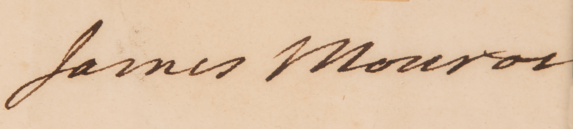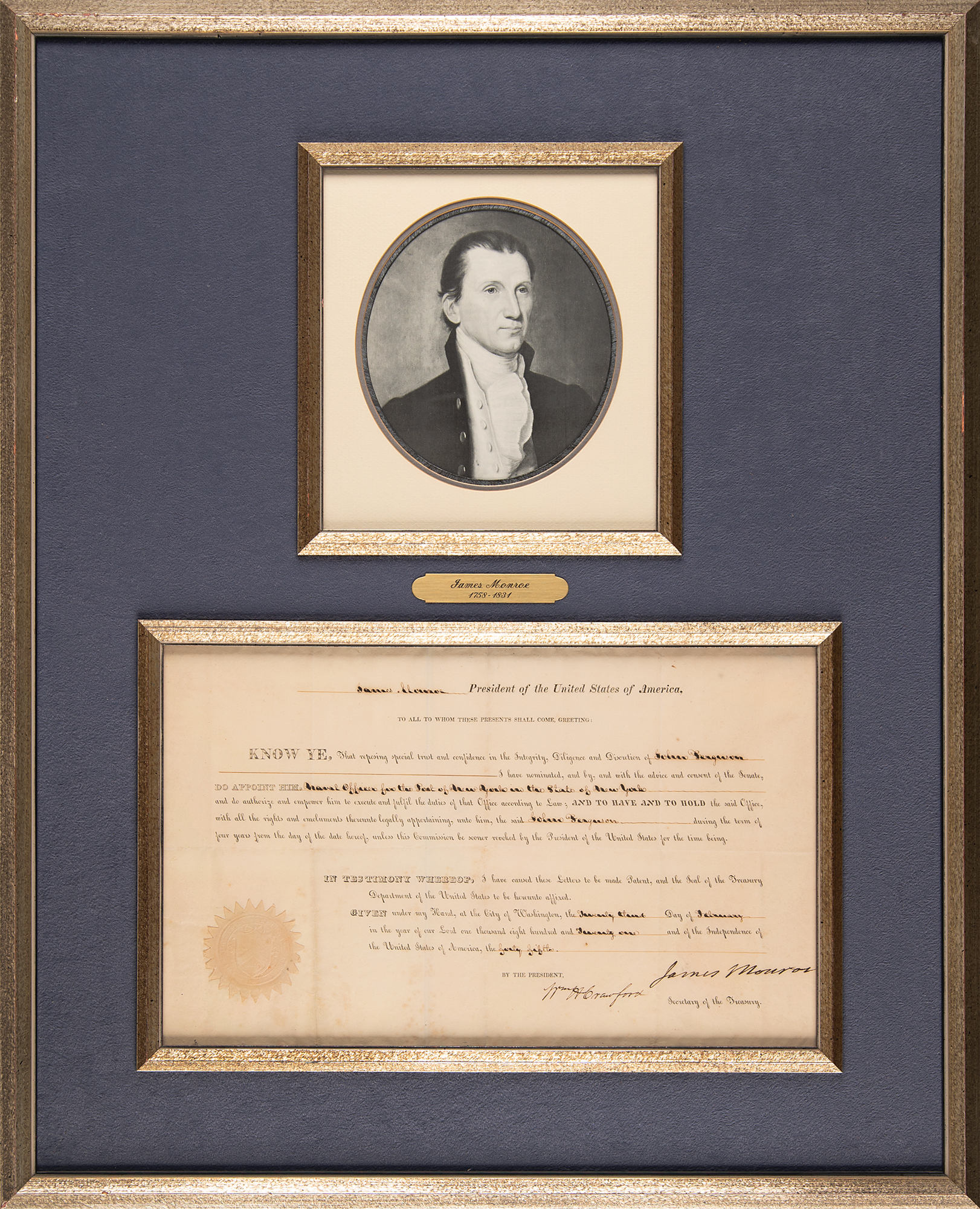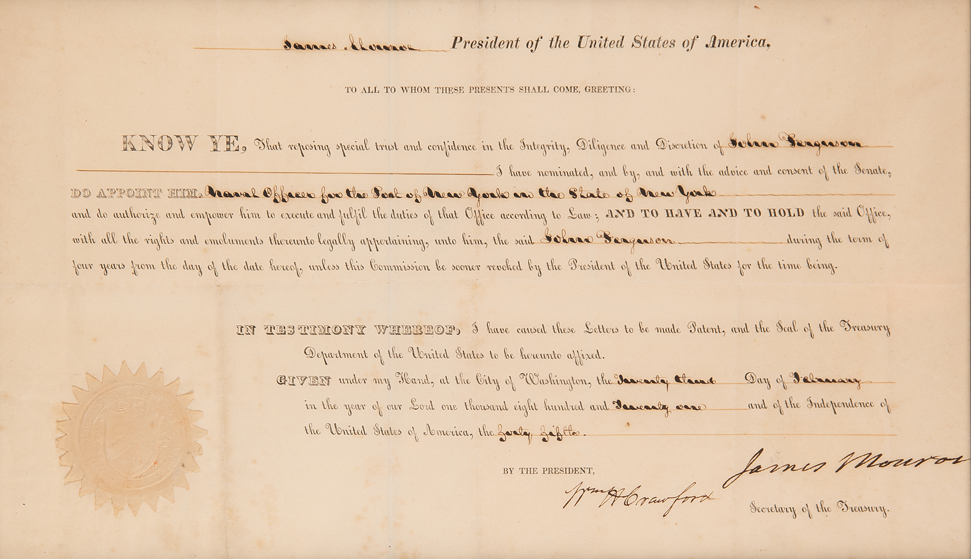 Partly-printed DS as president, one page, 14.75 x 9, February 23, 1821. President Monroe appoints John Ferguson as "Naval Officer for the Port of New York in the State of New York." Boldly signed at the conclusion by President James Monroe, and countersigned by Secretary of the Treasury William H. Crawford. The white paper seal affixed at the lower left remains intact. Handsomely suede-matted and framed with a portrait and plaque to an overall size of 22 x 24. In fine condition.