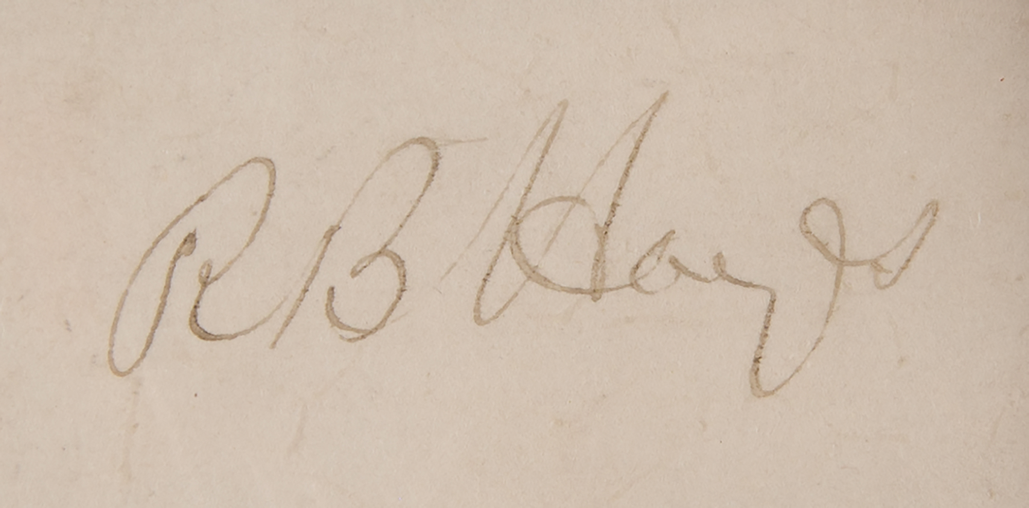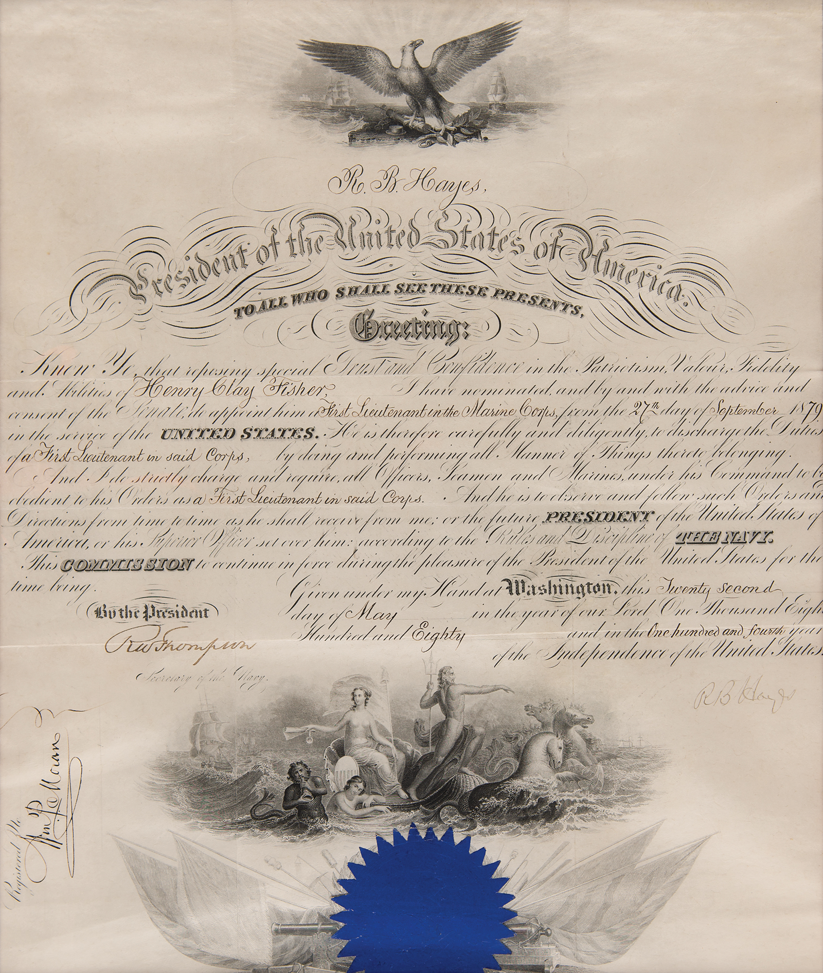 Partly-printed vellum DS as president, signed “R. B. Hayes,” one page, 13.25 x 16, May 22, 1880. President Hayes appoints Henry Clay Fisher as "a First Lieutenant in the Marine Corps." Neatly signed at the conclusion in ink by President Rutherford B. Hayes, and countersigned by Secretary of the Navy Richard W. Thompson. The blue seal affixed at the bottom remains intact. Nicely cloth-matted and framed with a portrait and plaque to an overall size of 27.5 x 23.5. In fine condition.