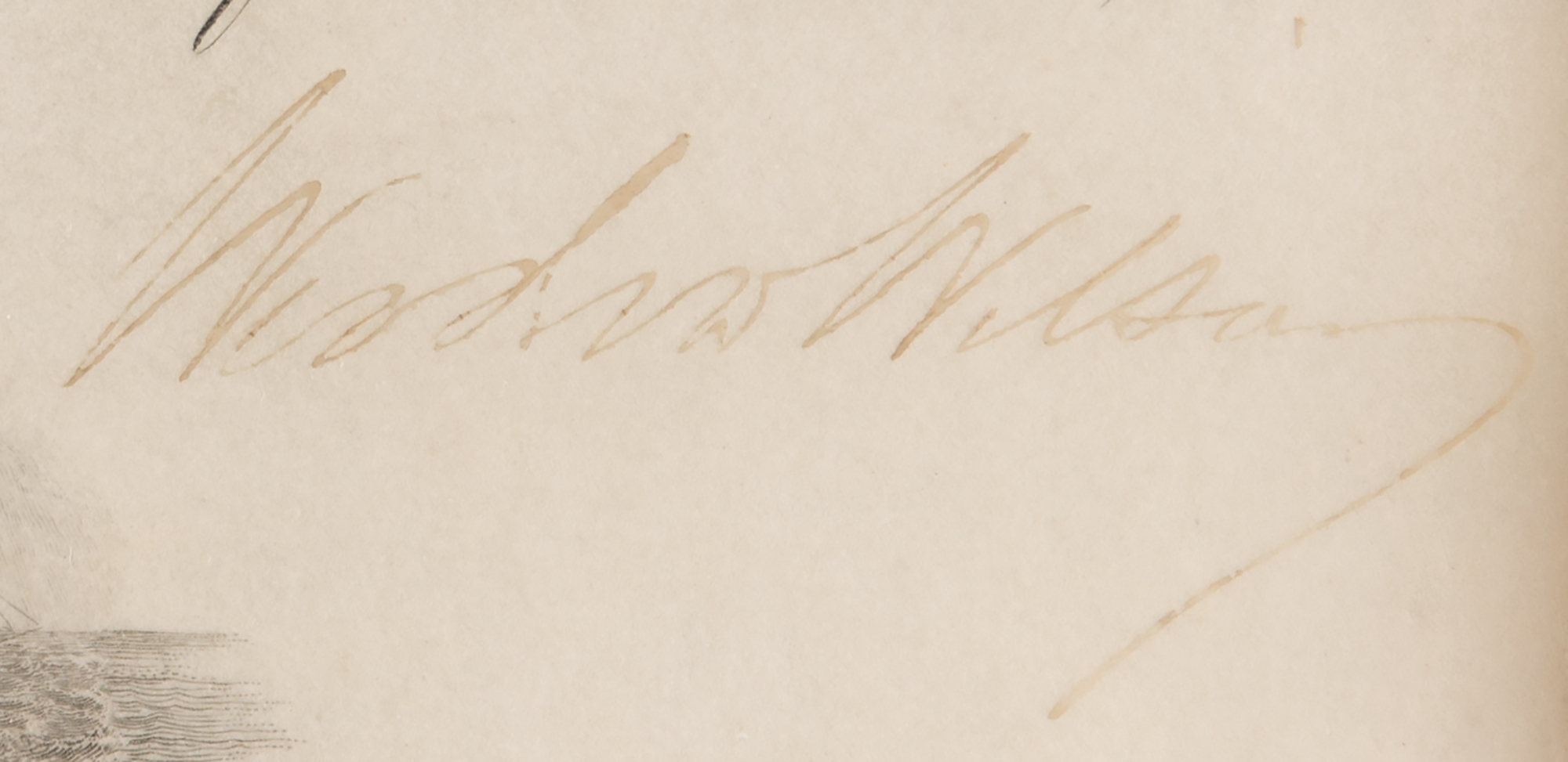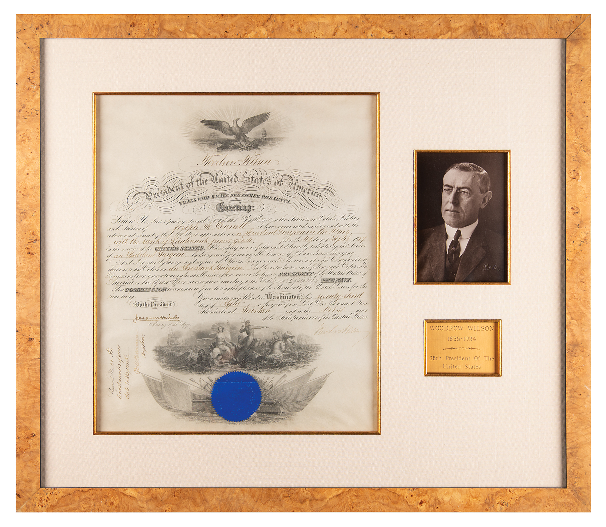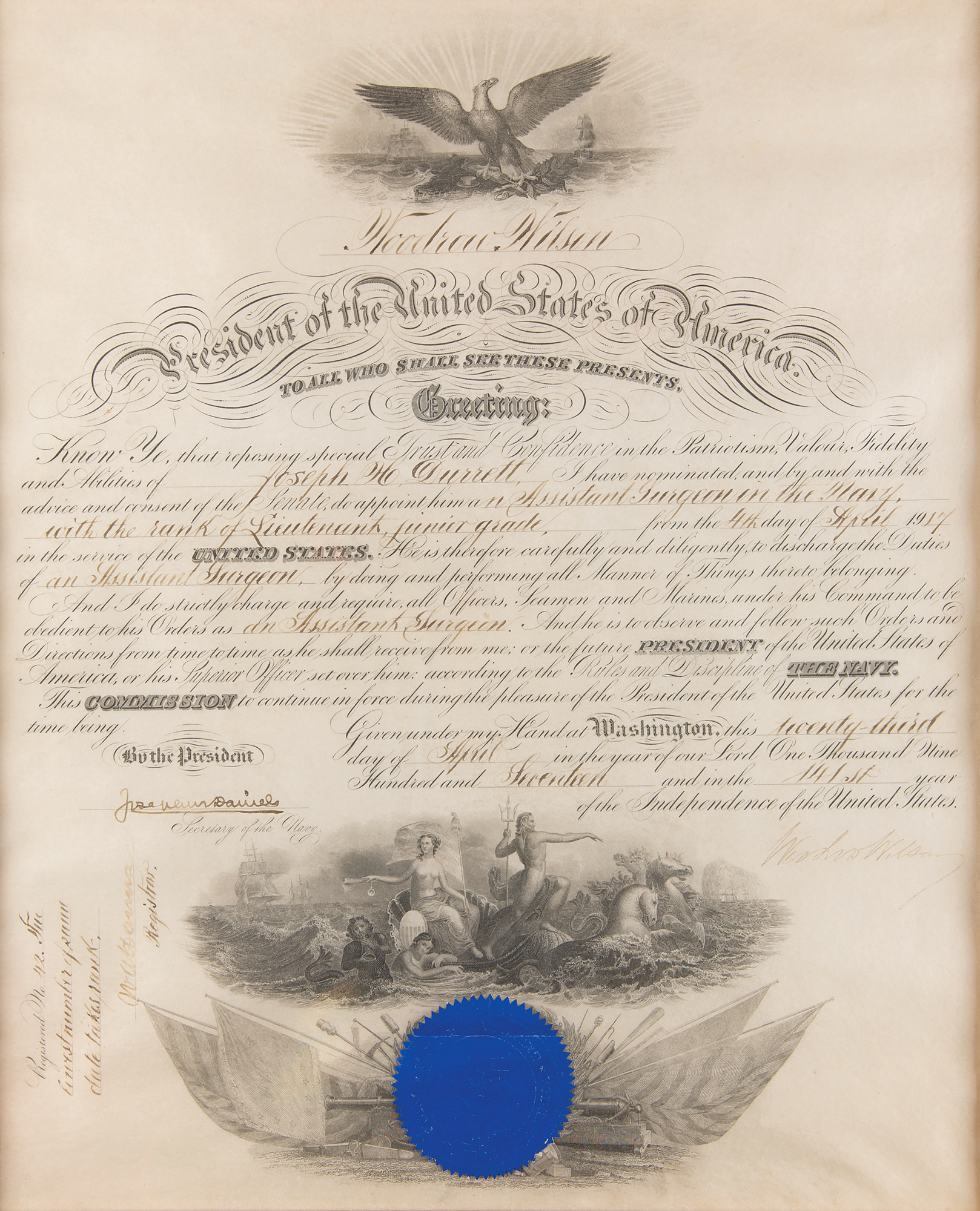 Partly-printed vellum DS as president, one page, 14.25 x 17.25, April 23, 1917. President Wilson appoints Joseph H. Durrett as "an Assistant Surgeon in the Navy." Signed at the conclusion in ink by President Woodrow Wilson, and countersigned by Secretary of the Navy Josephus Daniels. The blue seal affixed at the bottom remains intact. Beautifully cloth-matted and framed with a portrait and plaque to an overall size of 29.5 x 25.5. In fine condition, with Wilson's signature a few shades light.