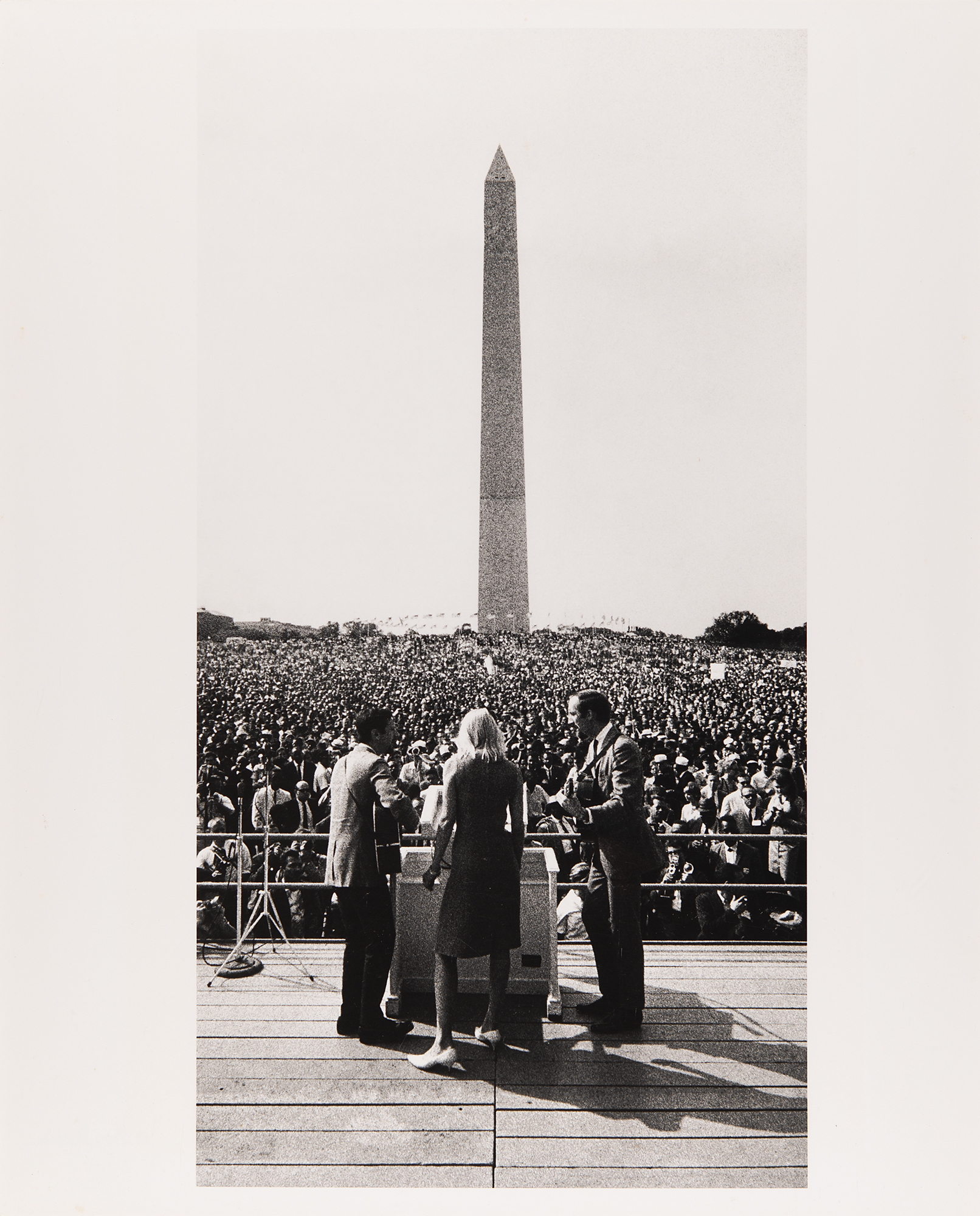 From the personal collection of legendary rock photographer Barry Feinstein—an original semi-glossy 16 x 20 silver gelatin photograph of Peter, Paul and Mary performing the March on Washington for Jobs and Freedom on August 28, 1963, with the imposing Washington Monument towering over the massive crowd. Signed and titled on the reverse in pencil by the photographer, "Barry Feinstein, Peter, Paul & Mary, March on Washington, Aug. 1963," beneath Feinstein's copyright stamp. In very fine condition.