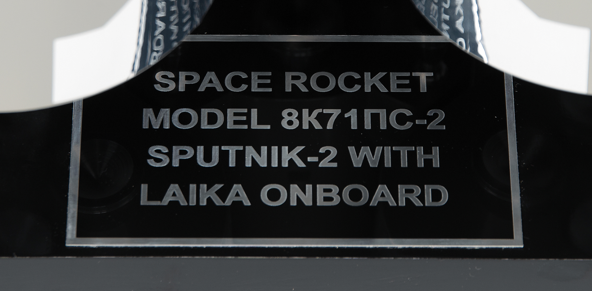 Impressive 1:19 scale presentation model of the two-stage Sputnik 2 8K71PS launch vehicle. This custom handmade model, constructed of metal and plastic composite, stands approximately 62˝ tall and is set on an attractive 12.75˝ x 12.75˝ x 1.25˝ base with descriptive plaque: “Space Rocket, Model 8K71ПC-2, Sputnik-2 with Laika Onboard.” The stunning two-piece model features the Sputnik 2 with Laika protected below its cone-shaped payload fairing and seated atop the payload base, with a lower core stage and four massive boosters. In fine condition, some wear to base.