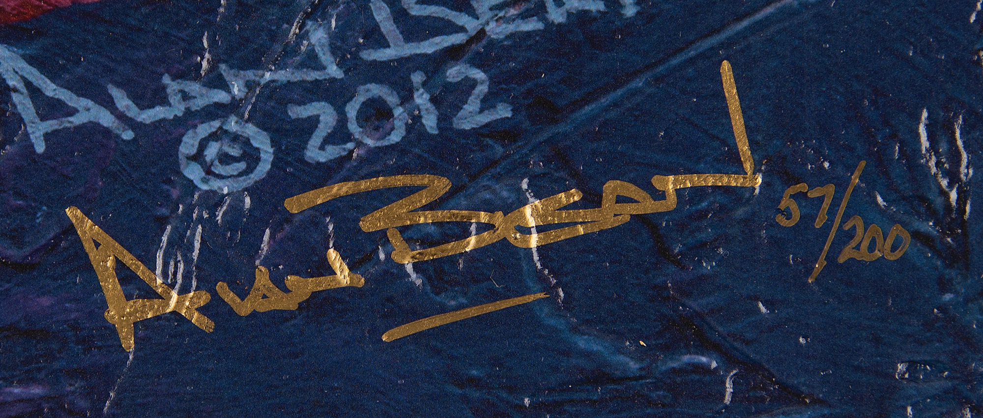 Fantastic limited edition color 24 x 16 textured print on stretched canvas of an Alan Bean painting entitled 'First Flag,' numbered 57/200, signed in gold ink, "Alan Bean." The artwork portrays the flag of the United States that Neil Armstrong planted on the moon during the Apollo 11 mission, marking man's first footsteps on another celestial body. In very fine condition. Accompanied by a certificate of authenticity from The Greenwich Workshop.