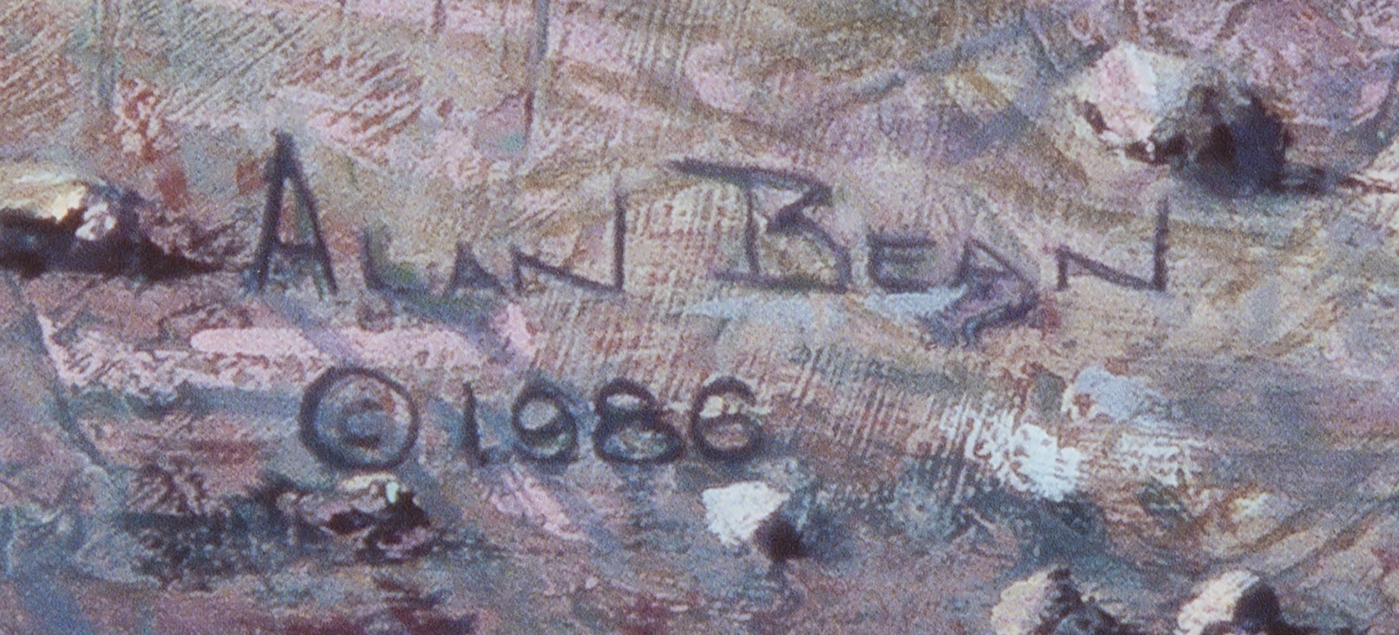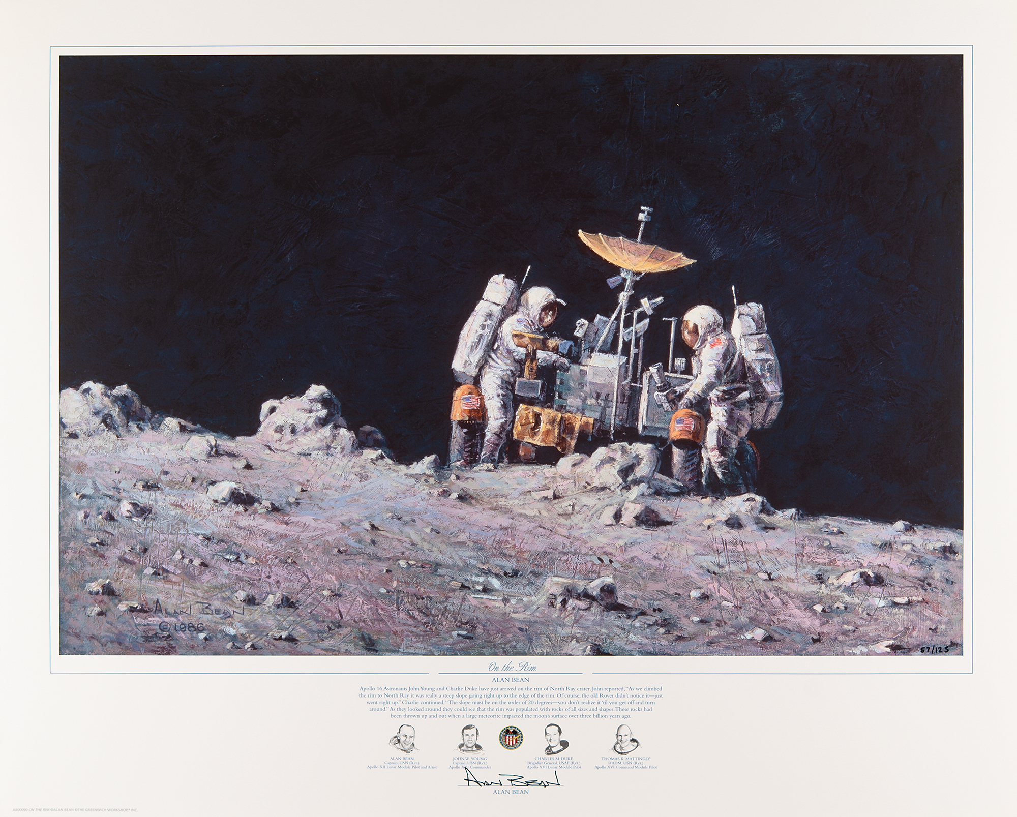 Color limited edition 26 x 21 lithograph of an Alan Bean painting entitled 'On the Rim,' numbered 57/125, signed in the lower border in black felt tip. The artwork shows Apollo 16 astronauts John Young and Charlie Duke with the LRV after arriving on the rim of North Ray Crater. In very fine condition. Accompanied by a certificate of authenticity from The Greenwich Workshop.