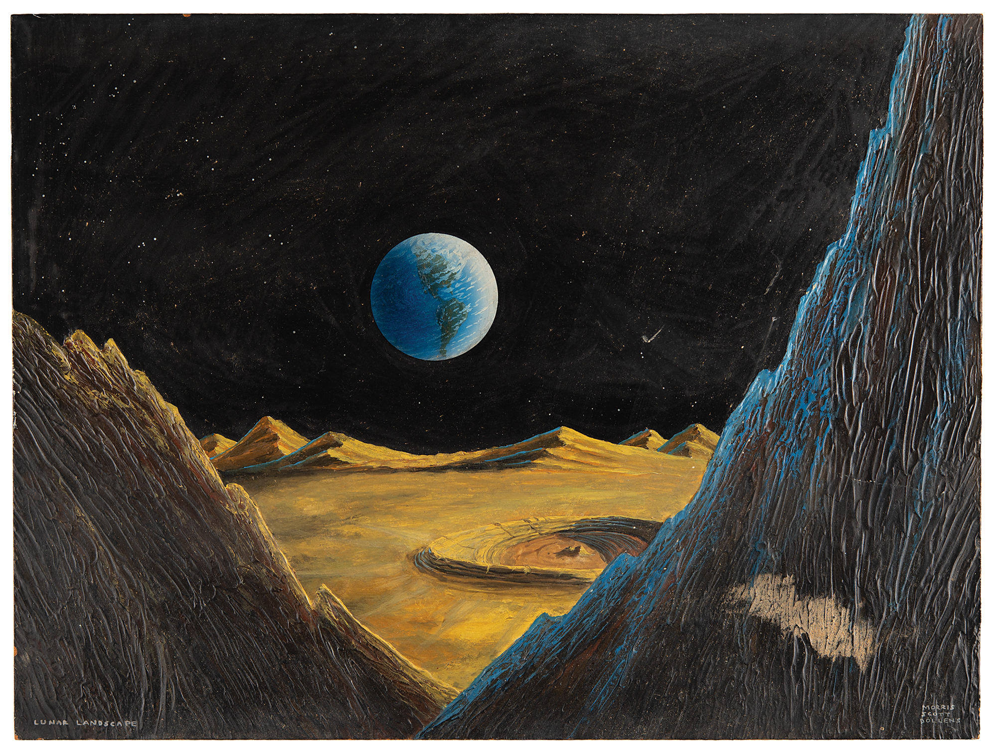 American painter and writer of science fiction (1920–1994) celebrated for the artwork he created for science fiction books and magazines in the 1950s. Original circa 1980s planetscape painting accomplished by Morris Scott Dollens in colorful casein paints on a 20 x 15 board, titled and signed in the lower corners in paint by the artist, "Lunar Landscape, Morris Scott Dollens." The painting portrays a hilly lunar landscape with Earth in the distance, framed by tall, textured ridges. In very good to fine condition.