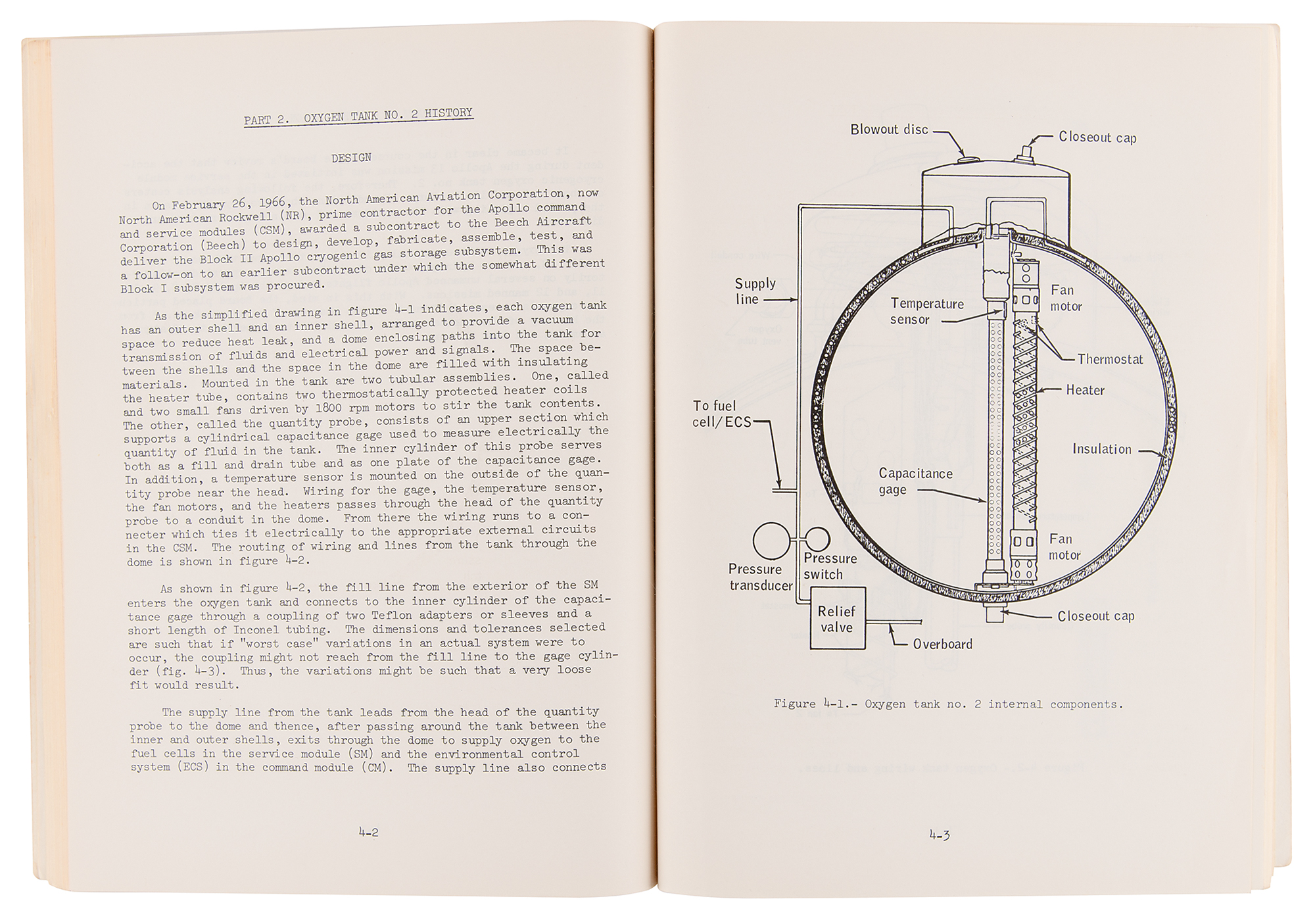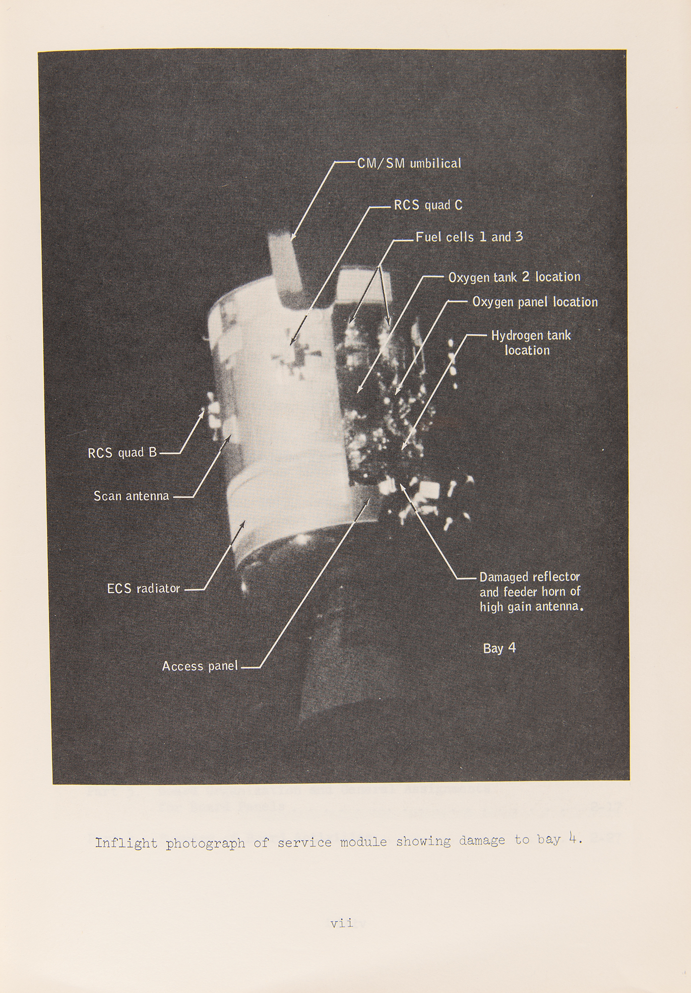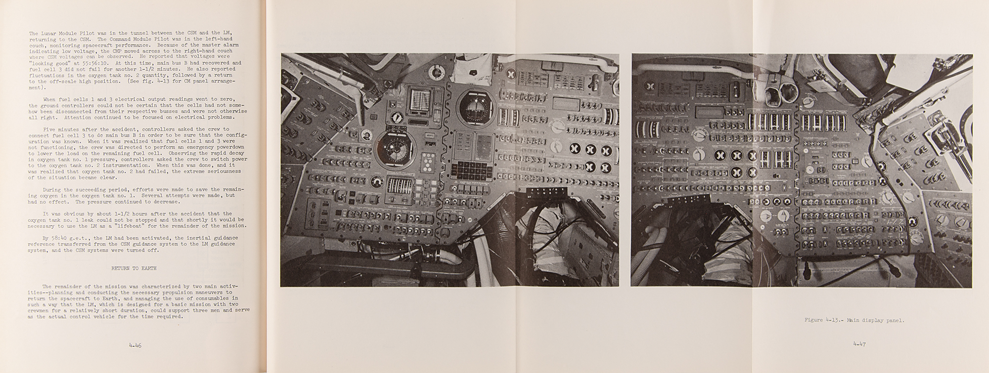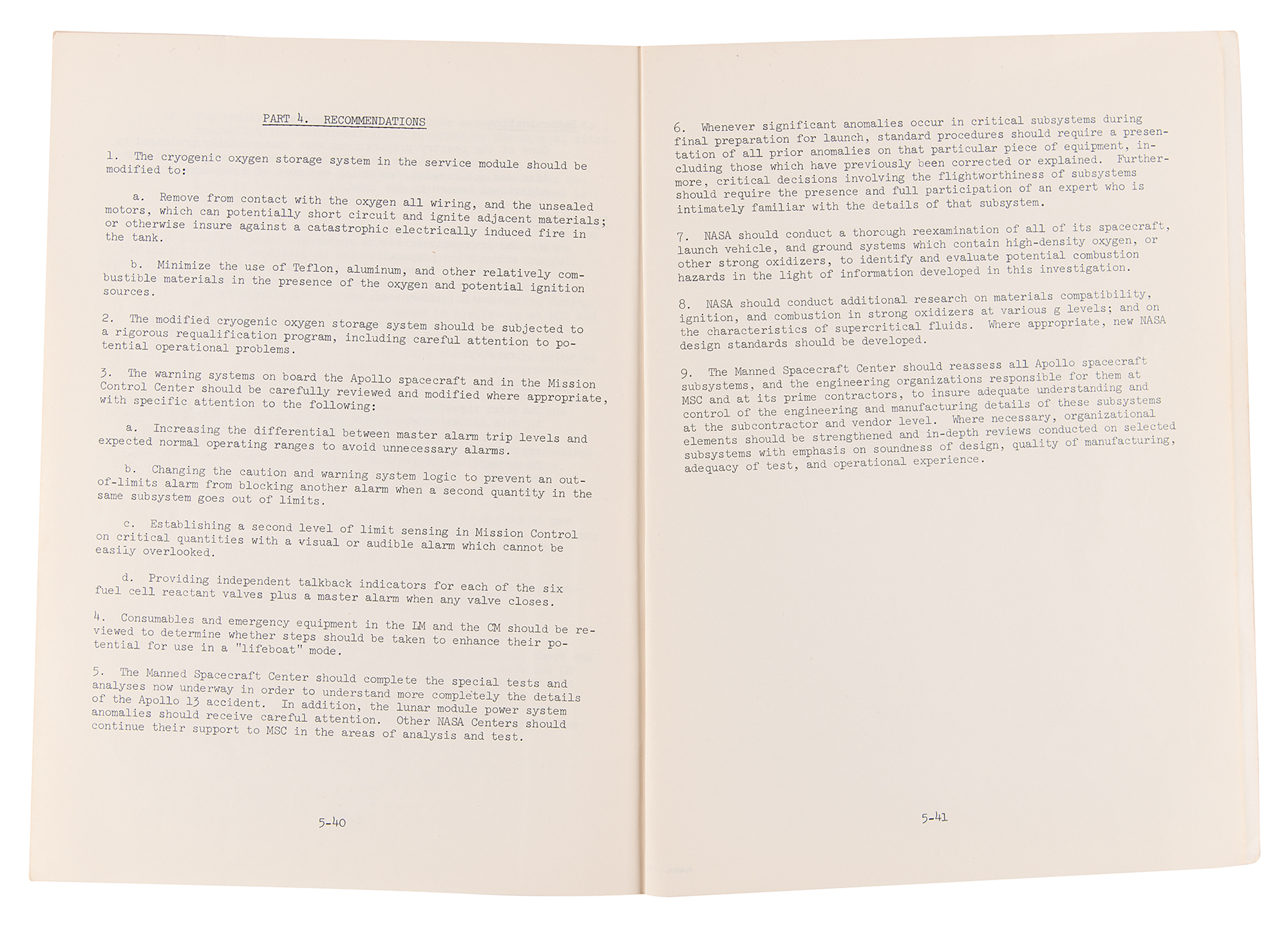 Staple-bound official report entitled "Report of Apollo 13 Review Board," 188 pages, 8 x 10.5, June 15, 1970, stamped "31" on the front cover and annotated in red felt tip, "PF1 James." The report documents the authority given to the Apollo 13 Review Board; outlines the board's history and procedures; provides a description of the Apollo 13 space vehicle and mission; offers a detailed a review, chronology, and analysis of the Apollo 13 accident; and provides findings, determinations, and recommendations. The report includes numerous schematics, charts, and diagrams related to the investigation. In fine condition, with light wear and staining to the covers.
