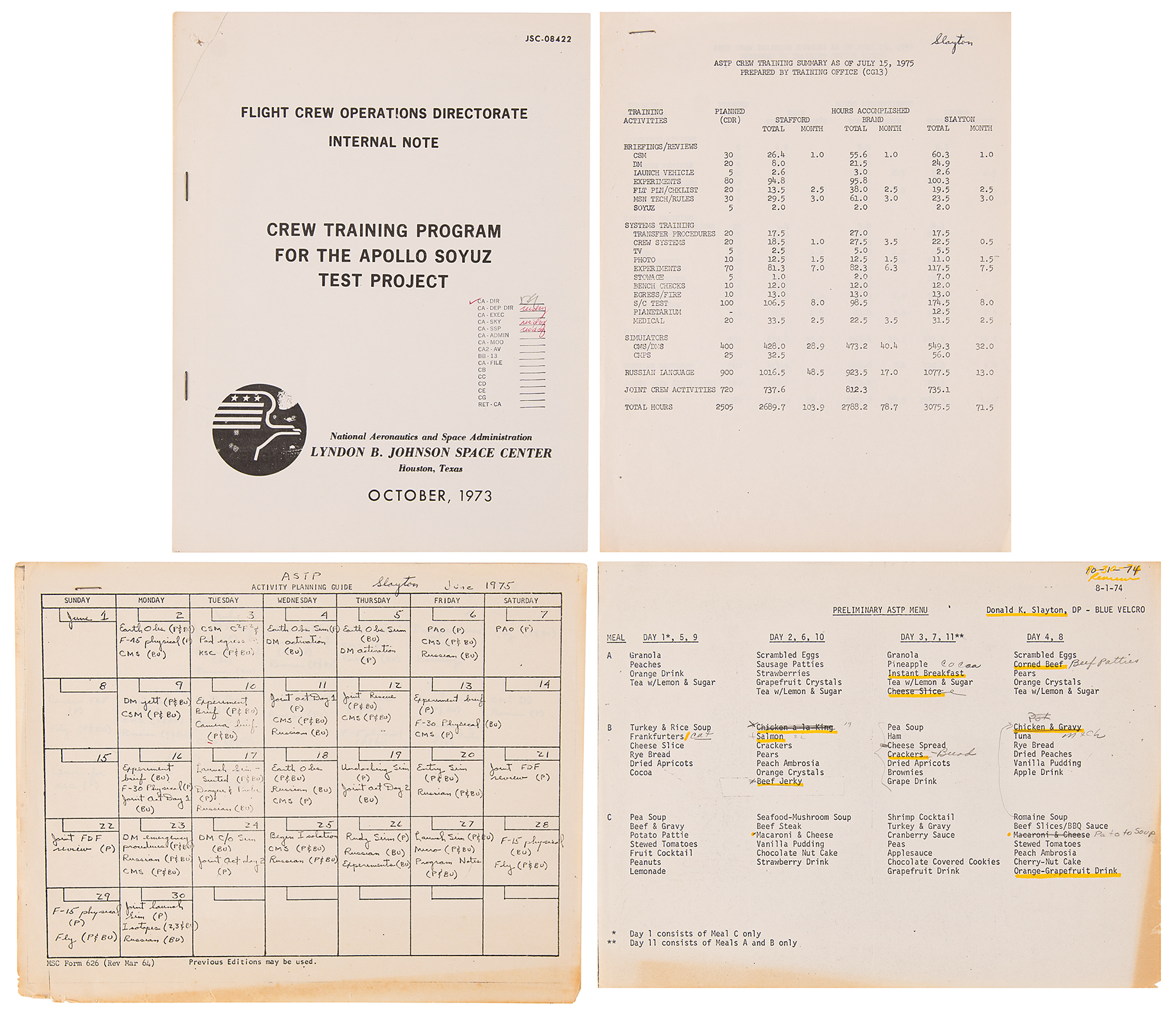 Apollo Soyuz Test Project training documents from the personal collection of Deke Slayton, including: a staple-bound ten-page "Crew Training Program for the Apollo Soyuz Test Project" internal note issued by the Flight Crew Operations Directorate, with distribution list stapled to the rear ("D. K. Slayton" checked off), initialed on the front cover in pencil by Deke Slayton; a "Preliminary ASTP Menu" for Slayton, documenting eleven days of meals; a two-page "ASTP Crew Training Summary as of July 15, 1975," documenting hours of training accomplished by the ASTP prime and backup crews, marked "Slayton" in another hand; and a two-page mimeographed "Activity Planning Guide" training calendar for June 1975, marked "Slayton" in another hand. In overall very good to fine condition.
