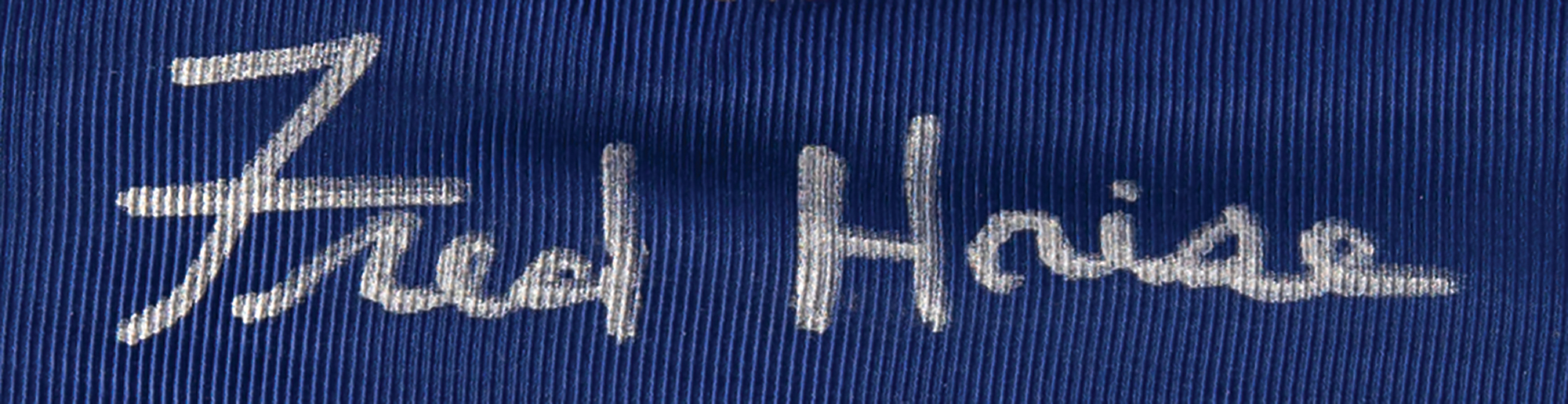 Replica of the Presidential Medal of Freedom, measuring 2.25˝ in diameter and suspended from a partial 14˝-long blue ribbon, signed on the ribbon in silver ink by the Apollo 13 LMP, "Fred Haise, MOF 4-18-70." The ribbon is taped at either end to a white board, and displayed with a glossy photo of the Apollo 13 crew receiving the Presidential Medal of Freedom from Richard Nixon in 1970. In fine condition.