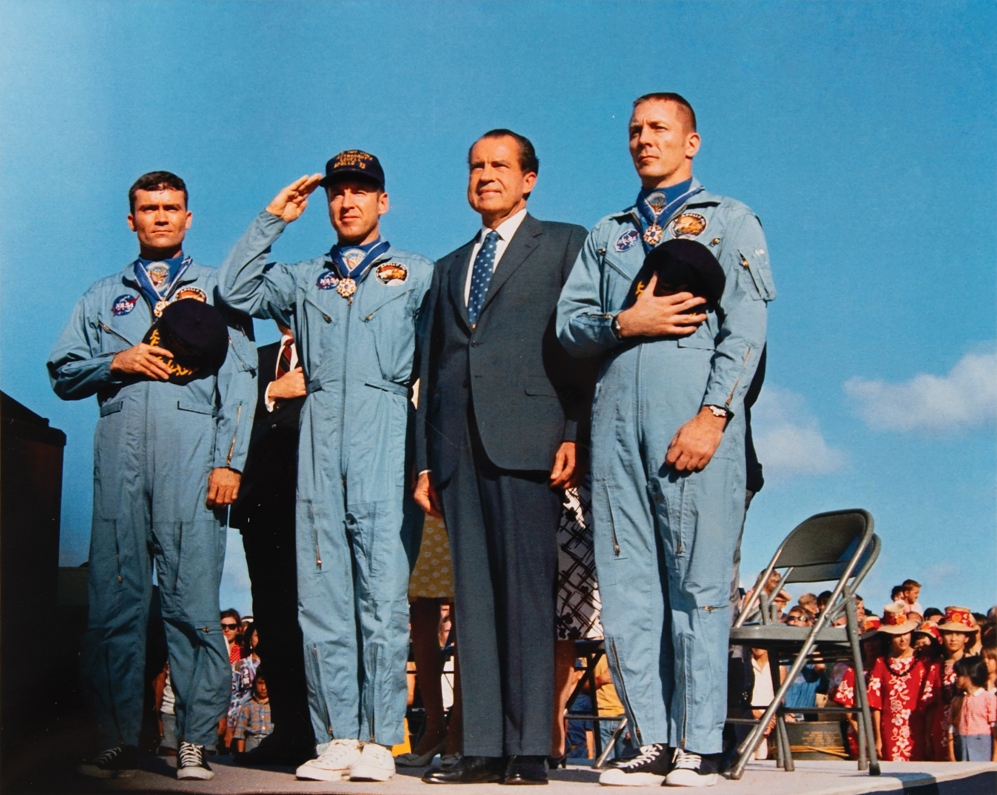 During the Apollo 13 Medal of Freedom ceremony, held on April 18, 1970—one day after the crew's safe return—President Nixon said: 'Never before in the history of man have more people watched together, prayed together, and rejoiced together at your safe return, than on this occasion.'