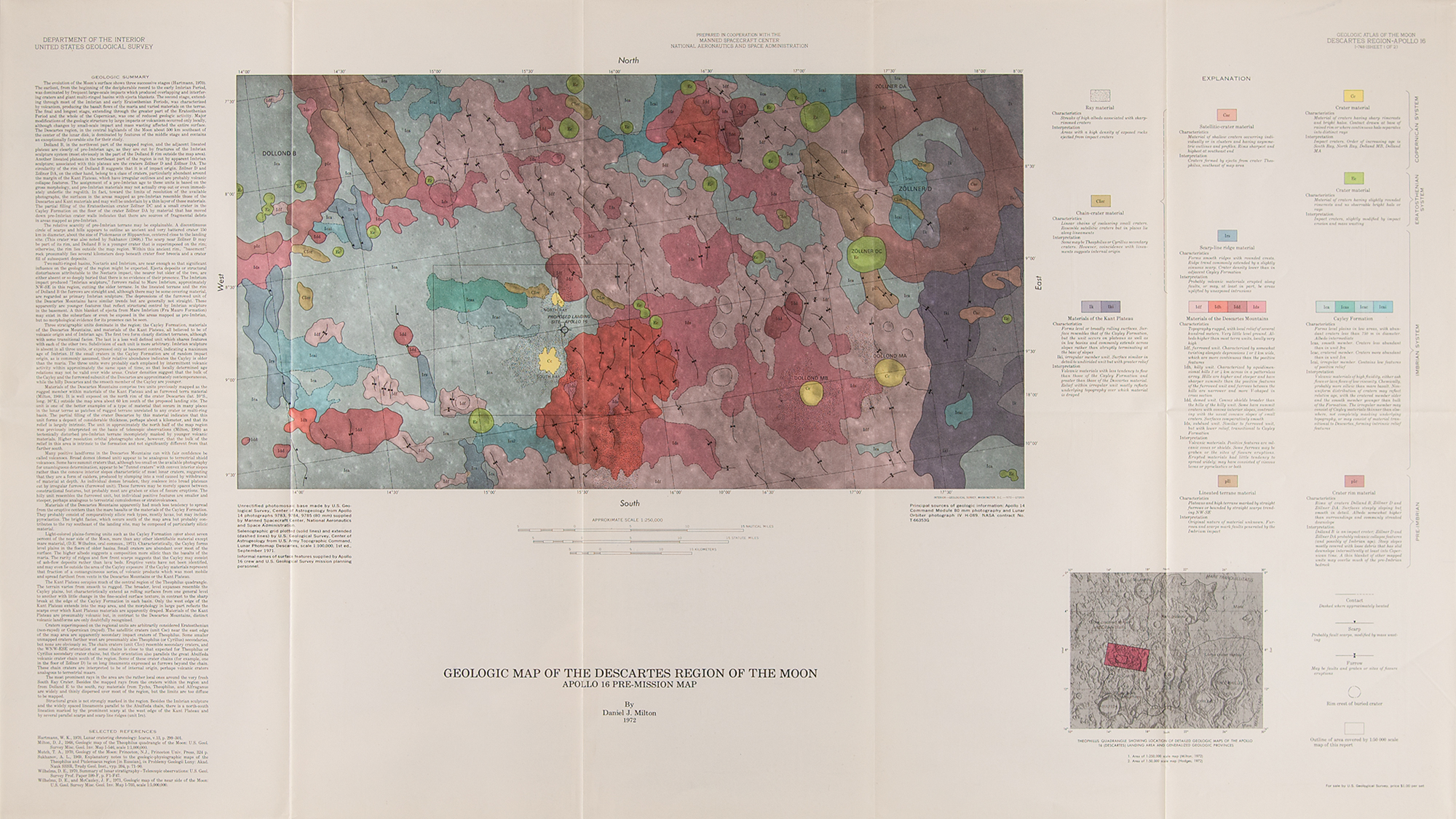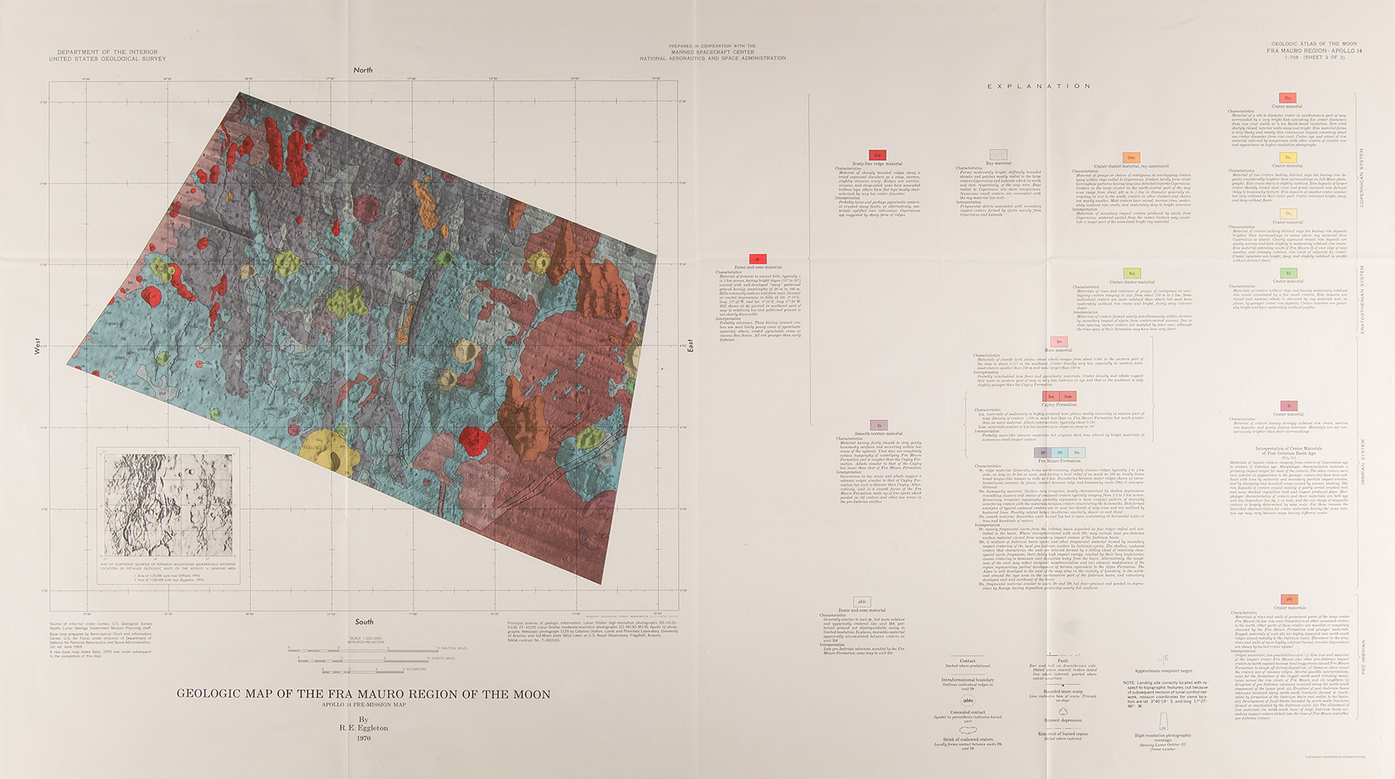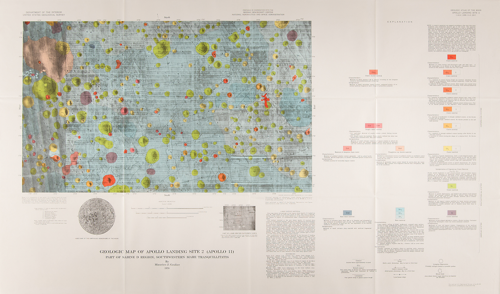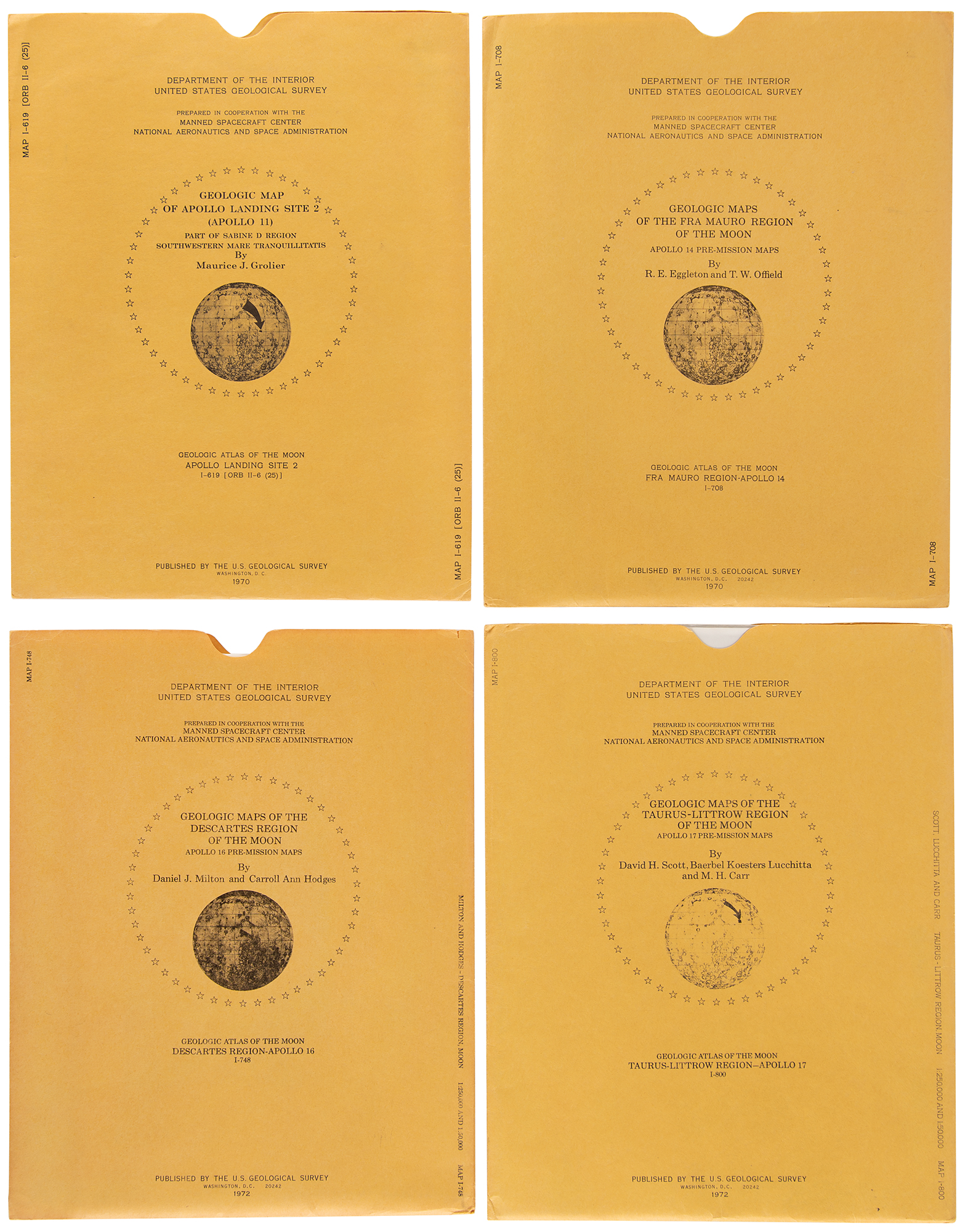 Group of four geological maps of the moon focusing on Apollo landing regions, published by the U. S. Geological Survey between 1970 and 1972, and prepared in cooperation with NASA and the USAF Aeronautical Chart and Information Center, all folded and in their original sleeves. The collection includes: "Geologic Map of Apollo Landing Site 2 (Apollo 11)" (1970); "Geologic Maps of the Fra Mauro Region of the Moon: Apollo 14 Pre-Mission Maps" (1970); "Geologic Maps of the Descartes Region of the Moon: Apollo 16 Pre-Mission Maps" (1972); and "Geologic Maps of the Taurus-Littrow Region of the Moon: Apollo 17 Pre-Mission Maps" (1972). In overall fine condition.